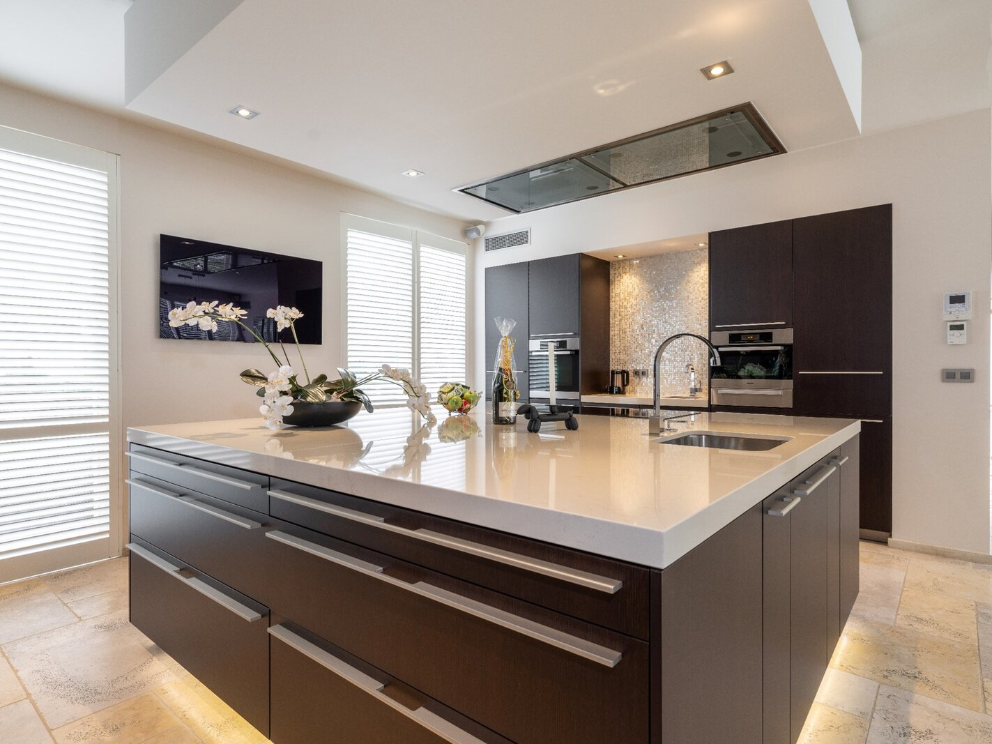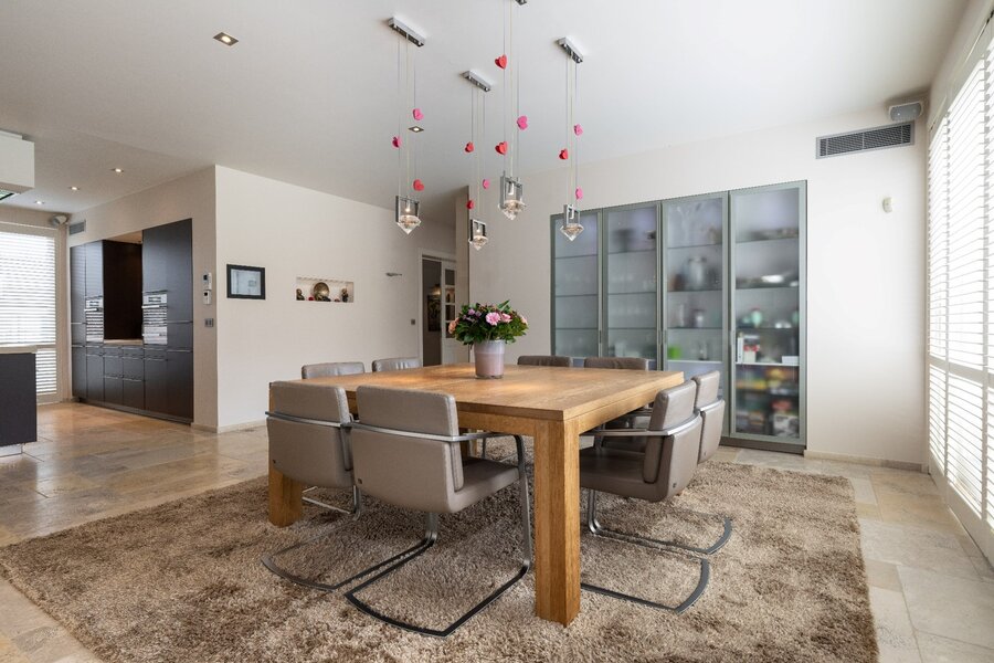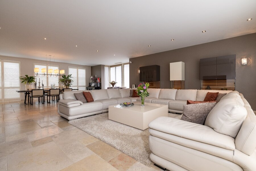 De ruime inkomhal op natuursteen biedt d.m.v. dubbel openslaande glazen deuren toegang tot de prachtige lichte leefruimte van waaruit u een mooi uitzicht heeft op de tuin achteraan. De leefruimte omvat een ruime woonkamer (ca. 100m²) op natuursteen opgedeeld in een gezellig salon met gashaard en een eetkamer, een aparte TV-hoek/kantoor en de schitterende woonkeuken die werkelijk compleet uitgerust is met koelkast, diepvriezer, afwasmachine, 2 heteluchtovens, combi-oven, inductiekookplaat, koffiemachine, 2 bordenverwarmers,... Aansluitende koele berging met ingemaakte kasten voorzien van airco voor koeling.