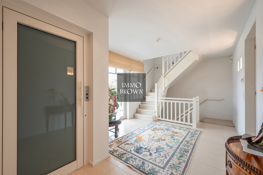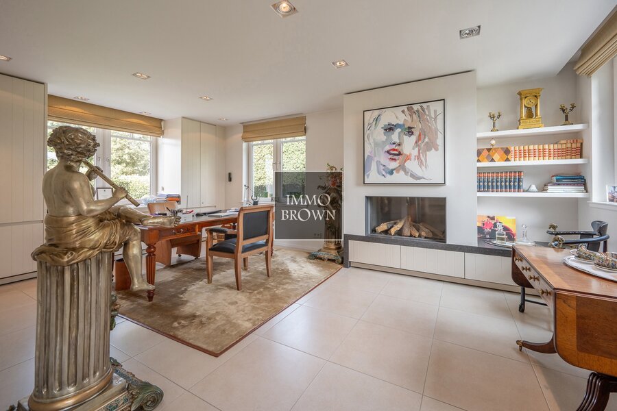 Bij binnenkomst via de stijlvolle inkomhal met vestiaire en gastentoilet, wordt u verwelkomd in een royale, lichtrijke leefruimte. Deze omvat een elegante salon met aansluitende bureauruimte en een eetkamer die rechtstreeks toegang biedt tot het zuidgerichte terras.