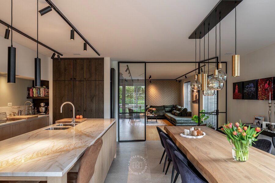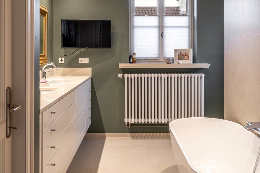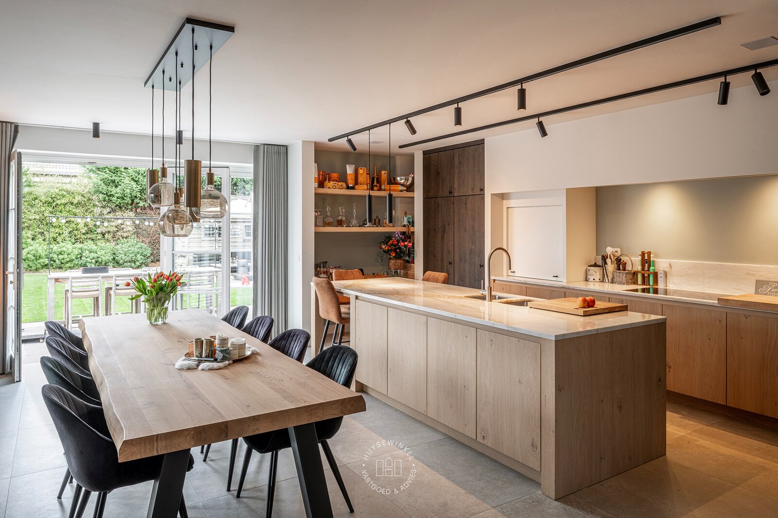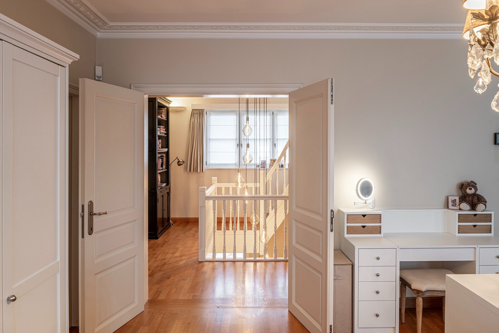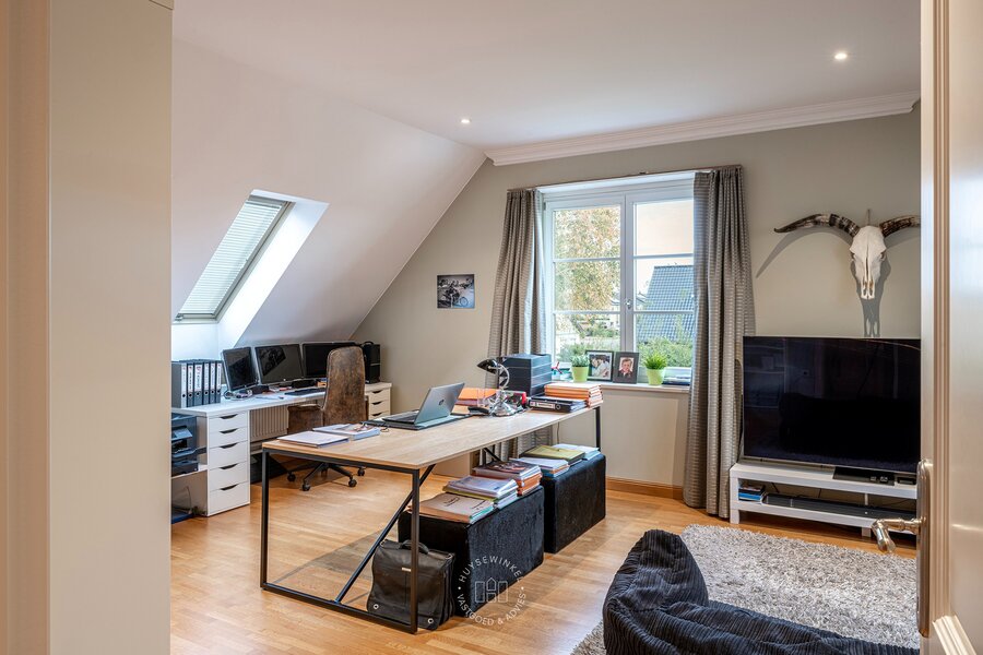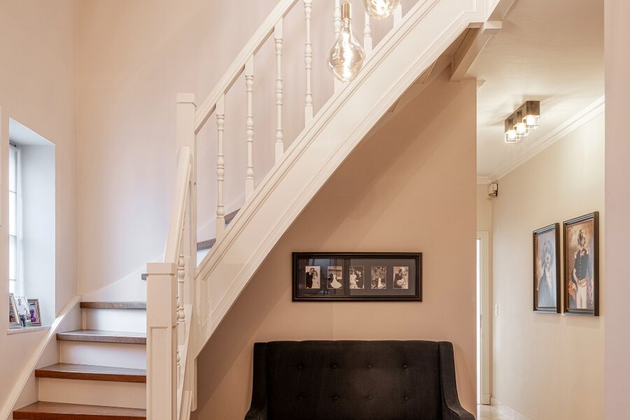 De woning zelf verrast door haar ruimtegevoel en indeling. De open keuken sluit rechtstreeks aan op het terras en de gezellige tuin, een ideale plek om te ontspannen. De lichtrijke leefruimte met gashaard creëert een warme sfeer, terwijl verschillende bergplaatsen en een praktisch bureau het wooncomfort verhogen. Op de eerste verdieping bevinden zich twee zeer ruime slaapkamers en een recent vernieuwde badkamer. De master beschikt over een inloopdressing en make-up gelegenheid. Op het eerste verdiep vinden we ook de zeer praktische wasplaats terug. De tweede verdieping biedt twee extra slaapkamers en een dressing, alsook een tweede badkamer, wat deze woning perfect maakt voor grote gezinnen, gasten of extra bureauruimte. Daarnaast beschikt de woning over een garage met plaats voor twee wagens, aangevuld met diverse opbergmogelijkheden.