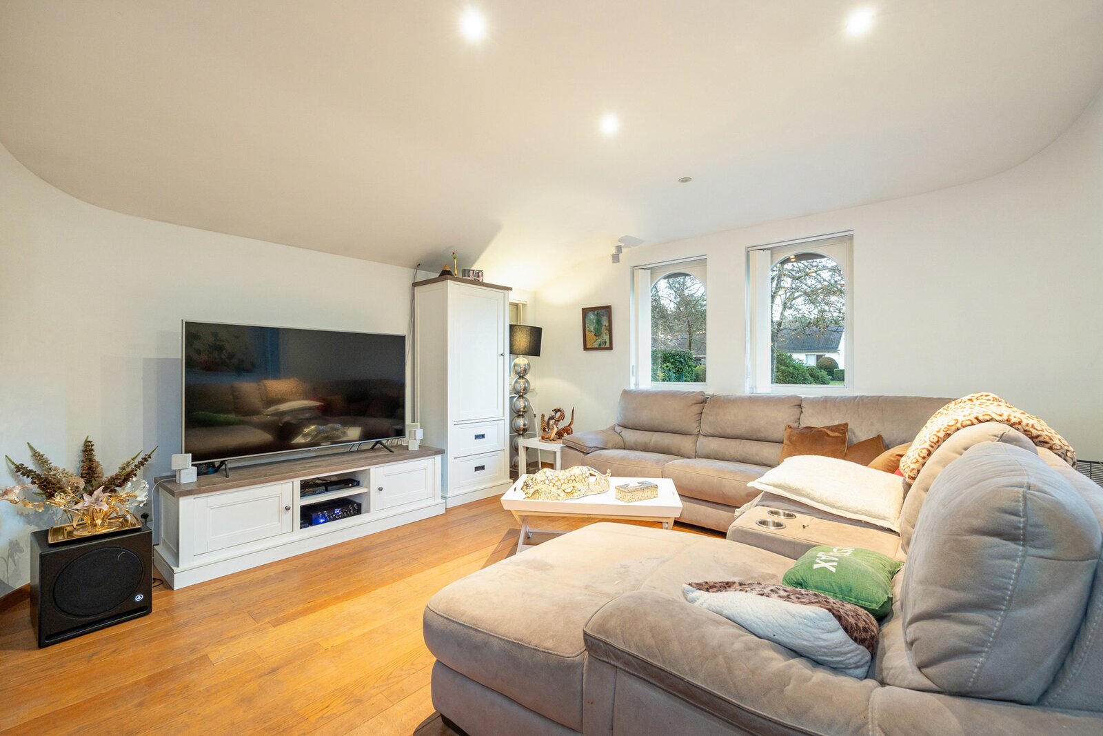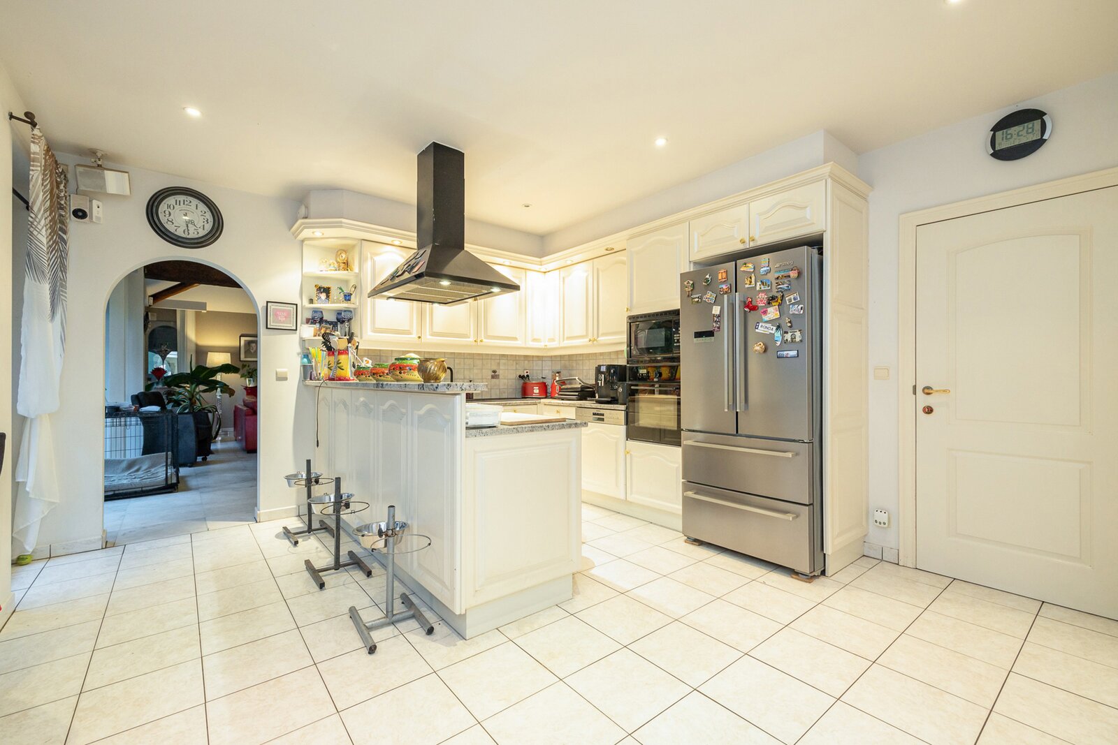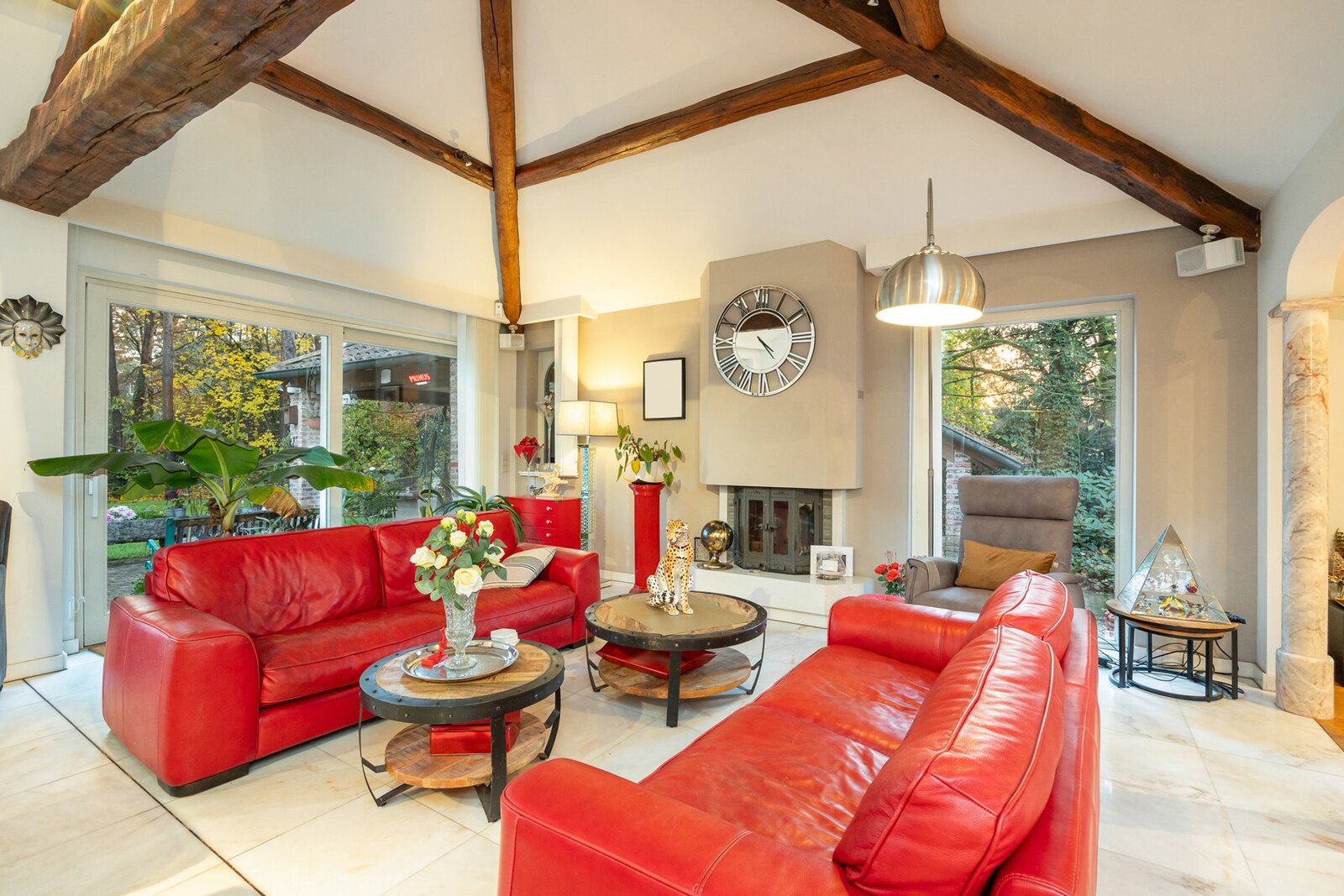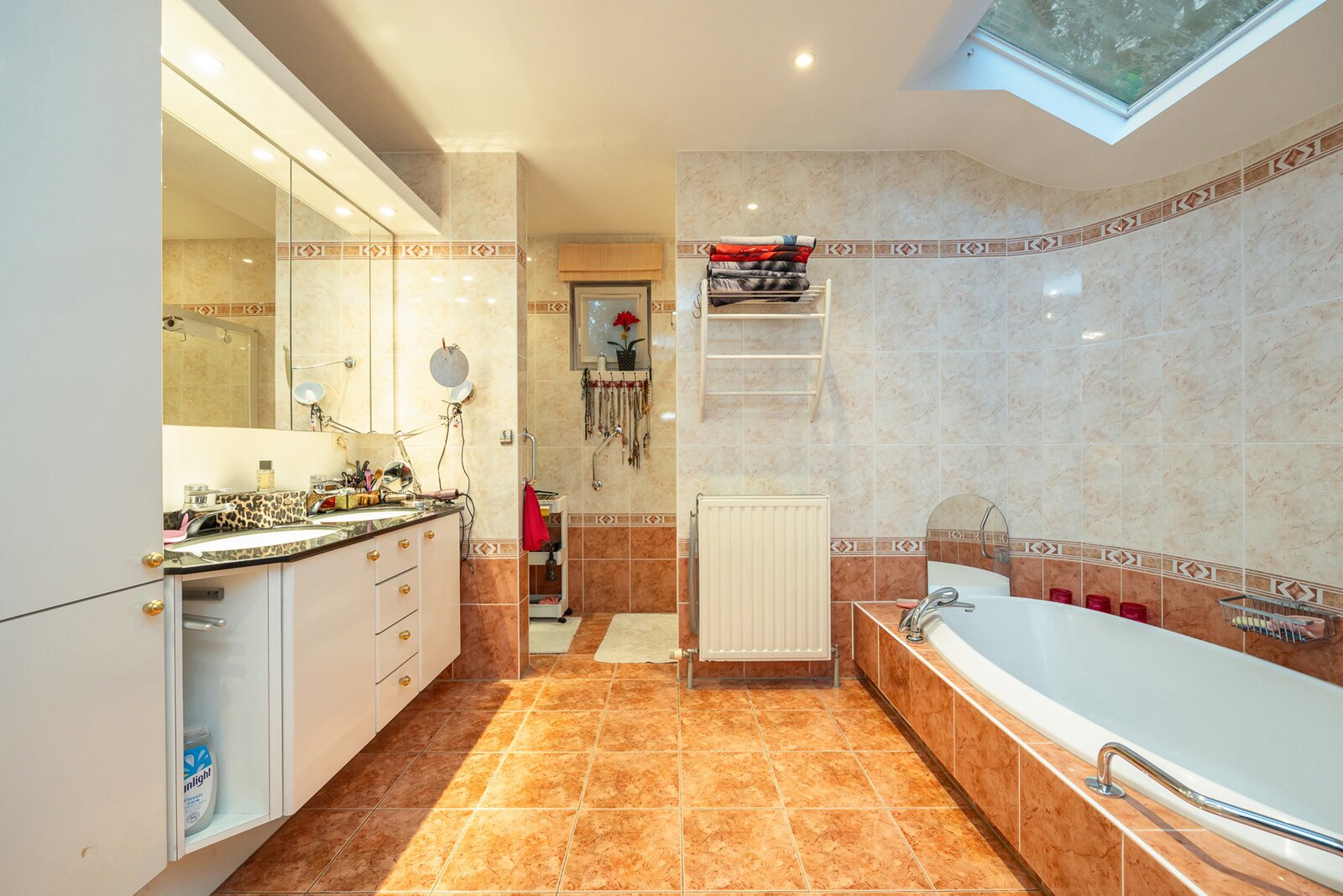 Hoofdslaapkamer met dressing en complete badkamer ensuite. Zeer grote dubbele garage met zolder en grote berging. Buiten een grote tuin met open en overdekte terrassen (één met haard). Tuinberging.