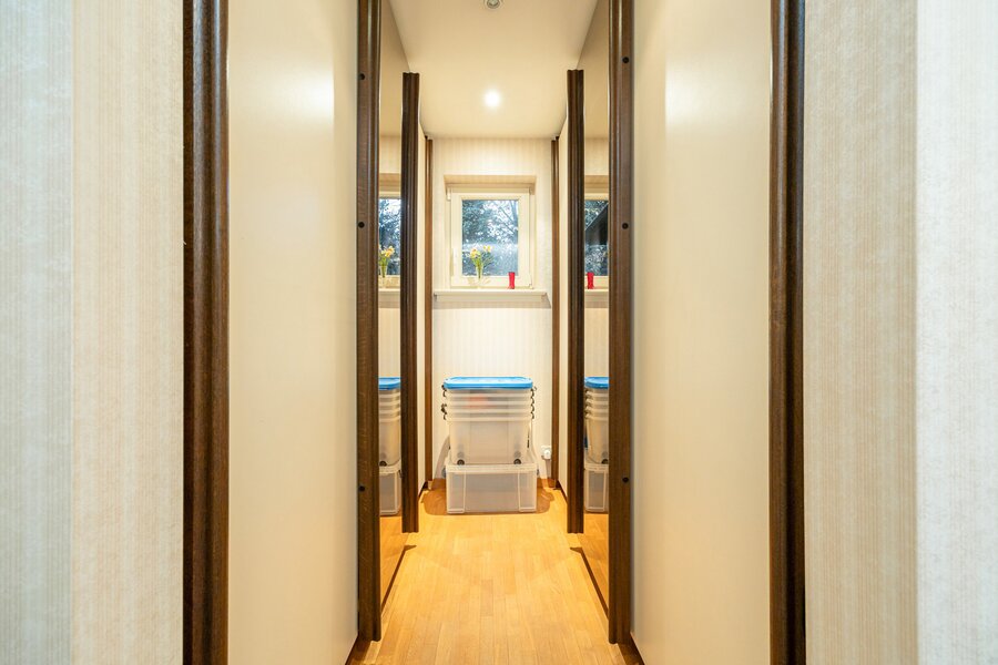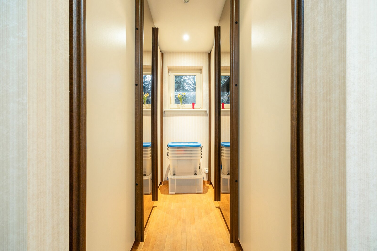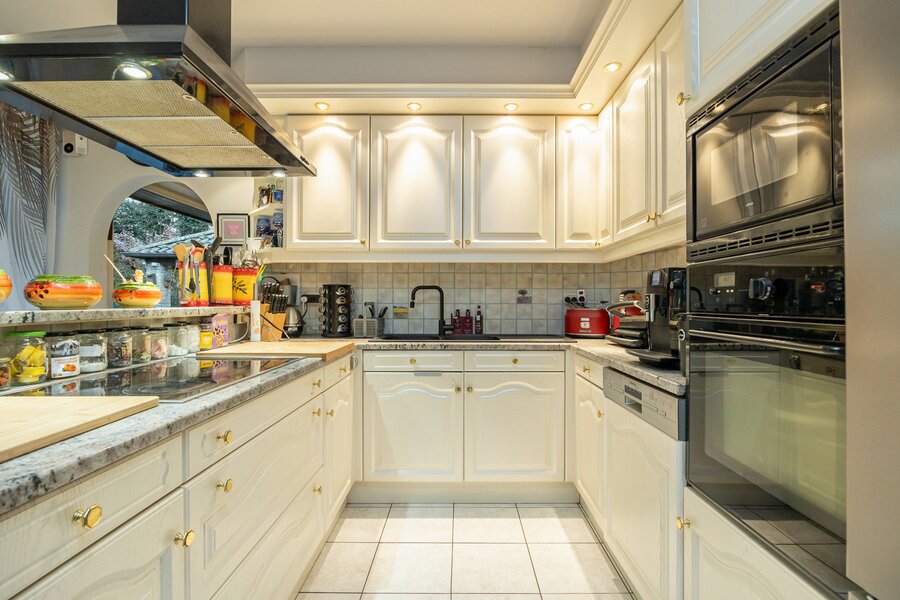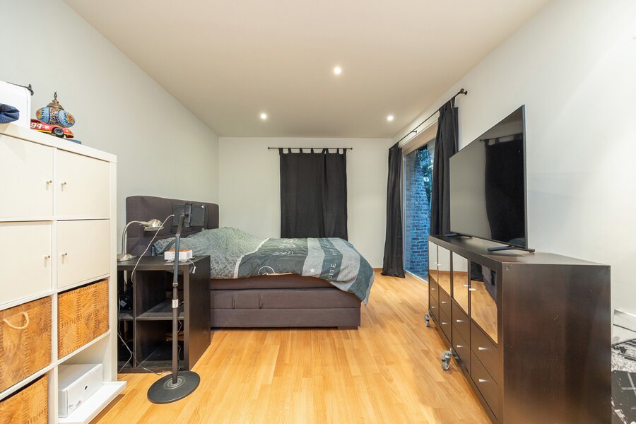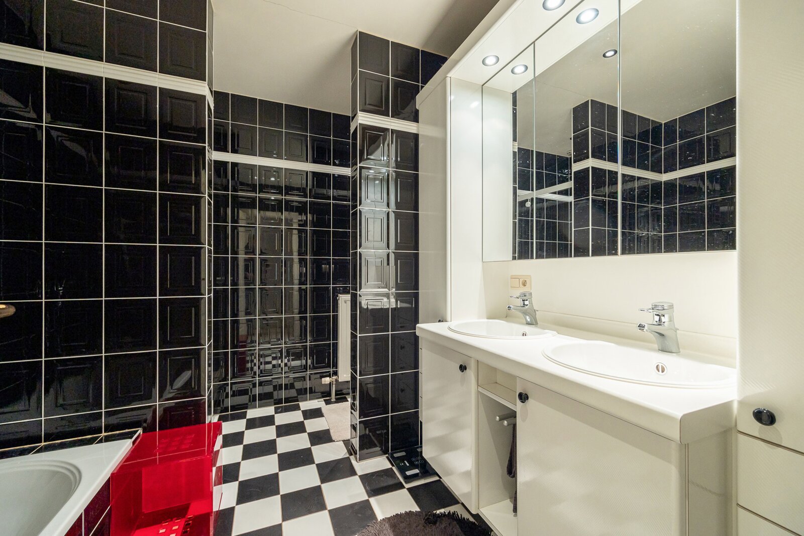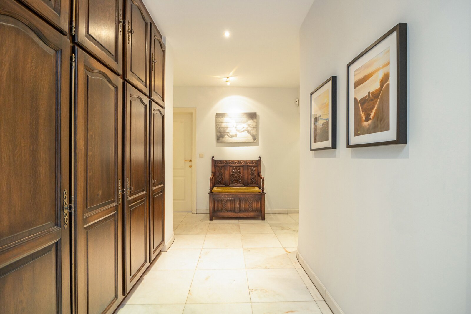 Ruime, lichte woonkamer, open tot in de nok met tv-hoek en bureau. De woonruimte is ruim 80 m² groot. Marmeren vloeren en massieve parketten (vloerverwarming), haardcassette. Ruime, compleet ingerichte woonkeuken met alle apparatuur (kookplaats, afzuigkap, dubbele ijskast en diepvries, vaatwasser, oven en magnetron). Bijkeuken/wasplaats met vaste kasten. Nachthal met inbouwkasten, berging en toegang tot twee ruime slaapkamers en badkamer met ligbad, douche, toilet en dubbele wastafel.