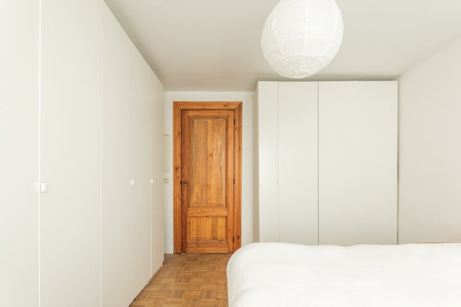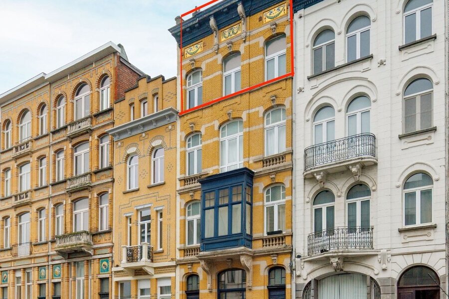 Zo levendig als deze buurt is, zo rustig is het binnen in deze duplex, gelegen op de twee hoogste verdiepingen van een opvallende, eclectische erfgoedwoning uit 1910. De okergele baksteen en diepblauwe erker zijn architecturale blikvangers in het straatbeeld.