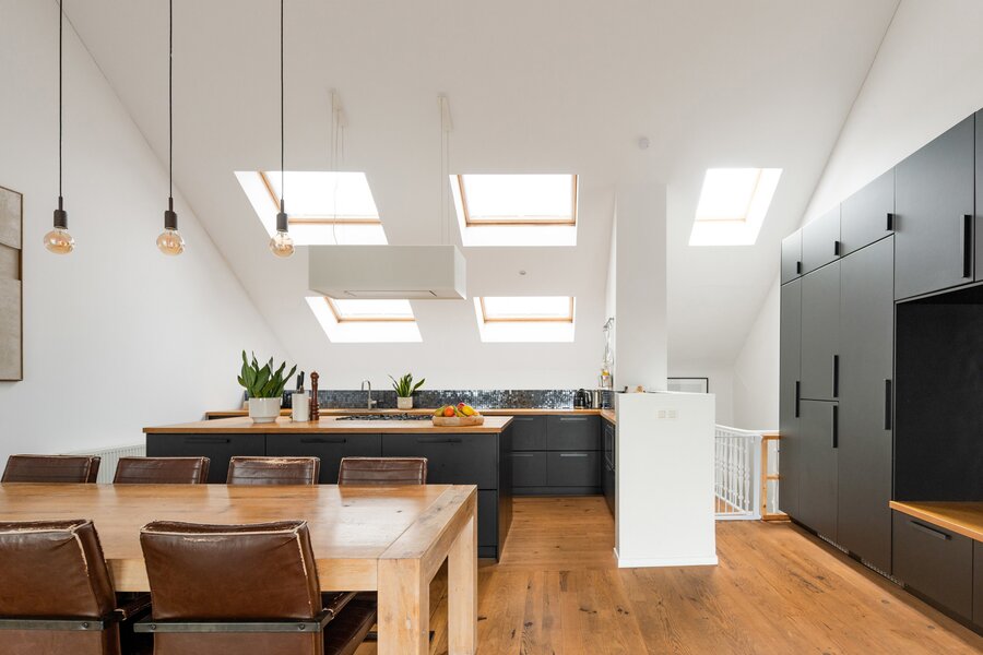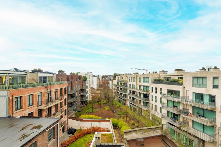 De bovenste etage werd volledig gewijd aan de stijlvolle leefkeuken met ruime opbergmogelijkheden. Hoge plafonds creëren ook hier een groot ruimtegevoel. Het geweldige terras van zo’n 40 m², met zicht op groen en de hele dag zon, maakt deze plek helemaal onweerstaanbaar. Stel je maar eens voor: heerlijk aperitieven met je gasten op het dakterras, vervolgens uitgebreid tafelen in de grote keuken en afsluiten met een digestief in de gezellige living…