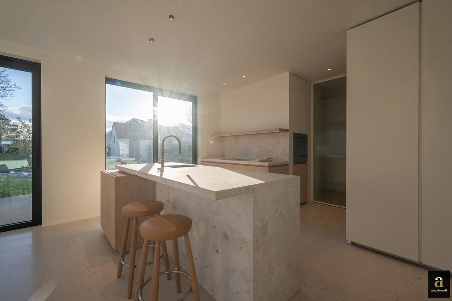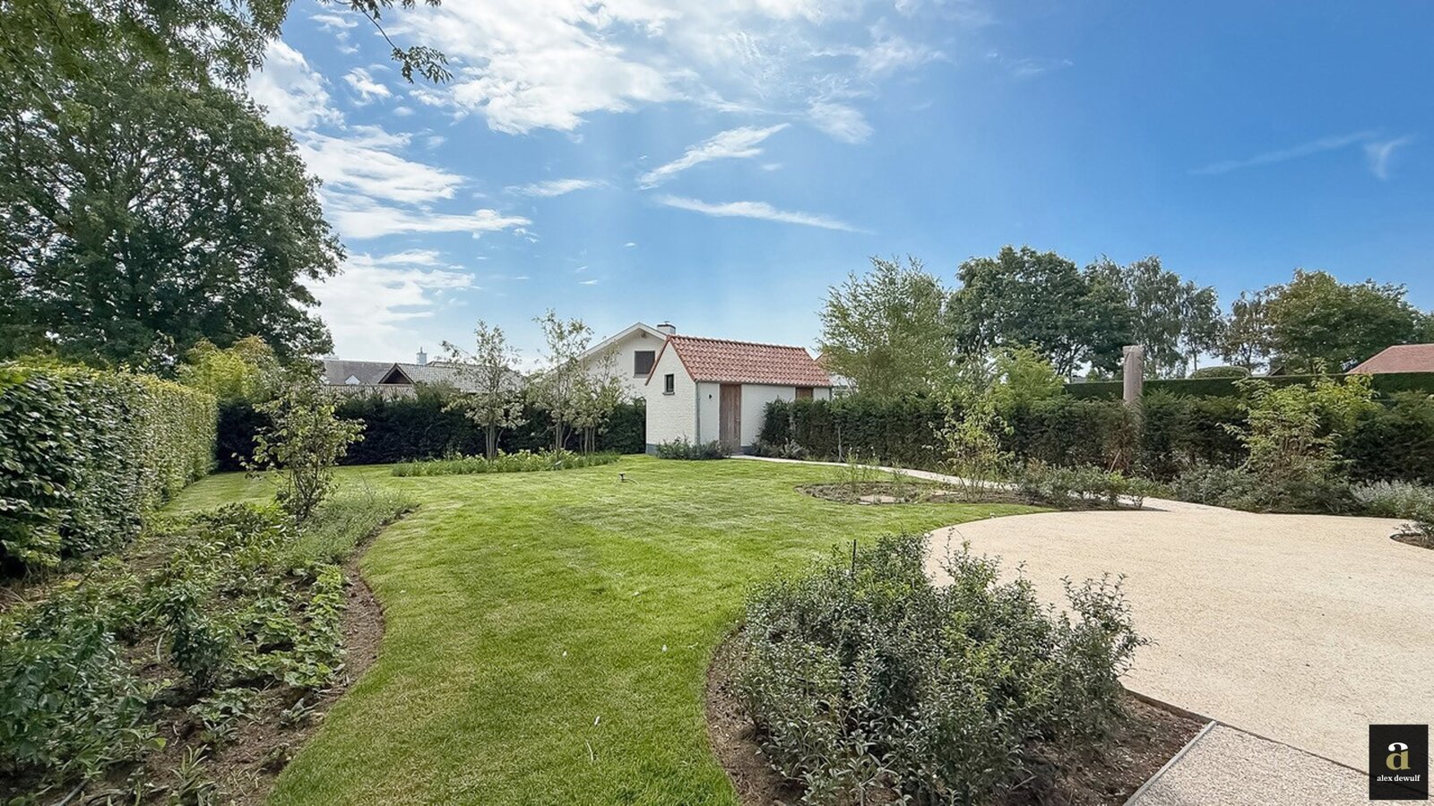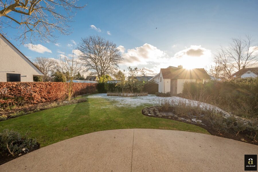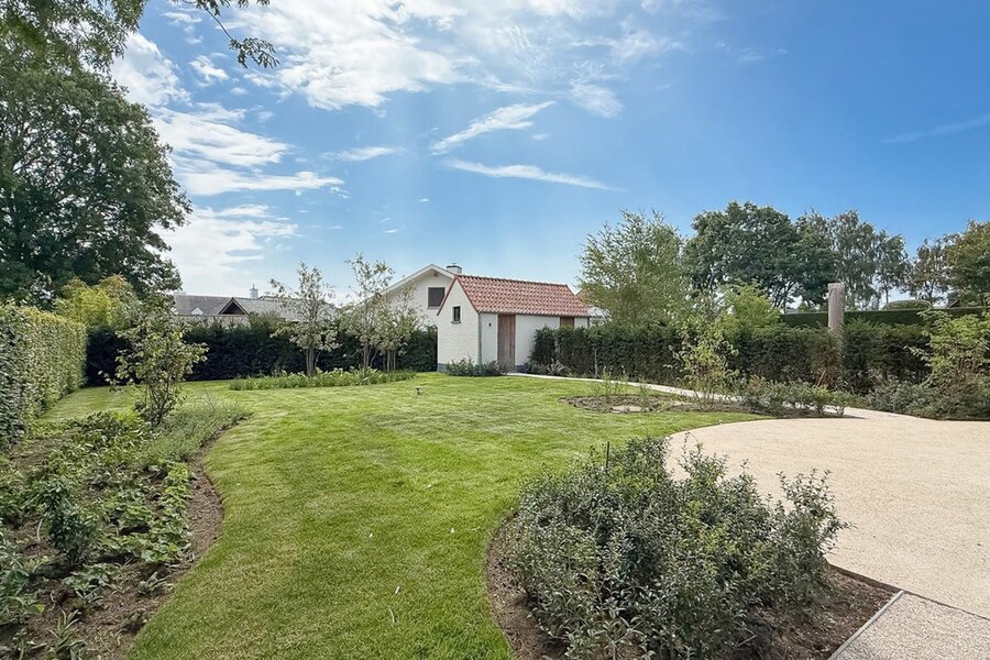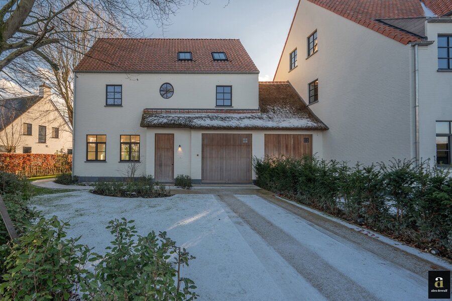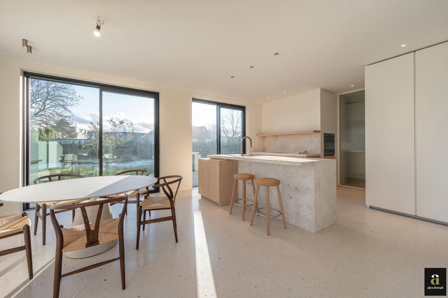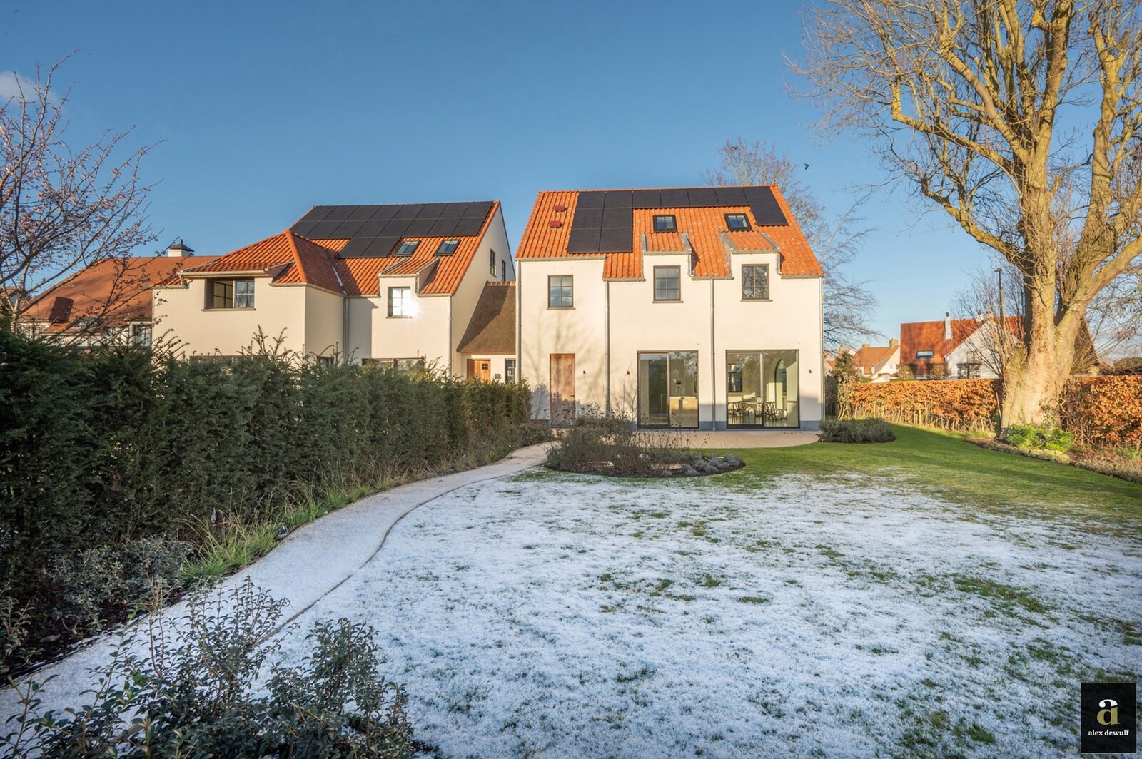 Instapklare nieuwbouwkoppelvilla met vijf slaapkamers te Knokke-Heist aan de polders. Indeling: inkomhal met vestiaire en gastentoilet. De ruime, lichtrijke woon- en eetkamer geeft uit op het zonovergoten terras en de prachtige aangelegde tuin. De moderne open keuken met kookeiland in natuursteen en terrazzo is volledig uitgerust met hoogwaardige V-Zug-toestellen. Praktische bijkeuken/wasruimte. Op de eerste verdieping bevindt zich de master bedroom met dressing en ensuite badkamer voorzien van dubbele lavabo, bad, douche en apart toilet. Daarnaast zijn er twee volwaardige slaapkamers met ingemaakte kasten en aansluitende douchekamer.