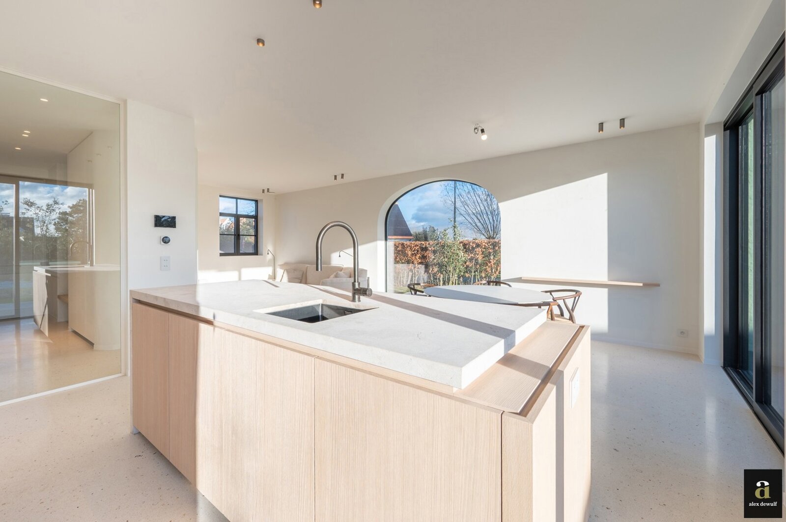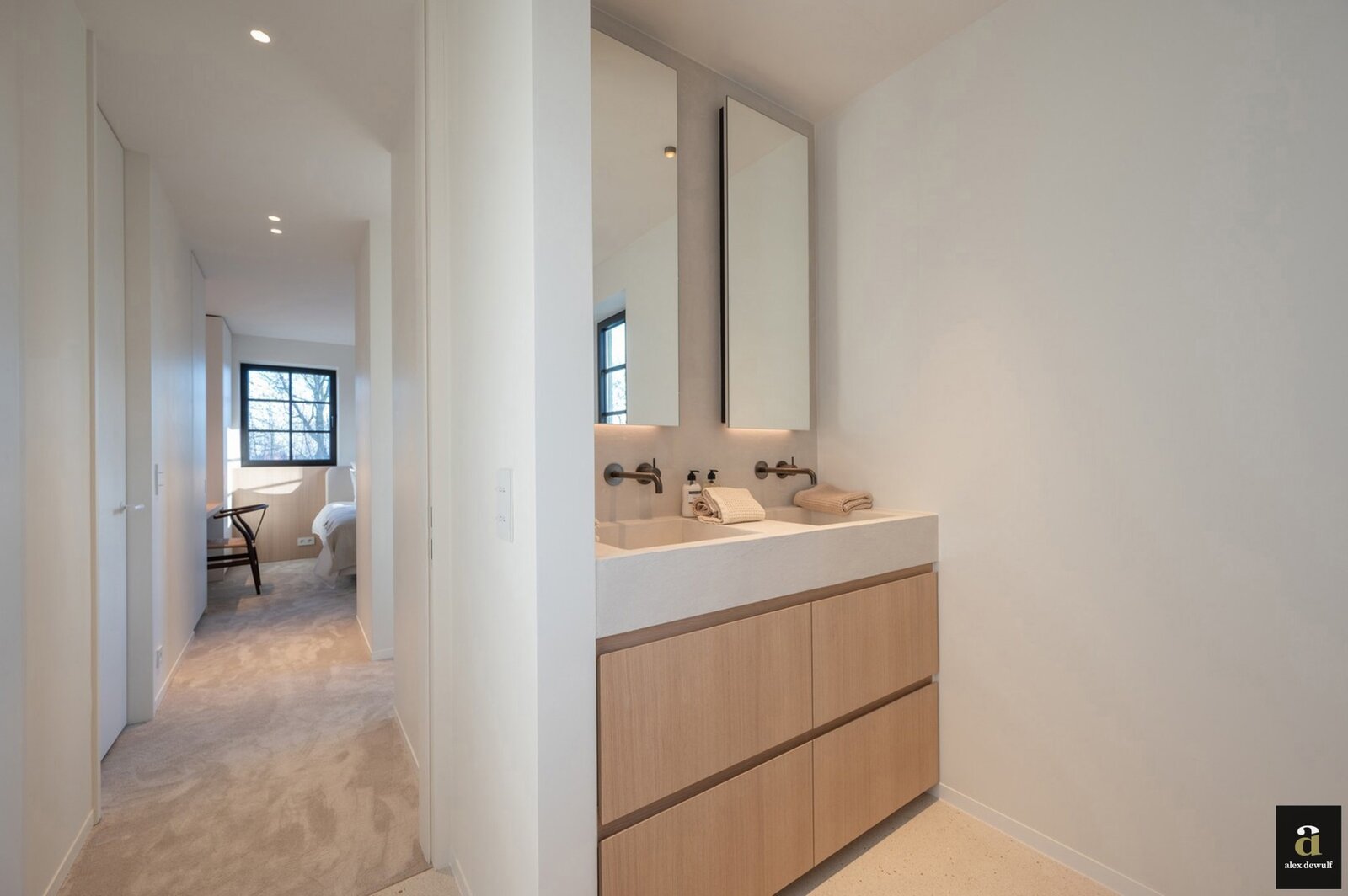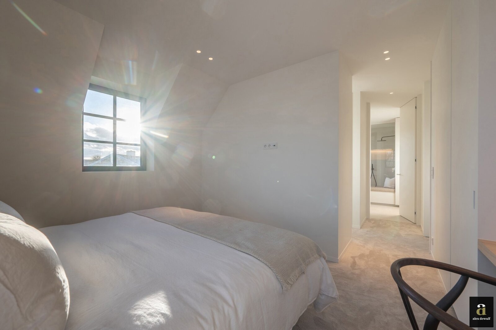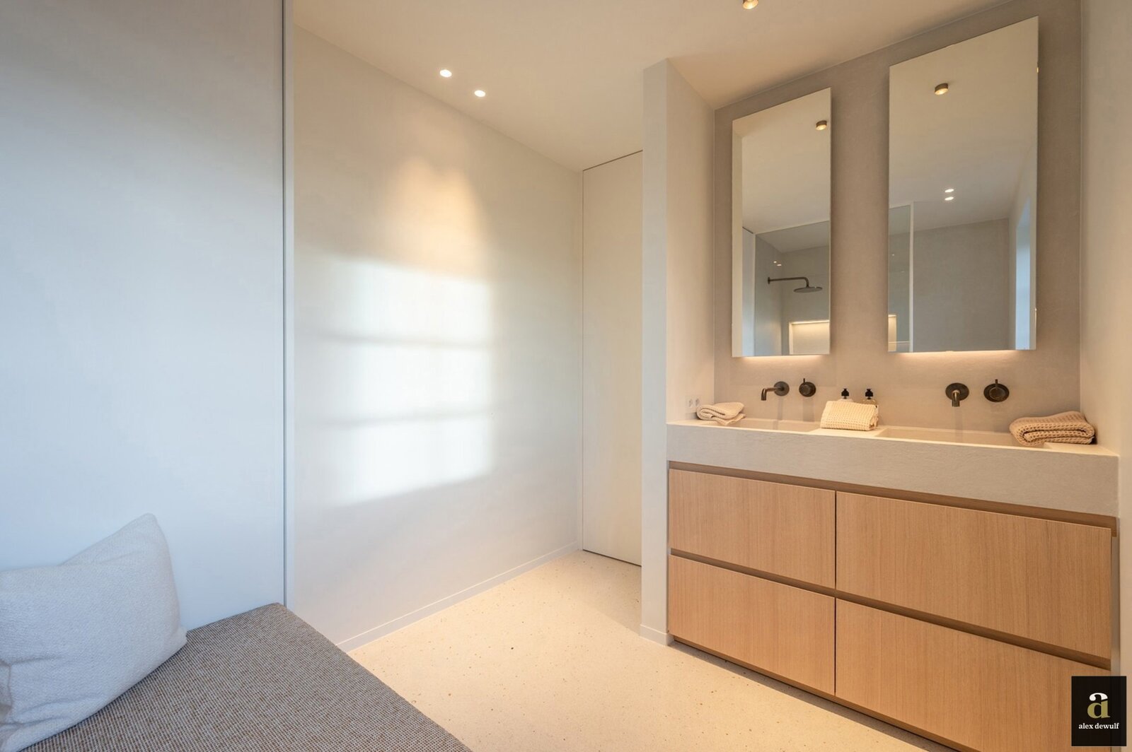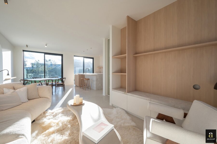 Instapklare nieuwbouwkoppelvilla met vijf slaapkamers te Knokke-Heist aan de polders. Indeling: inkomhal met vestiaire en gastentoilet. De ruime, lichtrijke woon- en eetkamer geeft uit op het zonovergoten terras en de prachtige aangelegde tuin. De moderne open keuken met kookeiland in natuursteen en terrazzo is volledig uitgerust met hoogwaardige V-Zug-toestellen. Praktische bijkeuken/wasruimte. Op de eerste verdieping bevindt zich de master bedroom met dressing en ensuite badkamer voorzien van dubbele lavabo, bad, douche en apart toilet. Daarnaast zijn er twee volwaardige slaapkamers met ingemaakte kasten en aansluitende douchekamer.