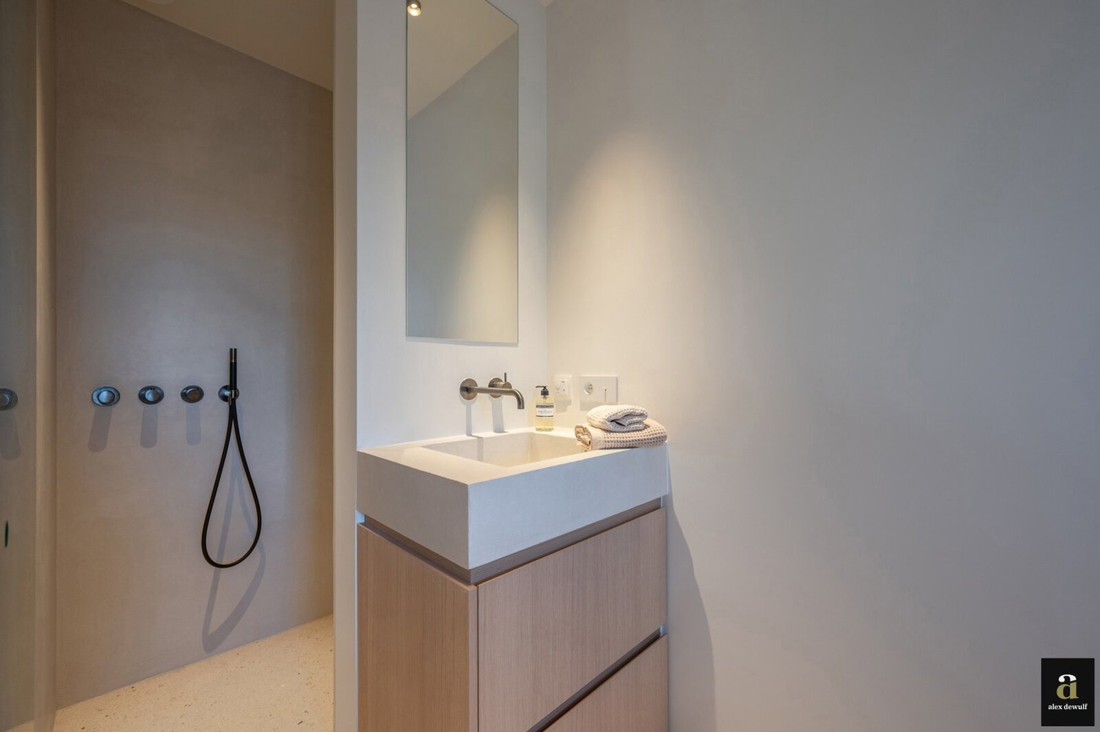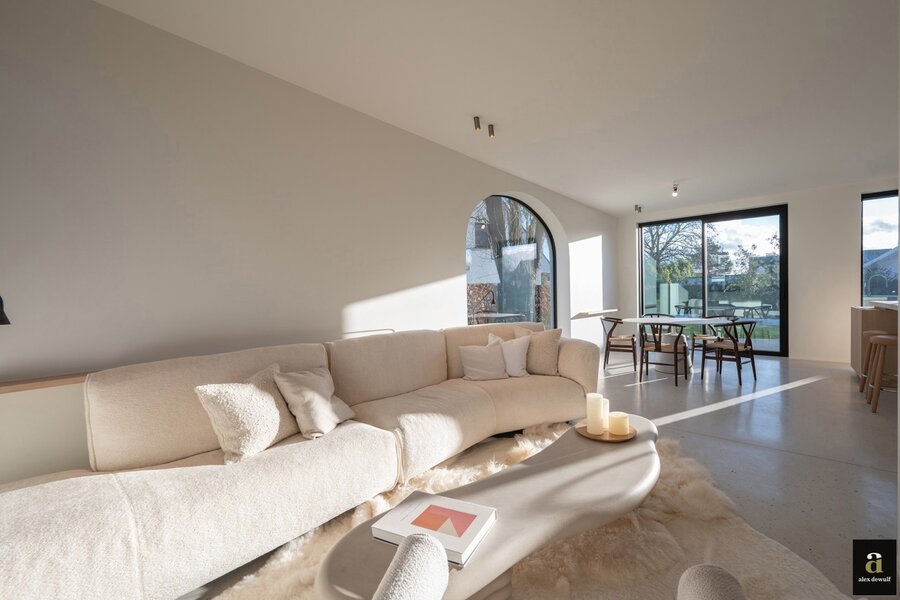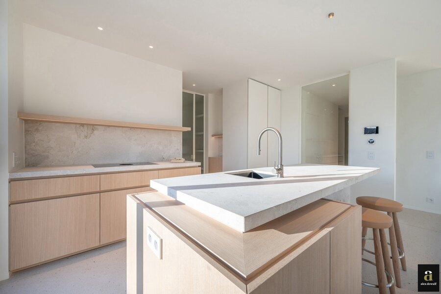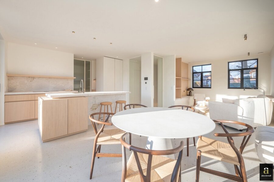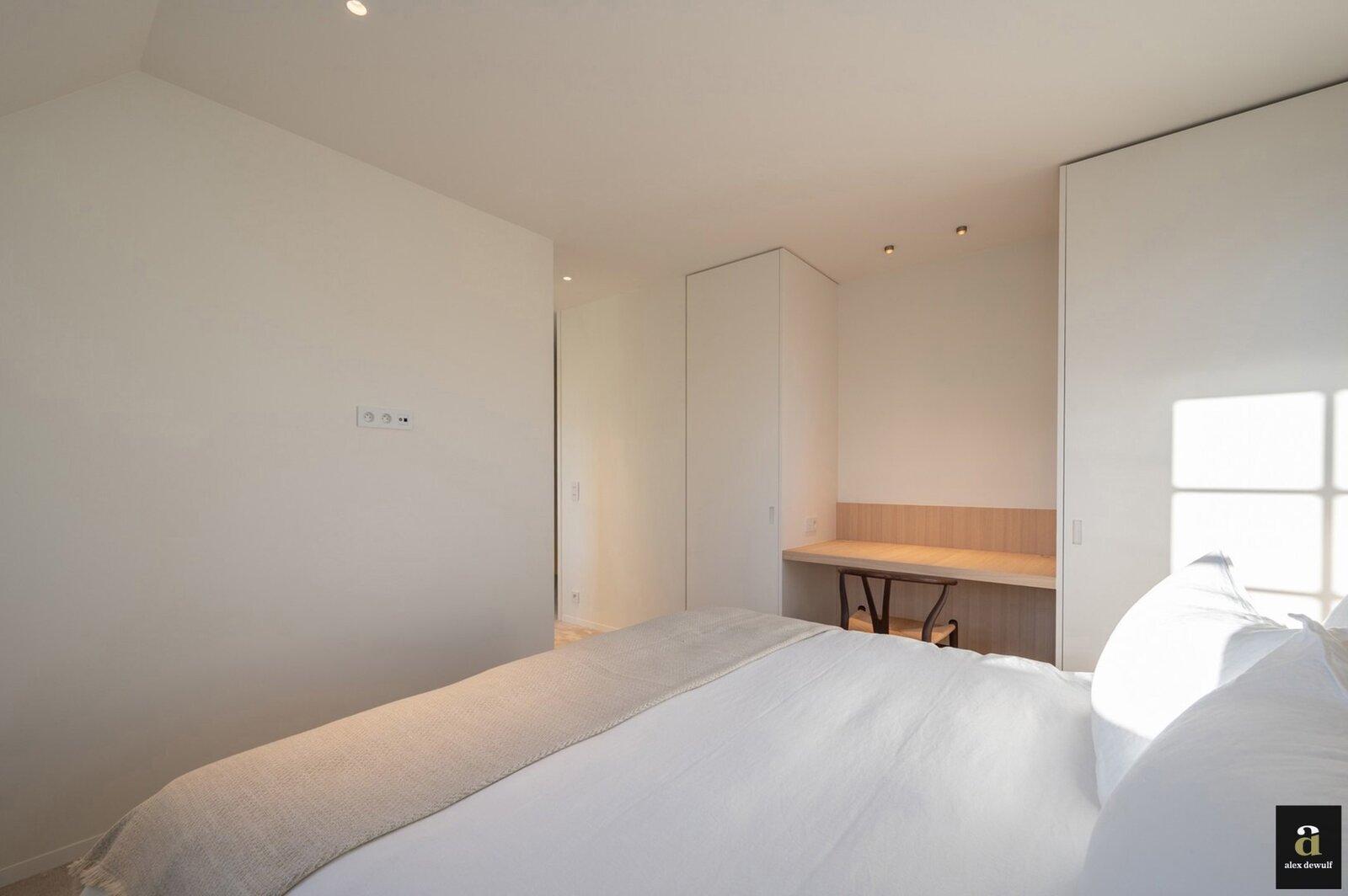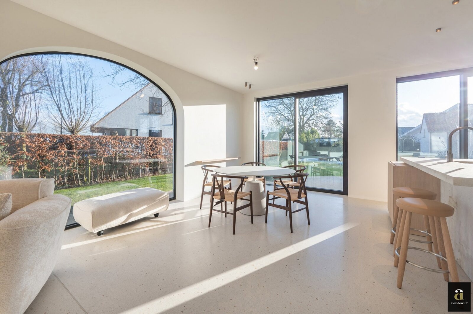 Instapklare nieuwbouwkoppelvilla met vijf slaapkamers te Knokke-Heist aan de polders. Indeling: inkomhal met vestiaire en gastentoilet. De ruime, lichtrijke woon- en eetkamer geeft uit op het zonovergoten terras en de prachtige aangelegde tuin. De moderne open keuken met kookeiland in natuursteen en terrazzo is volledig uitgerust met hoogwaardige V-Zug-toestellen. Praktische bijkeuken/wasruimte. Op de eerste verdieping bevindt zich de master bedroom met dressing en ensuite badkamer voorzien van dubbele lavabo, bad, douche en apart toilet. Daarnaast zijn er twee volwaardige slaapkamers met ingemaakte kasten en aansluitende douchekamer.