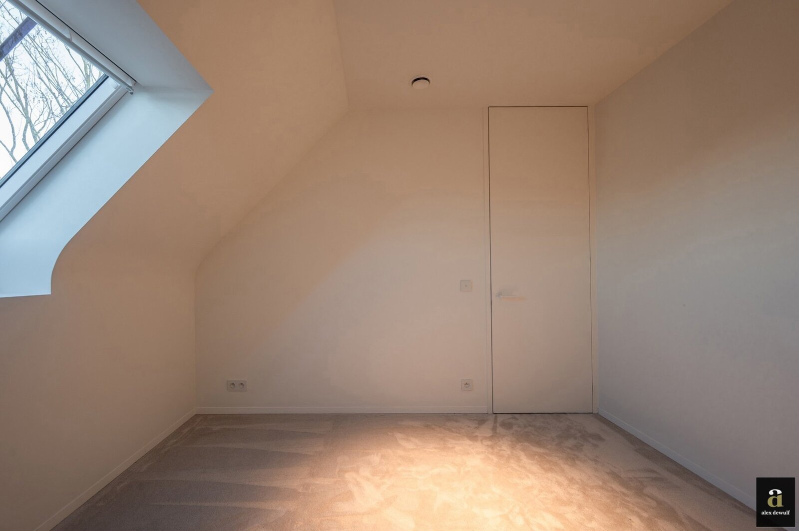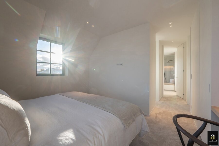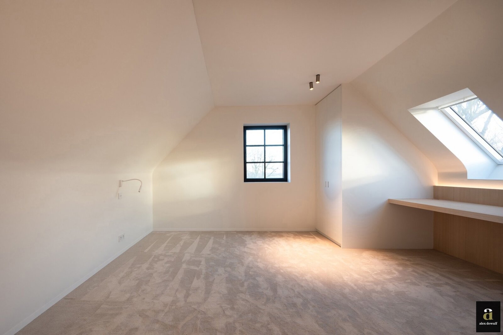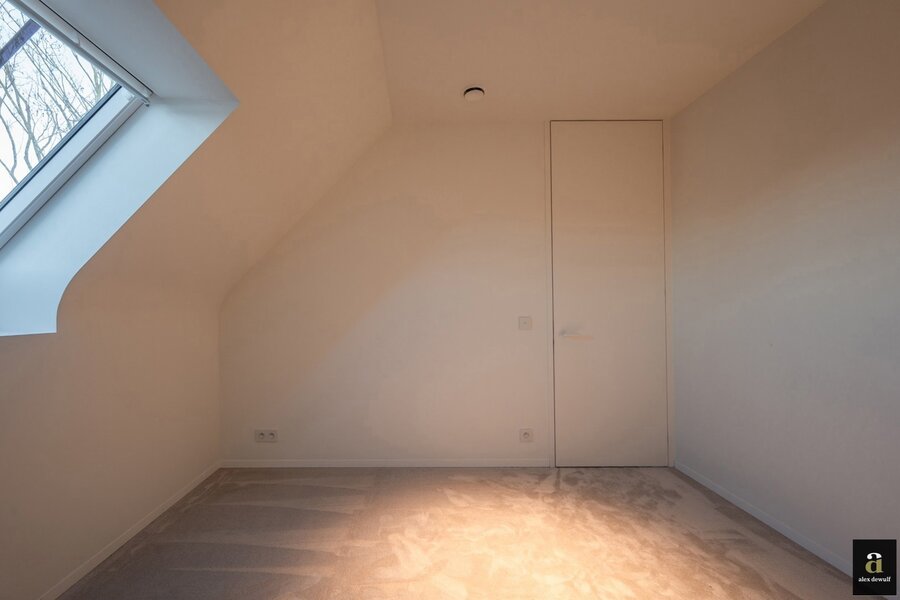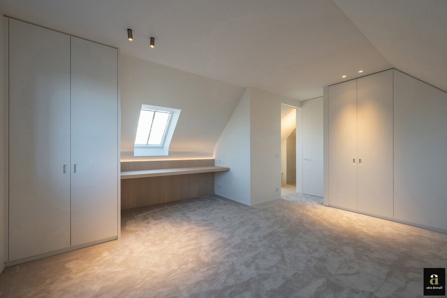De tweede verdieping omvat een vierde slaapkamer met bureau, ingemaakte kasten en eigen douchekamer, evenals een polyvalente ruimte die kan worden ingericht als vijfde slaapkamer, hobbyruimte,.... De woning beschikt over een inpandige garage en twee parkeerplaatsen. De villa werd afgewerkt met hoogwaardige materialen. Deze prachtige nieuwbouw koppelvilla wordt verkocht onder registratierechten.