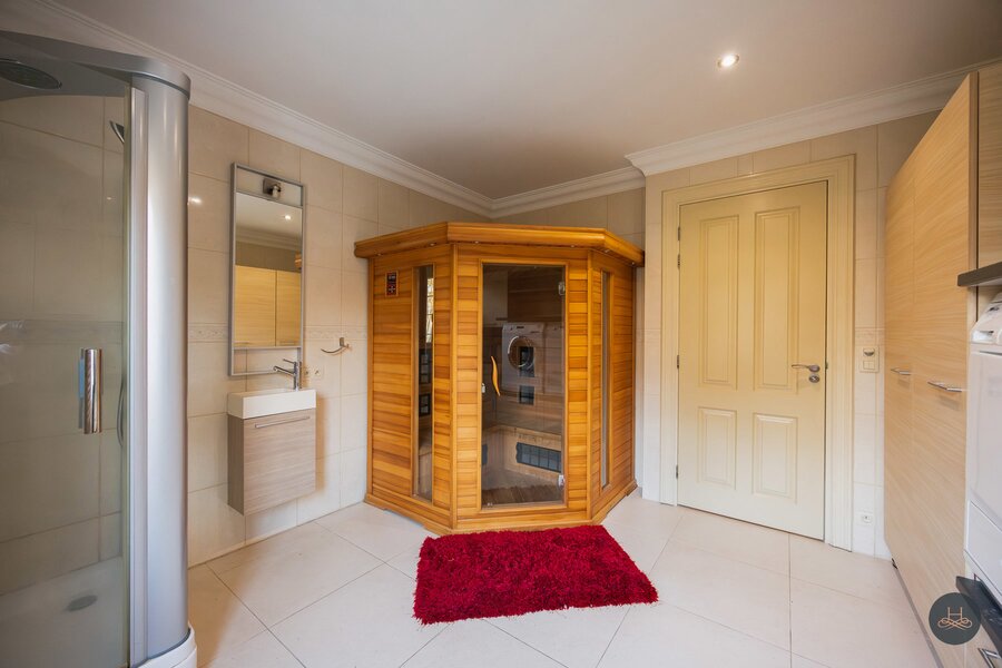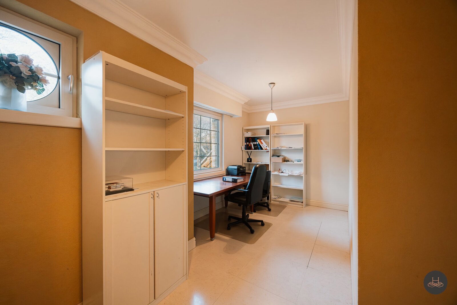 Naast de luxueuze leefruimte bevindt zich een veelzijdige ontspanningsruimte met gashaard, die ideaal dienst kan doen als open kantoor, creatieve studio, leeshoek of lounge-bar. De flexibele indeling maakt deze prachtige villa uitermate geschikt voor wie een praktijkruimte aan huis zoekt of wie droomt van een kangoeroewoning waarbij privacy en verbondenheid perfect in balans zijn. De leefruimtes baden in het licht en bieden vanuit elke hoek uitzicht op het omliggende groen, wat de villa een warme, uitnodigende en tegelijk modern verfijnde uitstraling geeft.