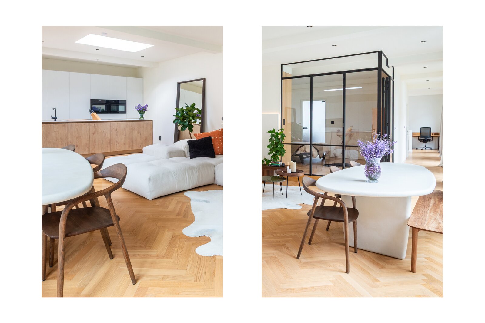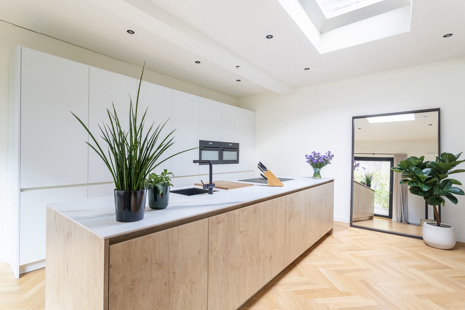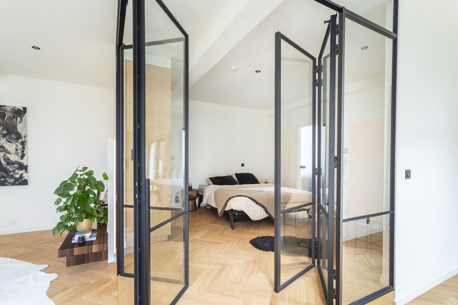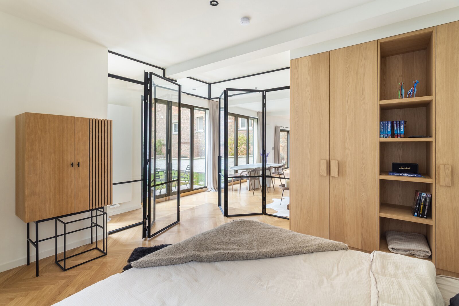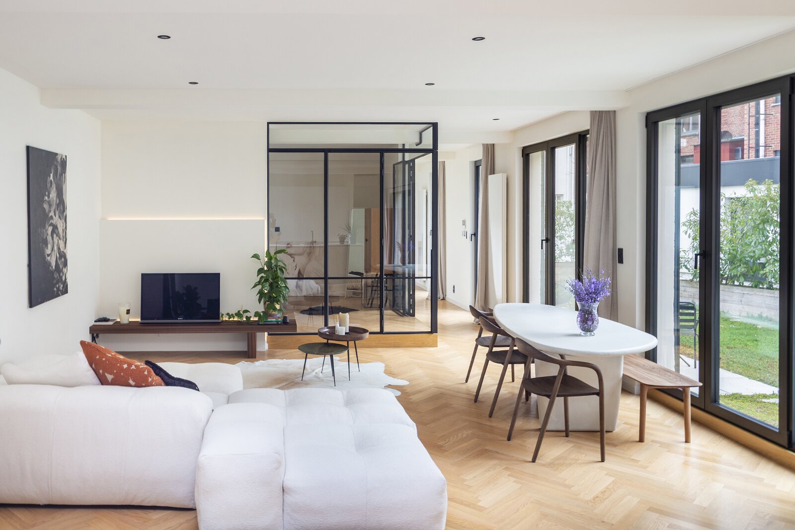 De ruime leefruimte baadt in natuurlijk licht dankzij de grote raampartijen, wat een warme en uitnodigende sfeer creëert. De elegante parketvloer geeft een tijdloos karakter en benadrukt de hoogwaardige afwerking. De royale open keuken, uitgerust met een kookeiland en kwalitatieve inbouwtoestellen, combineert functionaliteit met stijl en nodigt uit tot comfortabel koken. Vanuit de keuken en de leefruimte geniet u van een prachtig uitzicht op het ruime terras en het groene dak, wat de verbinding met de buitenruimte extra versterkt. Een echte blikvanger is de halfopen slaapkamer met smeedijzeren deuren, die een charmante en karaktervolle toets toevoegt. Daarnaast beschikt de woning over een ruime badkamer met dubbele lavabo en inloopdouche, waardoor comfort en luxe perfect samenkomen.