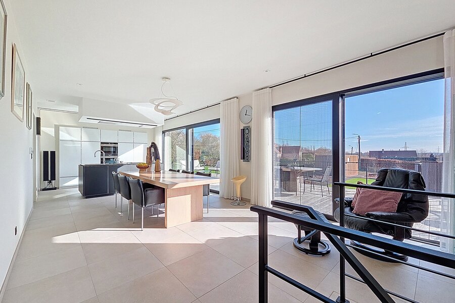 De leefverdieping (1ste verd) baadt in natuurlijk licht en biedt een harmonie tussen openheid en geborgenheid. Salon en eetkamer vloeien subtiel in elkaar over en kijken uit op het terras en de aangelegde tuin.