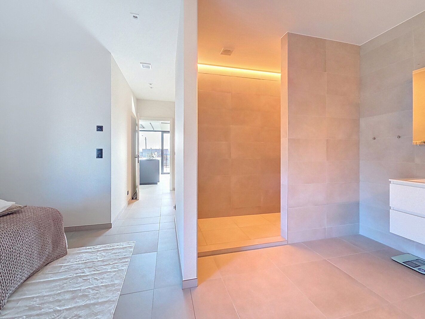 De master suite beschikt over een eigen dressing en privé douchekamer, een discrete cocon binnen het geheel.