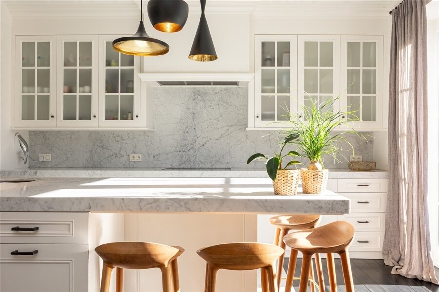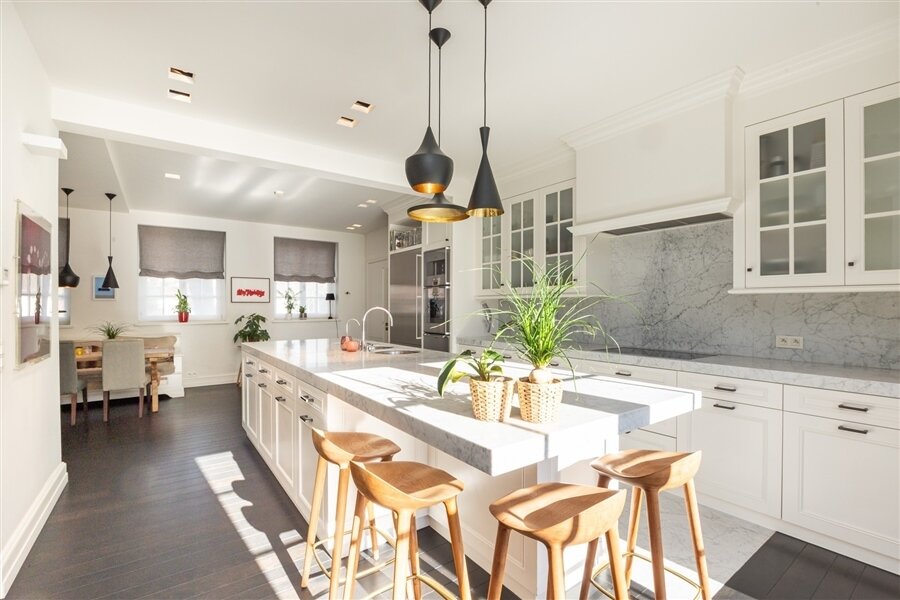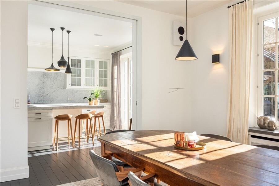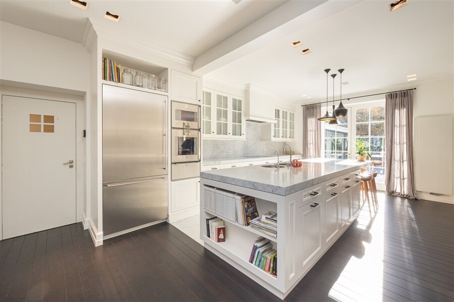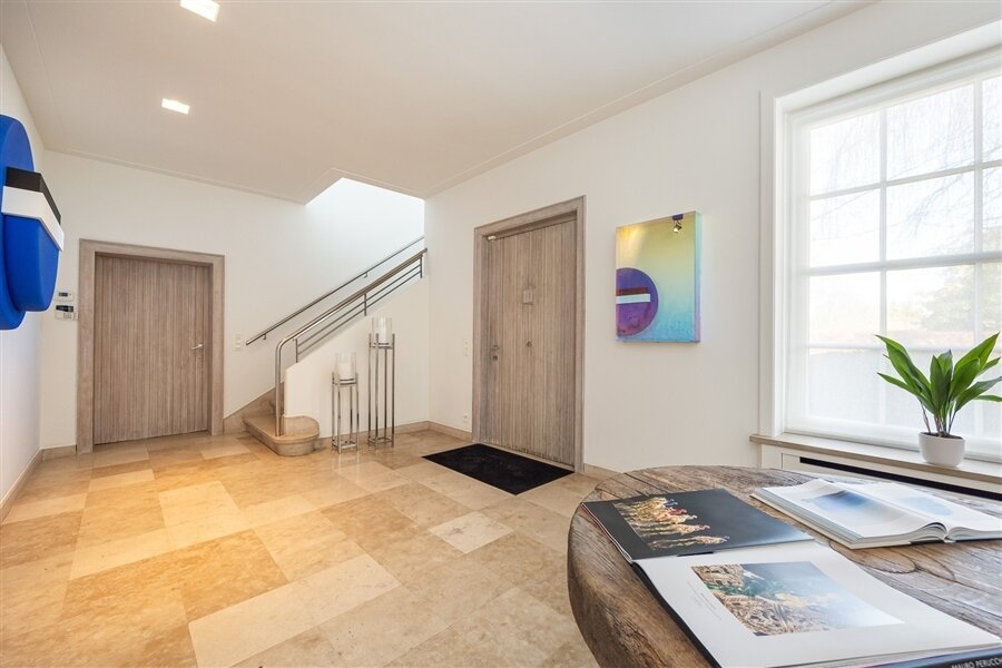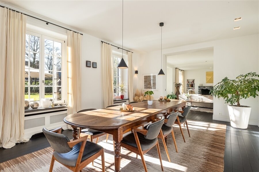 Luxueuze leefkeuken met Gaggenau-toestellen, Carrara marmeren werkbladen, coffee corner en gezellige eethoek. Aansluitend eetkamer. Alle leefruimtes bieden een prachtig zicht op de tuin en toegang tot het terras. Tv-kamer met ingemaakte bibliotheek.
