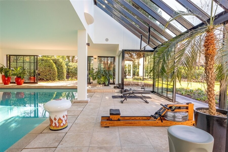 Exclusieve wellness met indoor zwembad (16 x 6), KLAFS sanarium, buitendouche, fitnesshoek en lounge. Aparte douche- en kleedkamer met toilet.