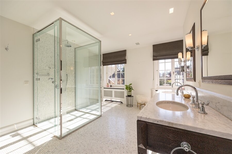 Verder: dubbele garage, oprit, dienstingang, wasruimte en ruime kelder met wijnkelder en technische ruimtes.