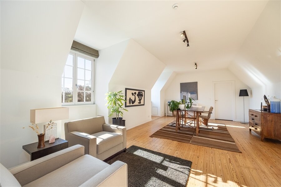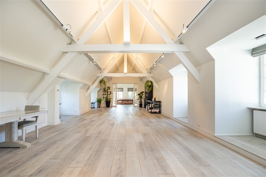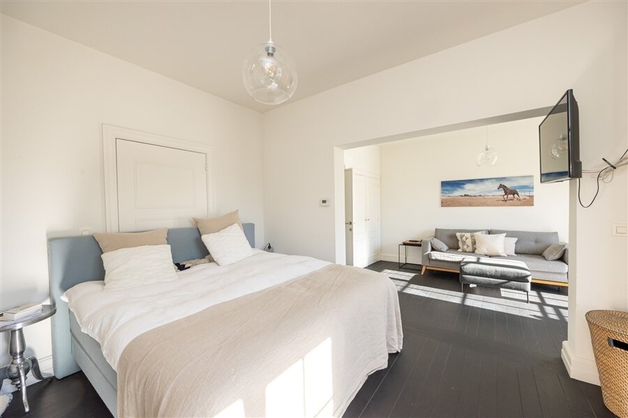 Masterbedroom met ingemaakte kasten, dressing en luxueuze badkamer. Slaapkamer 2 met eigen badkamer. Slaapkamer 3 met bureau, zithoek en terras. Extra badkamer en slaapkamer 4 (momenteel dressing). Grote polyvalente ruimte van ca. 100 m², ideaal als cinema, fitness, yoga- of speelruimte.