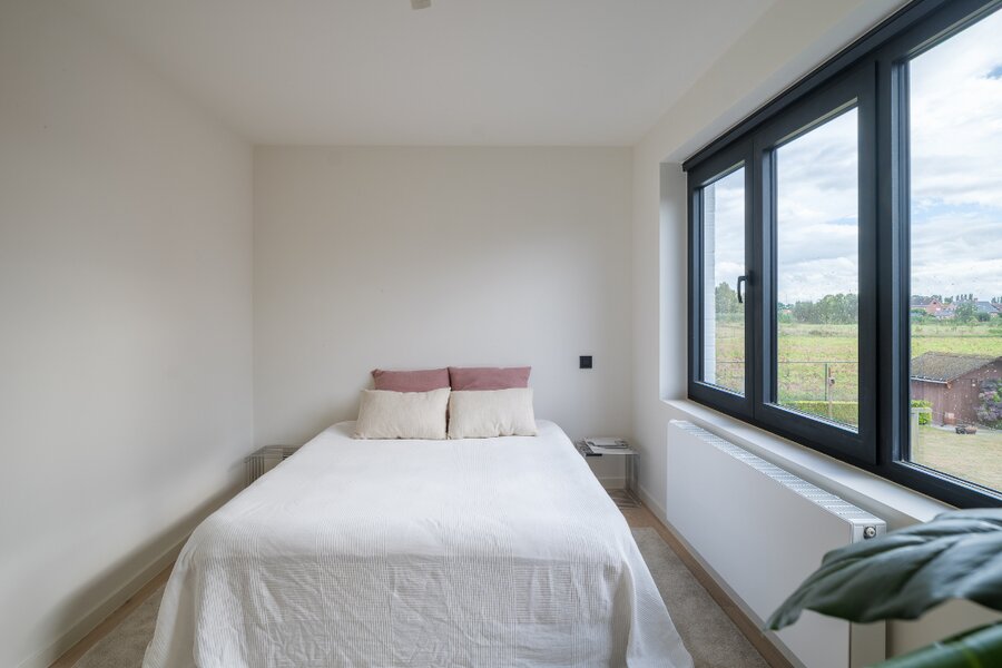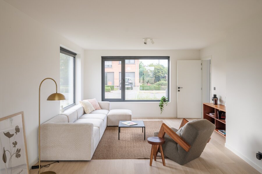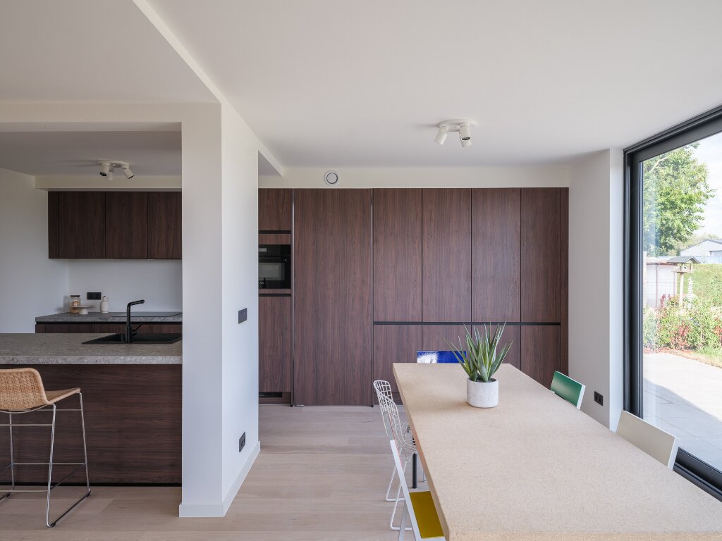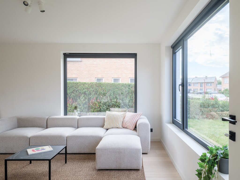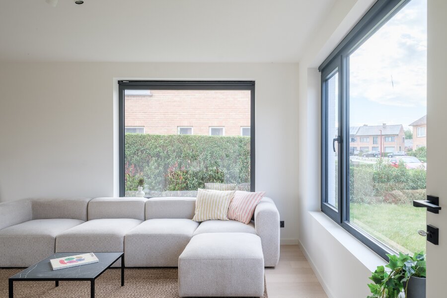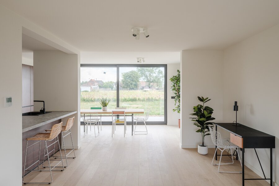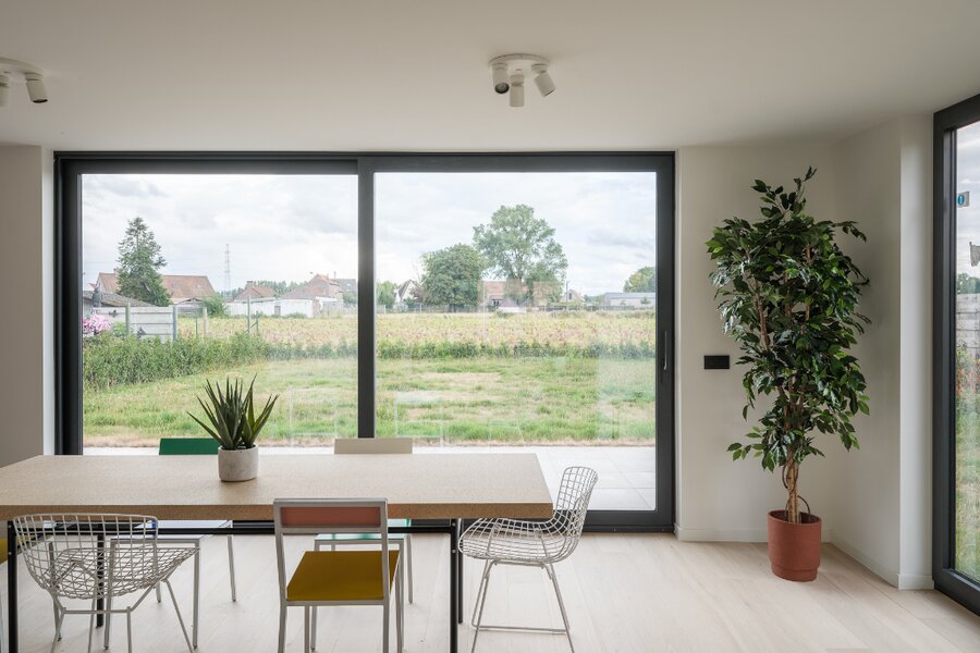 De grote raampartijen zorgen voor een overvloed aan natuurlijk licht en bieden een prachtig uitzicht op de zuidgerichte tuin met achterliggende velden.