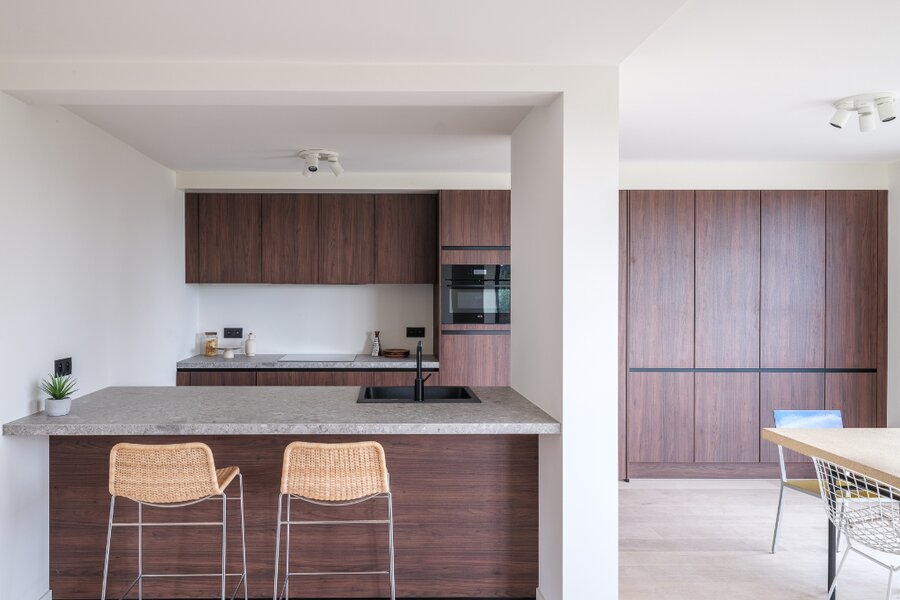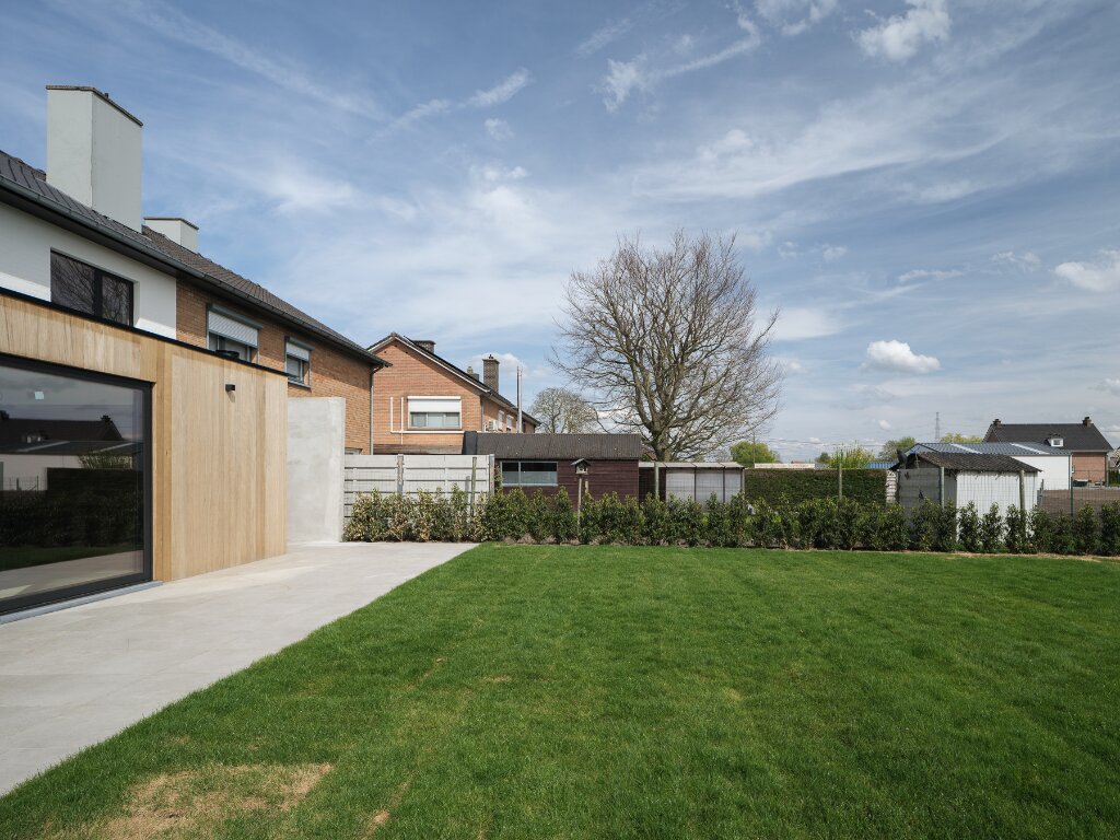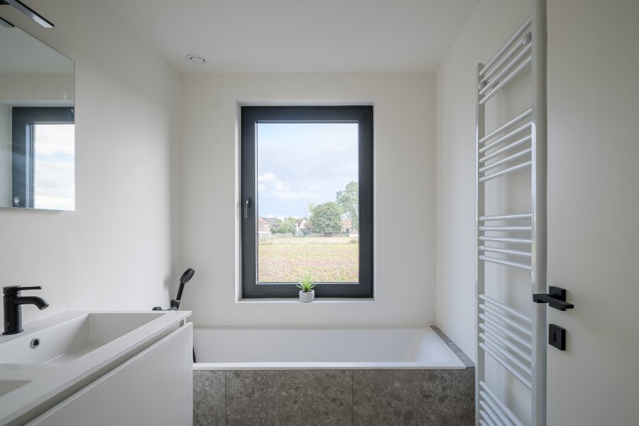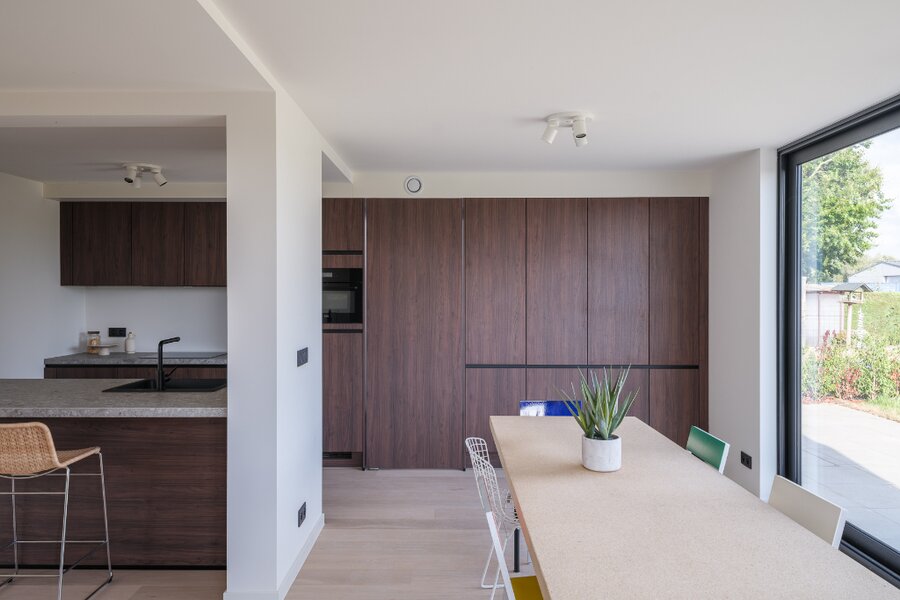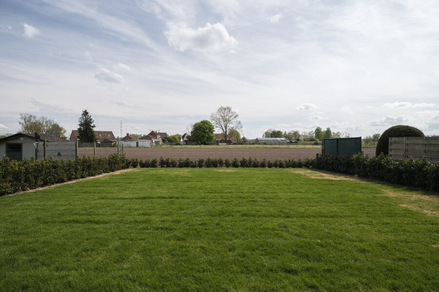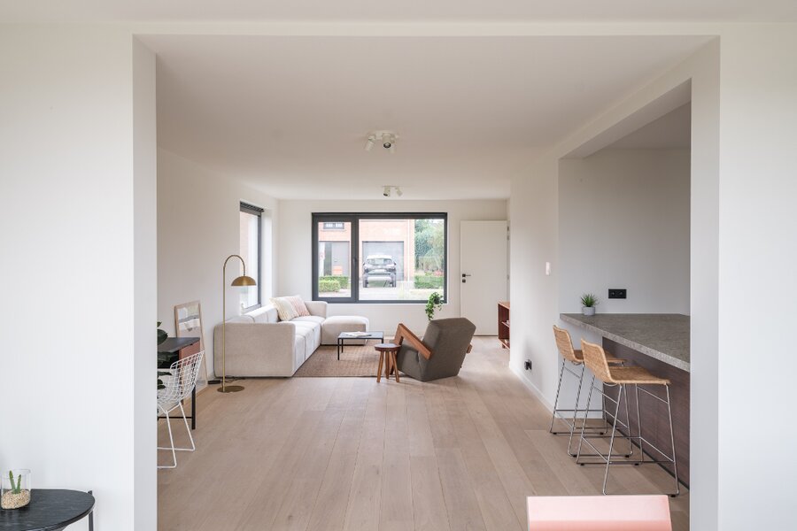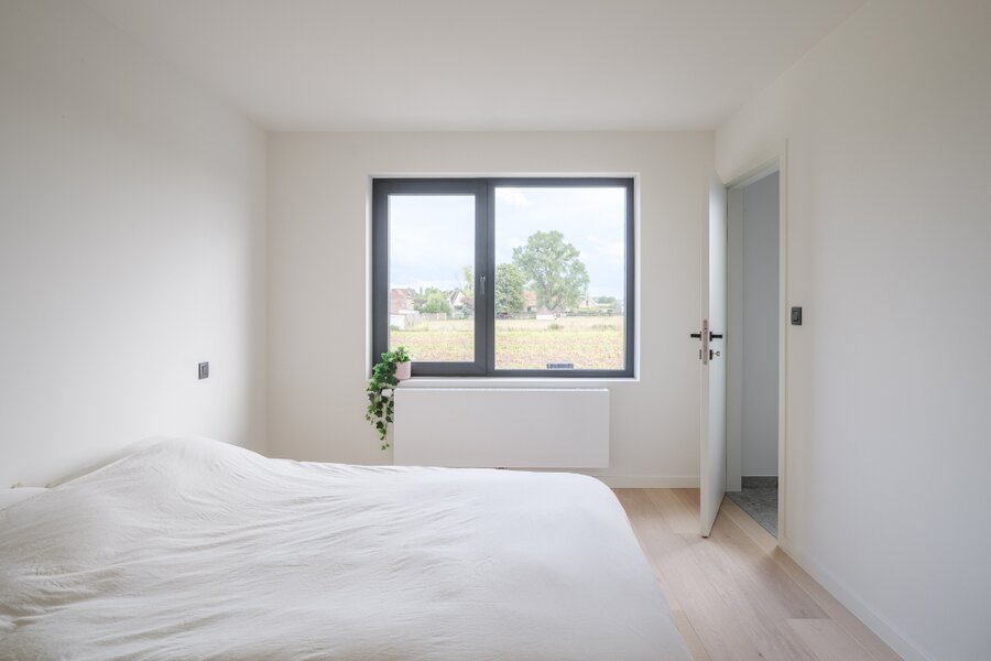 De grote raampartijen zorgen voor een overvloed aan natuurlijk licht en bieden een prachtig uitzicht op de zuidgerichte tuin met achterliggende velden.