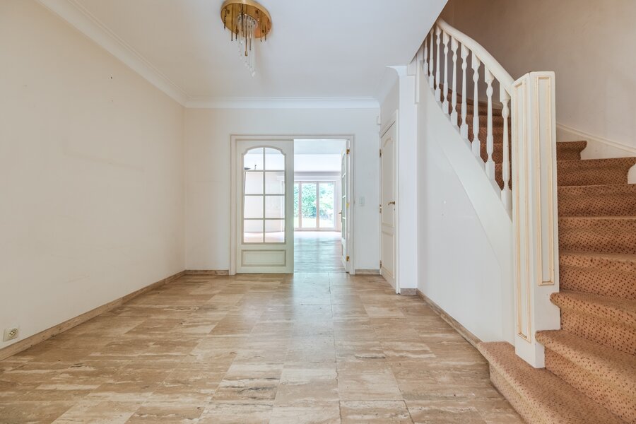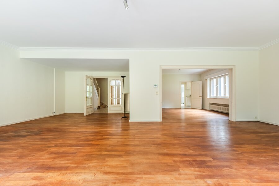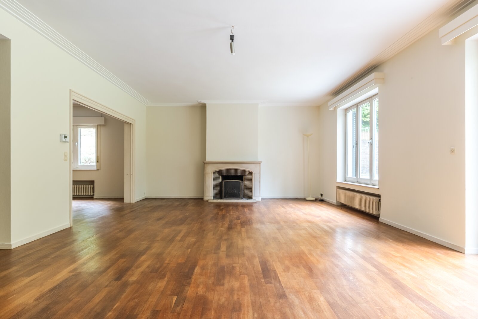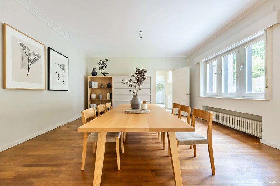 Op de begane grond leidt een ruime inkomhal met vestiaire en gastentoilet naar een lichte woonkamer van ±44 m² met open haard en toegang tot de tuin met zwembad. Een eetkamer van 20 m² en een volledig uitgeruste keuken maken de ontvangstruimte compleet. Ook op de begane grond is er een bureau met mogelijkheid voor vrij beroep of speelkamer/multifunctionele ruimte.