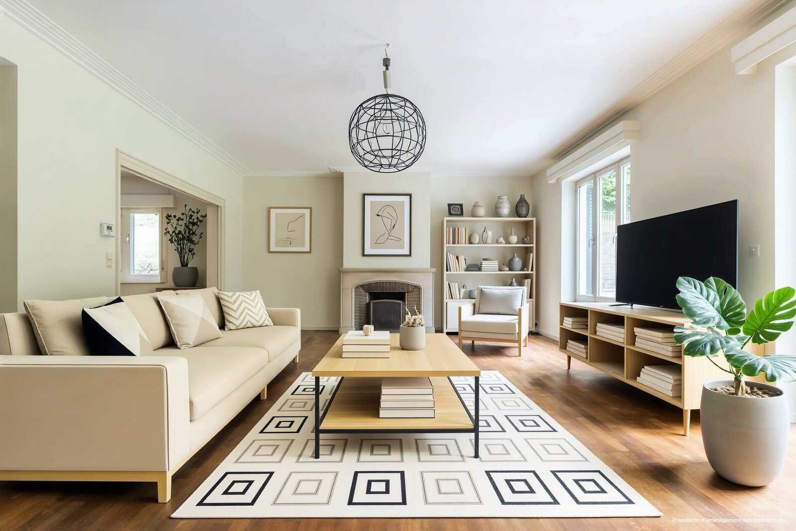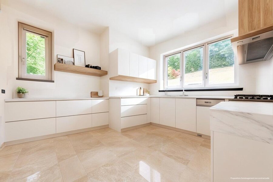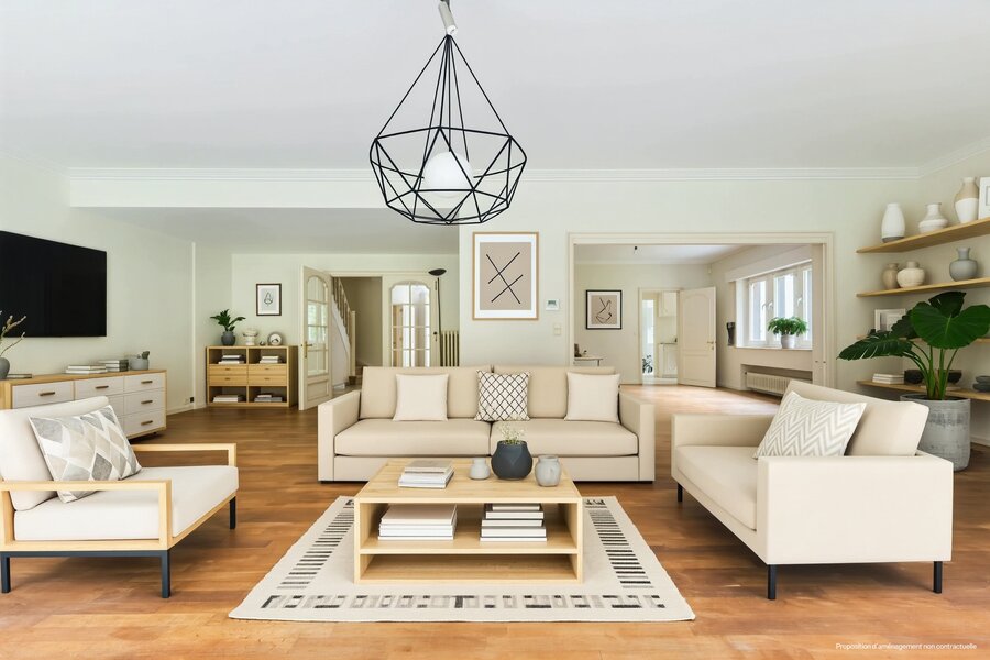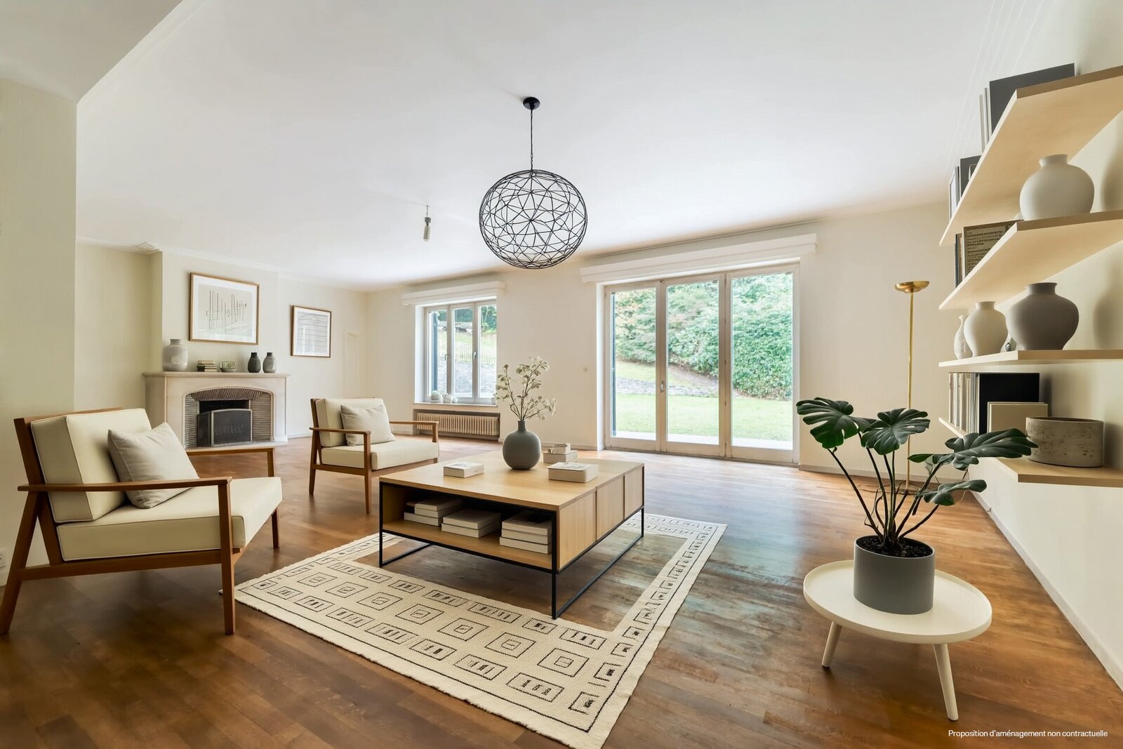 Op de begane grond leidt een ruime inkomhal met vestiaire en gastentoilet naar een lichte woonkamer van ±44 m² met open haard en toegang tot de tuin met zwembad. Een eetkamer van 20 m² en een volledig uitgeruste keuken maken de ontvangstruimte compleet. Ook op de begane grond is er een bureau met mogelijkheid voor vrij beroep of speelkamer/multifunctionele ruimte.
