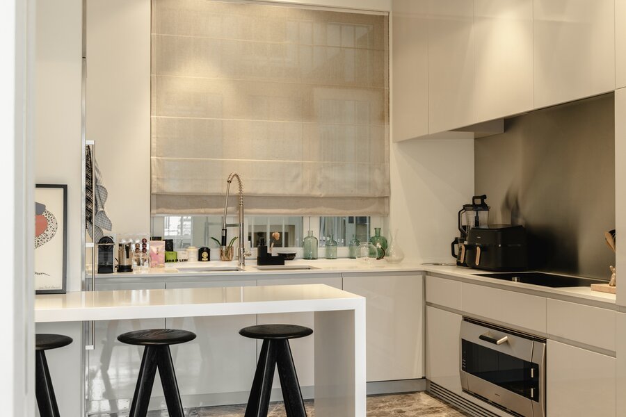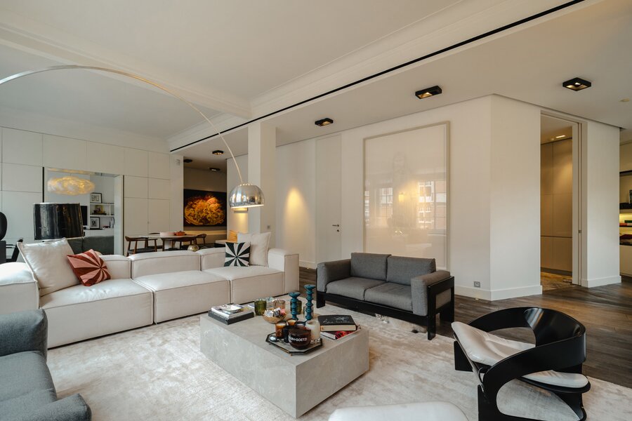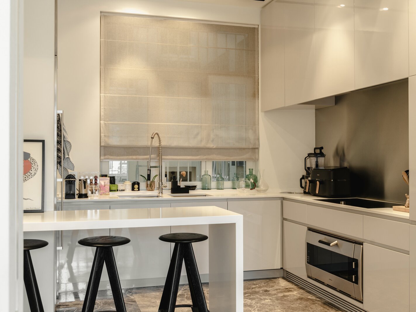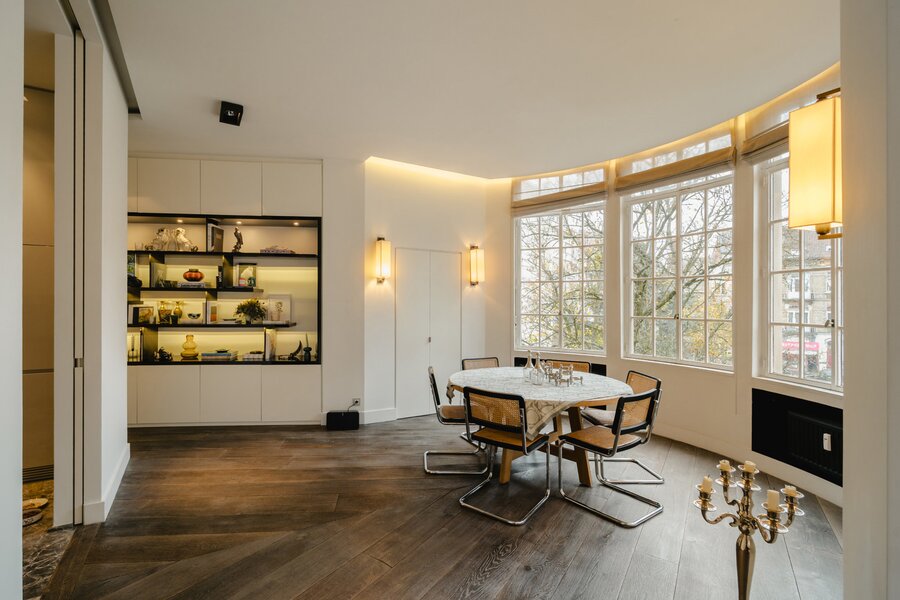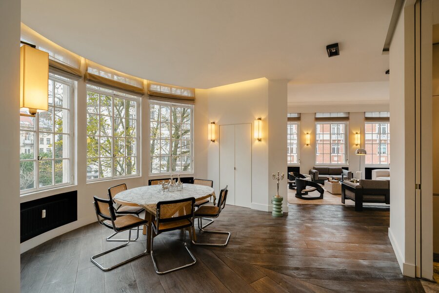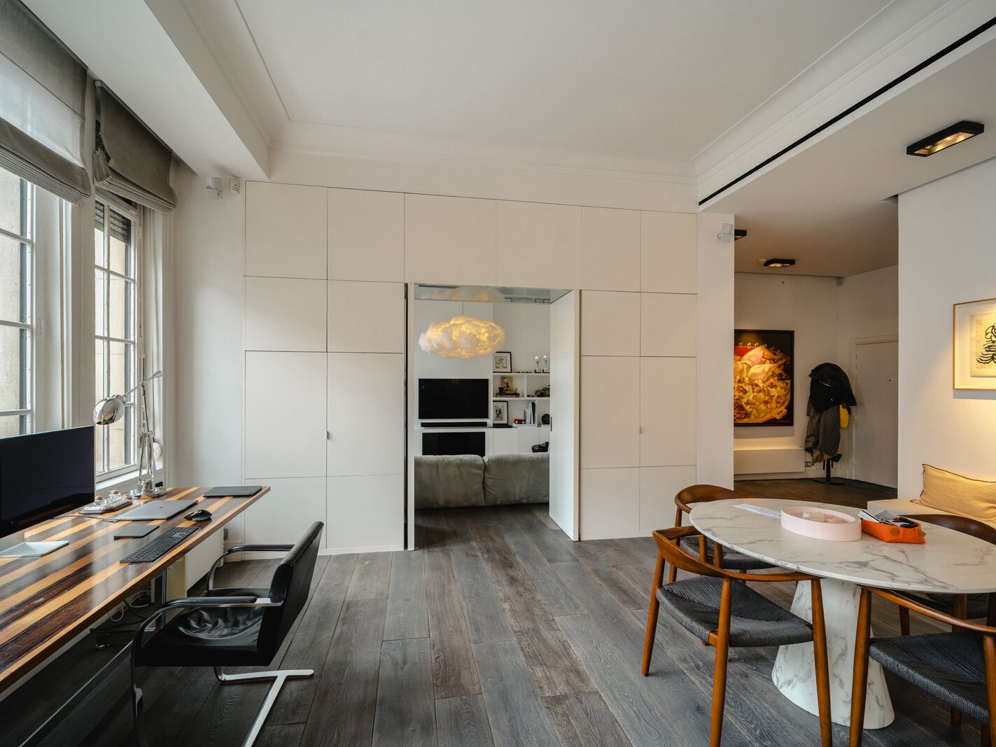 Dit appartement is volledig gerenoveerd met hoogwaardige materialen en biedt ruime ontvangstruimtes met hoge plafonds. Het beschikt over een hal met garderobe, een lichte woonkamer, een eethoek en een aparte, volledig uitgeruste, speciaal ontworpen Gaggenau-keuken. De hoofdslaapkamer beschikt over een volledig marmeren badkamer en een aparte dubbele kleedkamer. Akoestische isolatie zorgt voor een rustige en vredige omgeving. Een tweede slaapkamer/kantoor/tv-kamer met open haard grenst aan de woonkamer en er is ook een aparte doucheruimte.