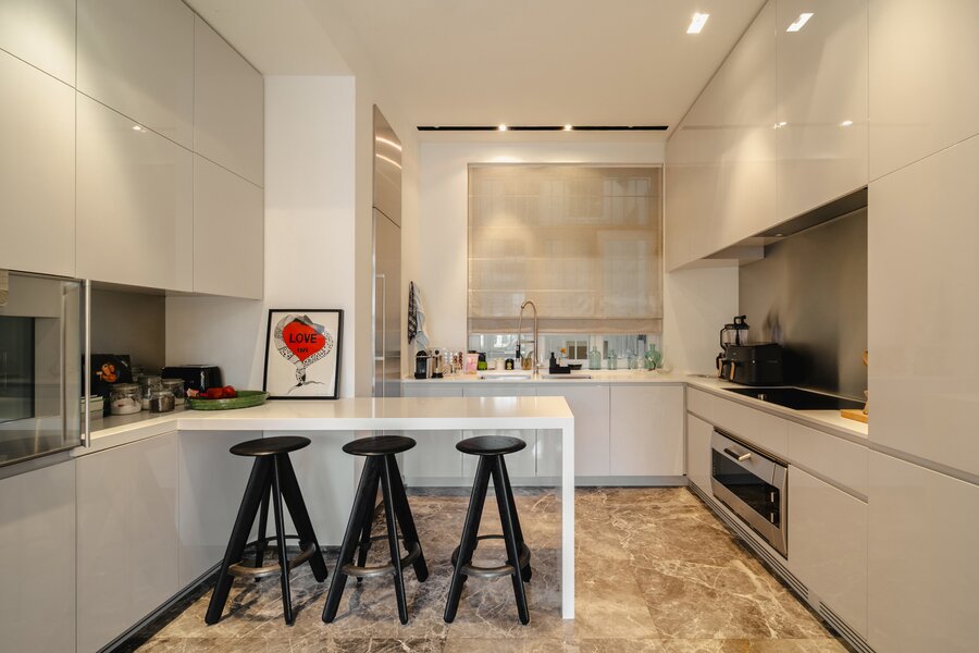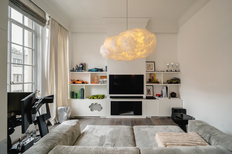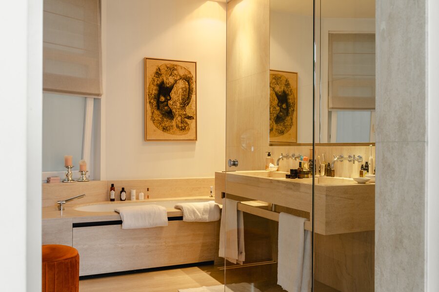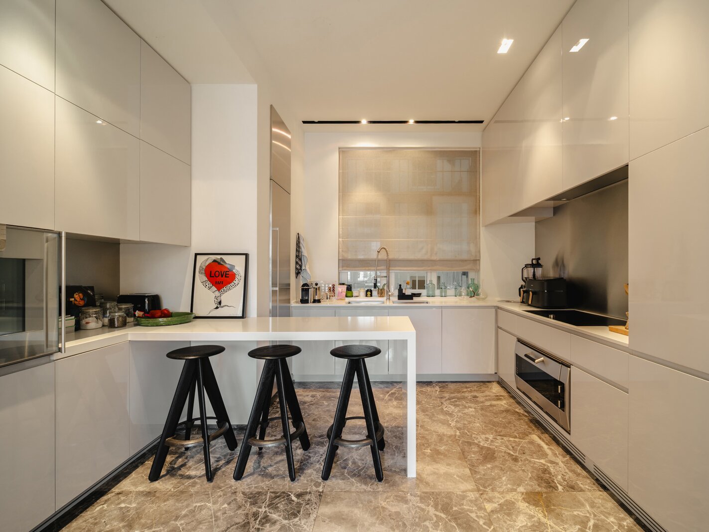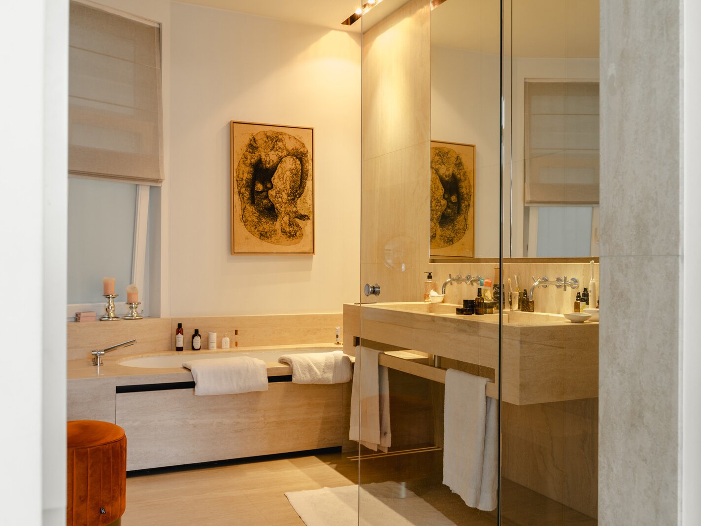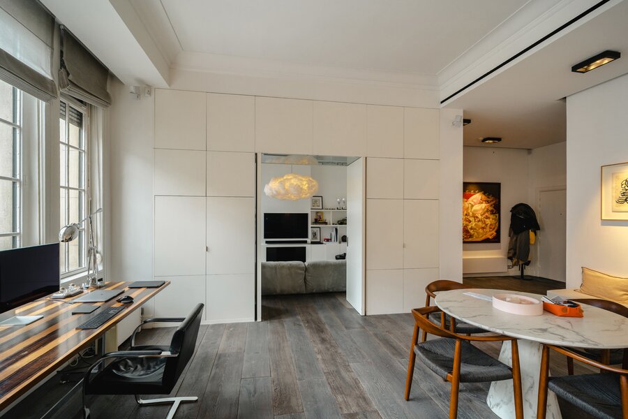 Dit appartement is volledig gerenoveerd met hoogwaardige materialen en biedt ruime ontvangstruimtes met hoge plafonds. Het beschikt over een hal met garderobe, een lichte woonkamer, een eethoek en een aparte, volledig uitgeruste, speciaal ontworpen Gaggenau-keuken. De hoofdslaapkamer beschikt over een volledig marmeren badkamer en een aparte dubbele kleedkamer. Akoestische isolatie zorgt voor een rustige en vredige omgeving. Een tweede slaapkamer/kantoor/tv-kamer met open haard grenst aan de woonkamer en er is ook een aparte doucheruimte.