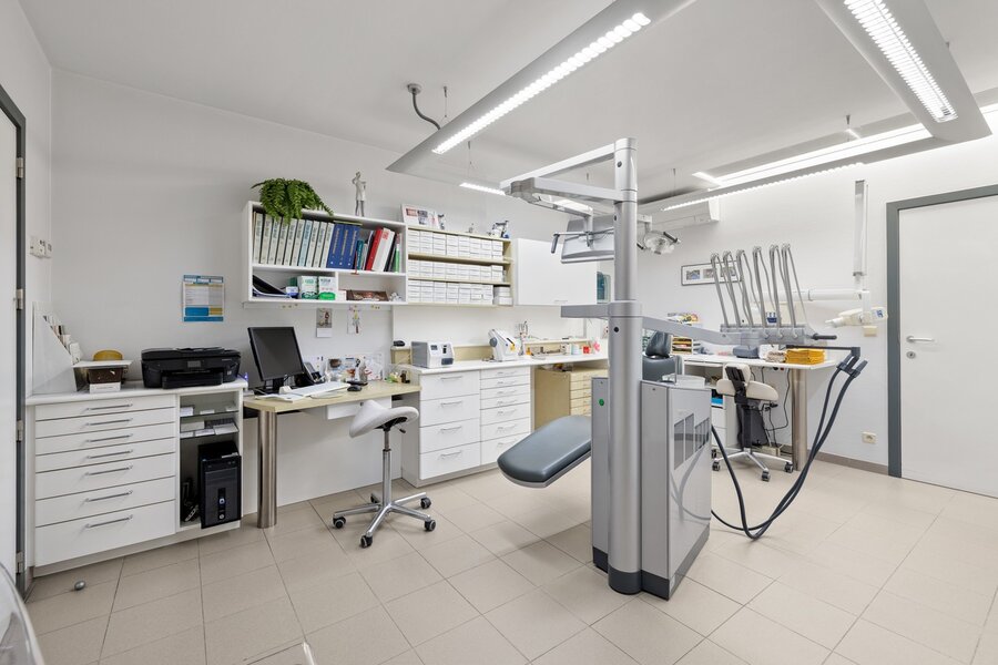 De herenwoning bestaat uit vijf niveaus, waaronder een kelder en zolder. Men komt binnen via de ruime inkomhal met wachtzaal en gastentoilet (voormalige garage), waarbij men het onthaal/secretariaat en een grote praktijkruimte aan de voorzijde vindt. De rest van de woning wordt momenteel privé gebruikt. Men komt dit deel binnen via de imposante inkomhal met prachtige marmeren vloer en een gastentoilet. De leefruimtes bevinden zich aan de achterzijde van het gelijkvloers: een ruime keuken met eetplaats, grote leefruimte met aparte zithoek en bijkomende eetplaats, en tot slot een praktische berging. Al deze leefruimtes grenzen aan de grote, zuidelijk georiënteerde stadstuin, uitgerust met een verwarmd zwembad, waar het heerlijk vertoeven is: men heeft er altijd wel de zon, maar ook meerdere schaduwplekken.