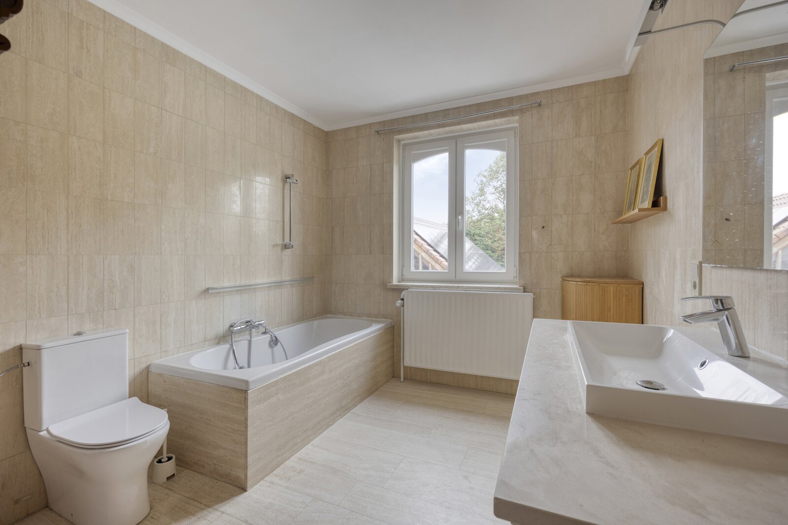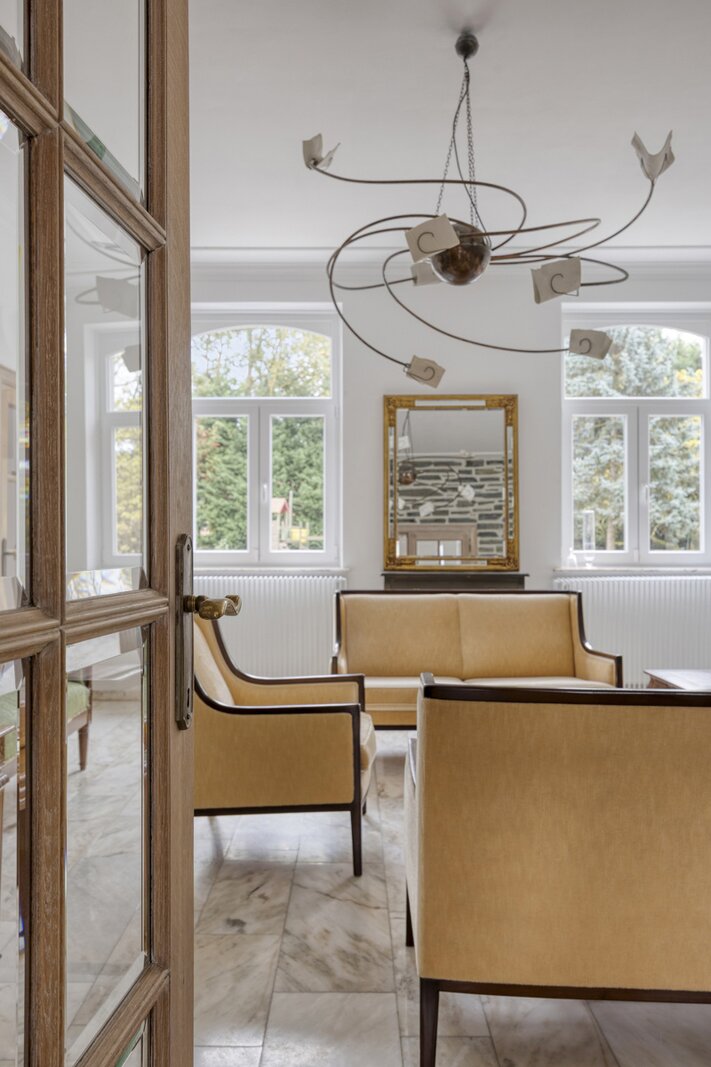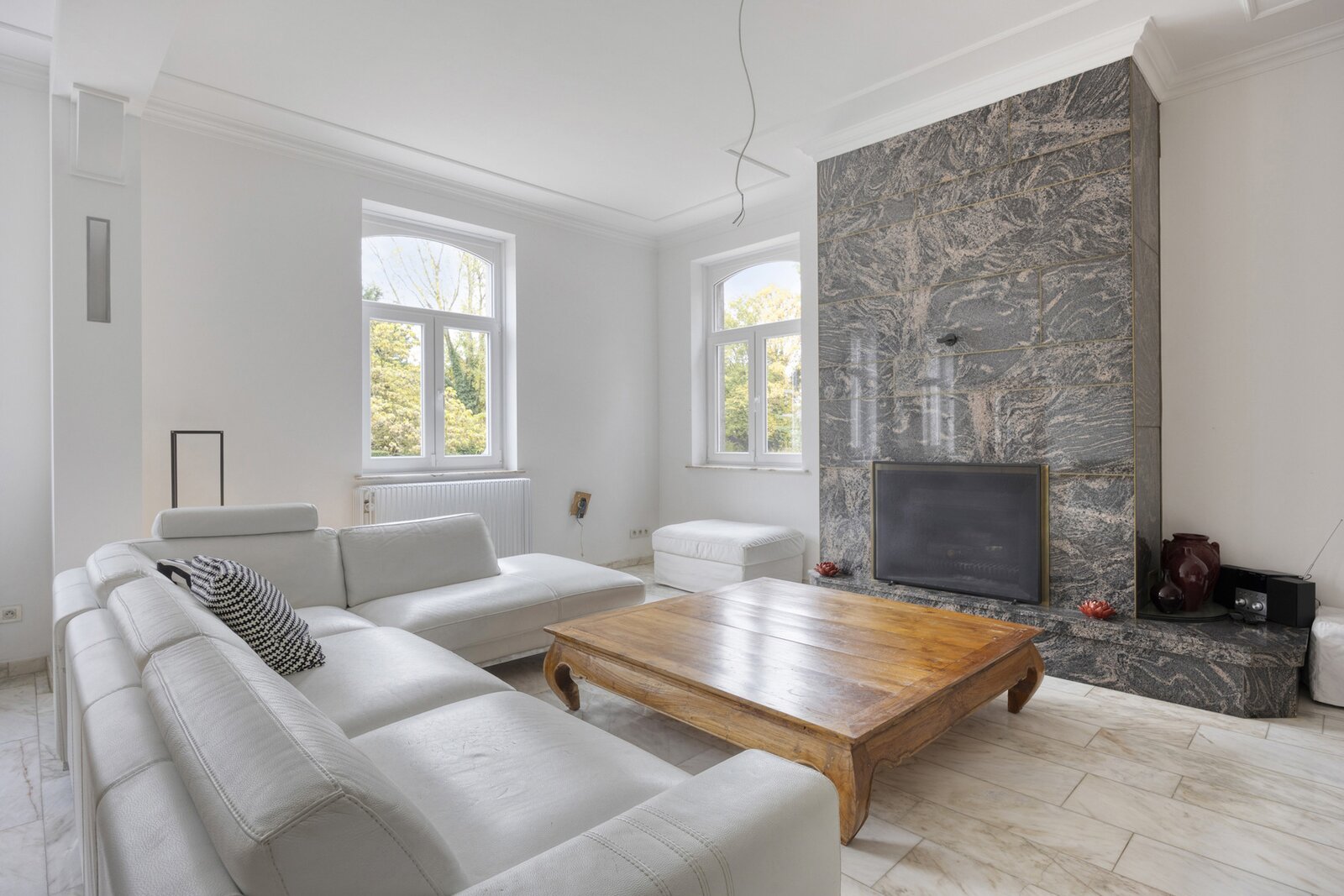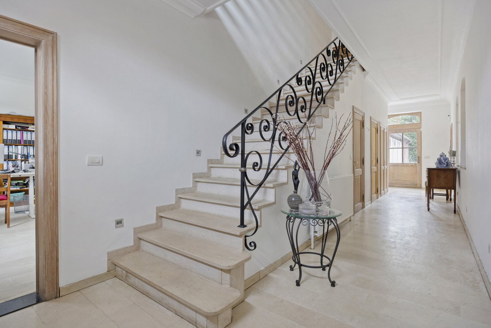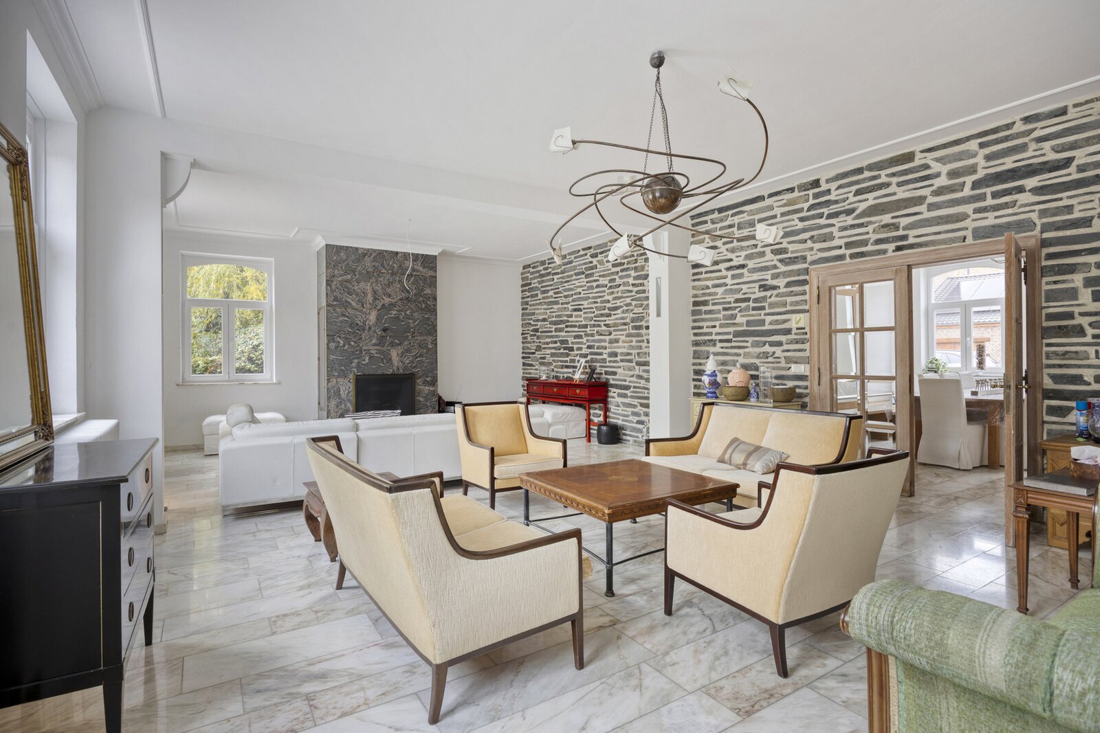 Binnen wordt u verwelkomd in een ruime inkomhal met vestiaire en gastentoilet, waar natuurstenen vloeren, een sierlijke trap en eiken binnendeuren meteen het karakter van de woning verraden. Aansluitend ligt een royaal bureau, ideaal om rustig te werken. De eetkamer en stijlvolle keuken vormen samen het hart van de woning, met aansluitend de grote leefruimte met open haard en overvloedige lichtinval. Van hieruit geniet u van een mooi uitzicht op het zonneterras en de tuin. Daarnaast is er ook een gezellige tv-kamer, perfect voor ontspanning in een warme sfeer.