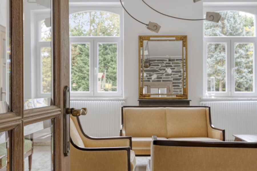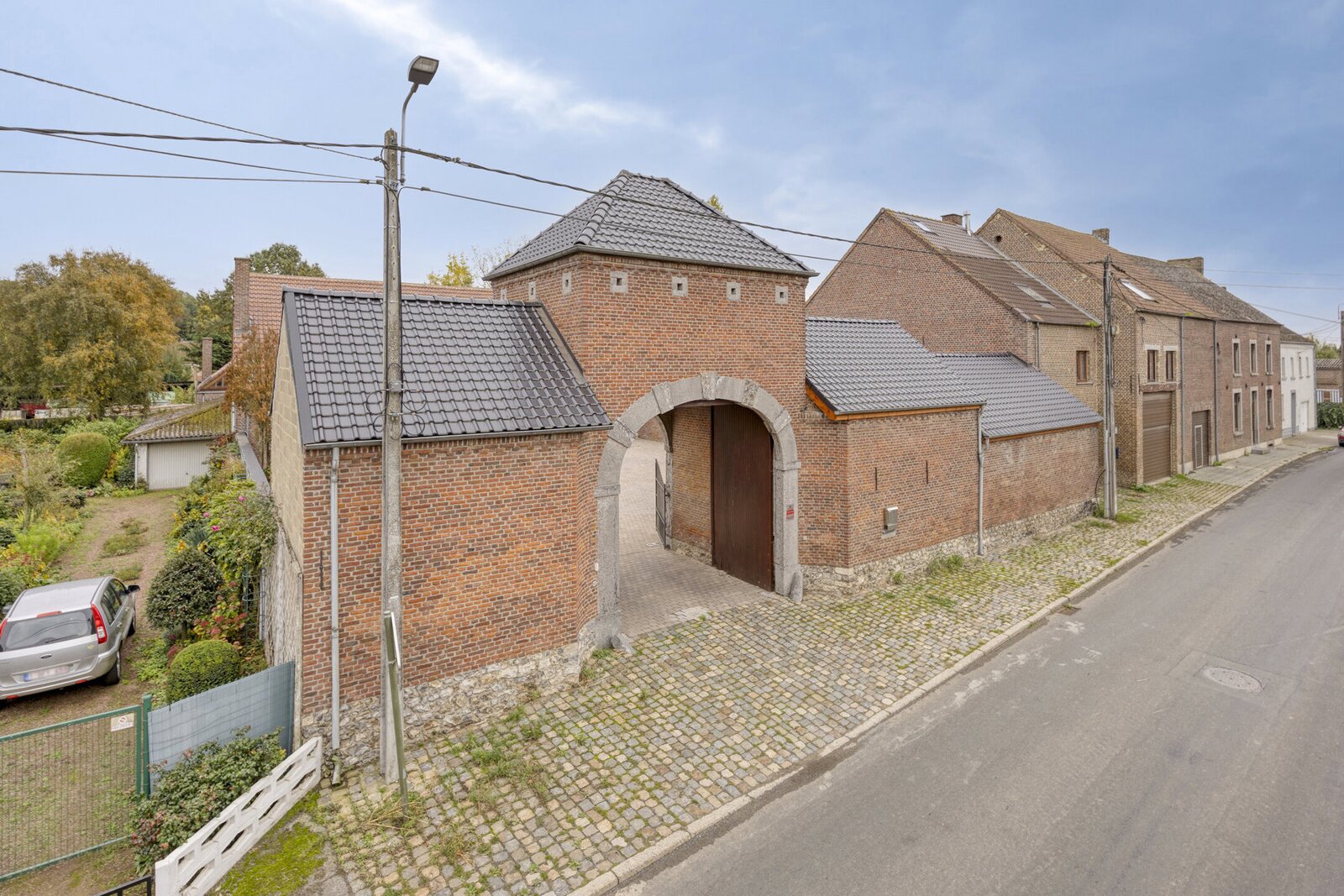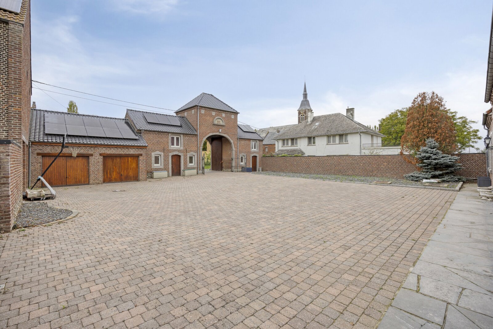 Via het poortgebouw, waar zich ook de dubbele garage bevindt, betreedt u een binnenplein met extra autostaanplaatsen en een carport. De aangrenzende ruimtes bieden bovendien tal van mogelijkheden — van gastenverblijf tot kantoor of vrij beroep.
