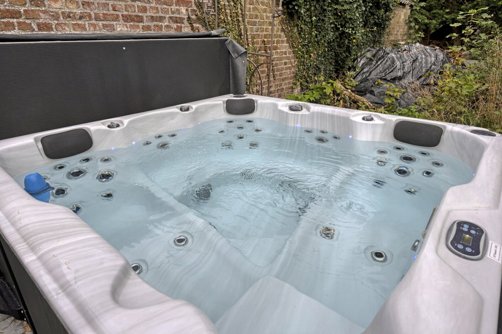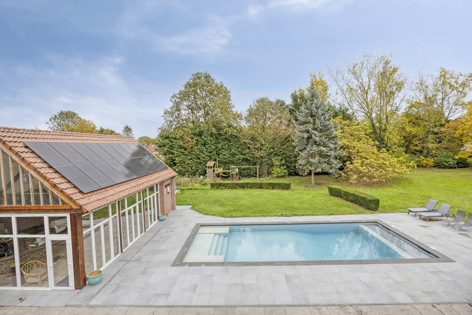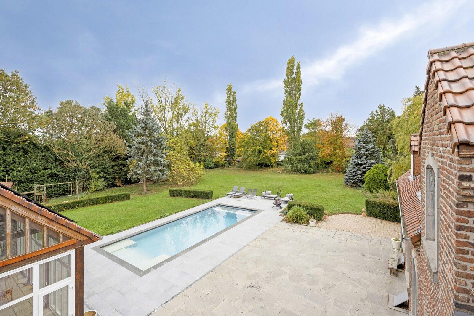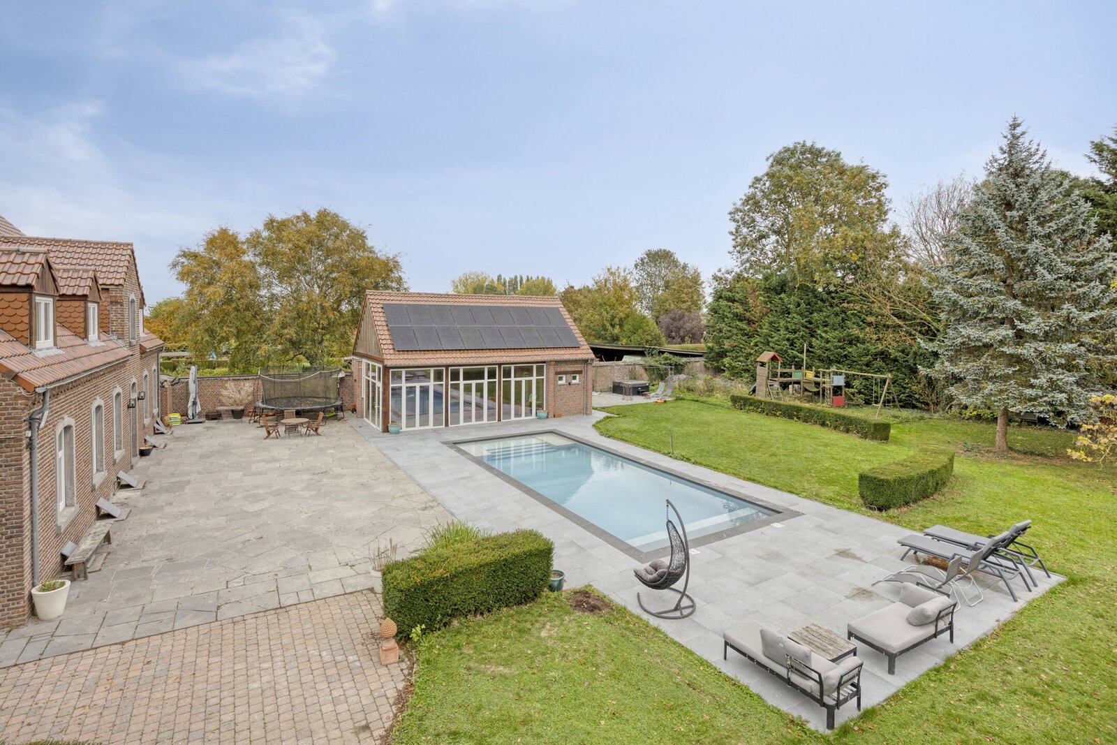 Buiten wacht een waar vakantiegevoel: een zuidgericht terras van 200 m² met verwarmd zwembad, jacuzzi en een stijlvol poolhouse met bar, relaxruimte, douchekamer en gastenkamer. De prachtig aangelegde parktuin biedt volledige privacy en rust — een groene oase die uitnodigt om te genieten.
