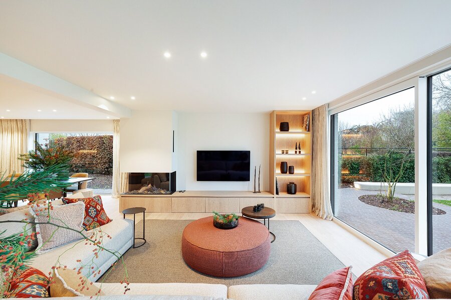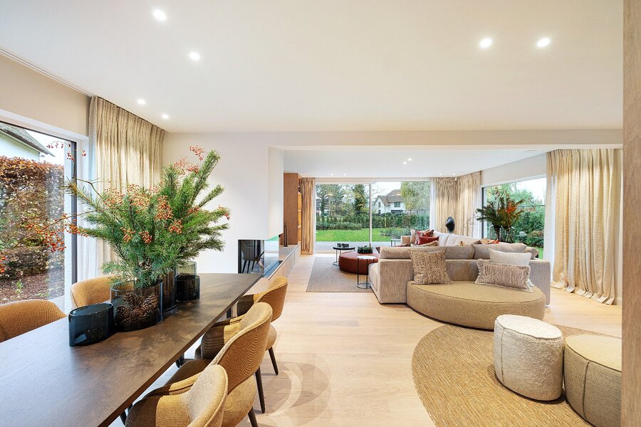 Ruime inkomhal met vestiaire en gastentoilet, die uitkomt op de lichte woonkamer met gashaard, de eetkamer en volledig uitgeruste keuken met Miele-apparatuur en wijnkelder. Grote raampartijen verbinden de leefruimte met zonnige terrassen en de zuidgerichte tuin.