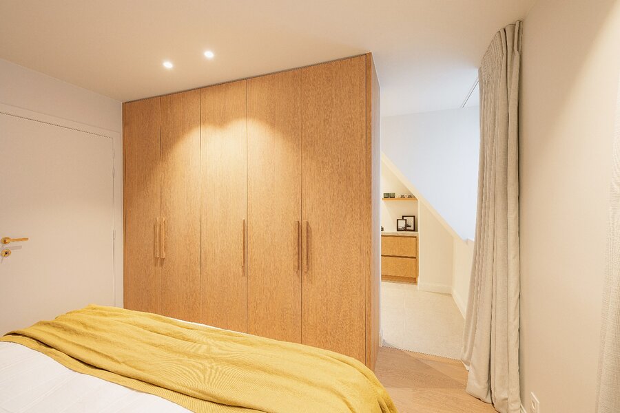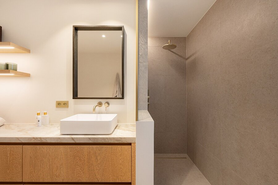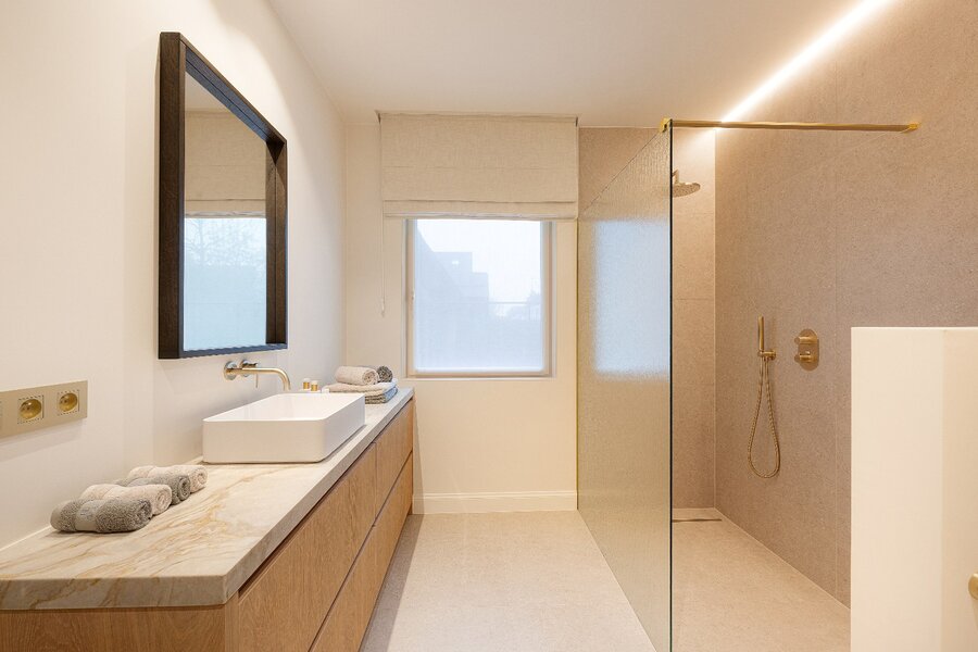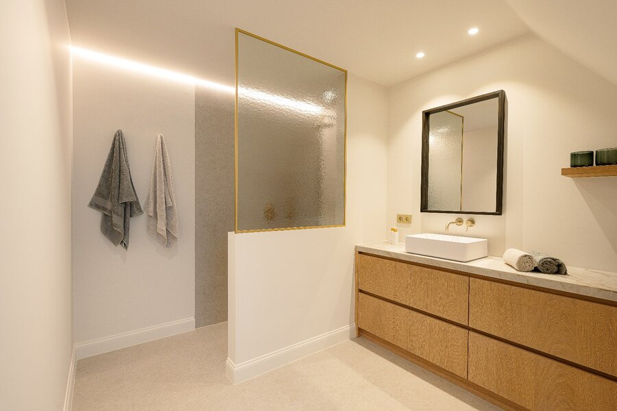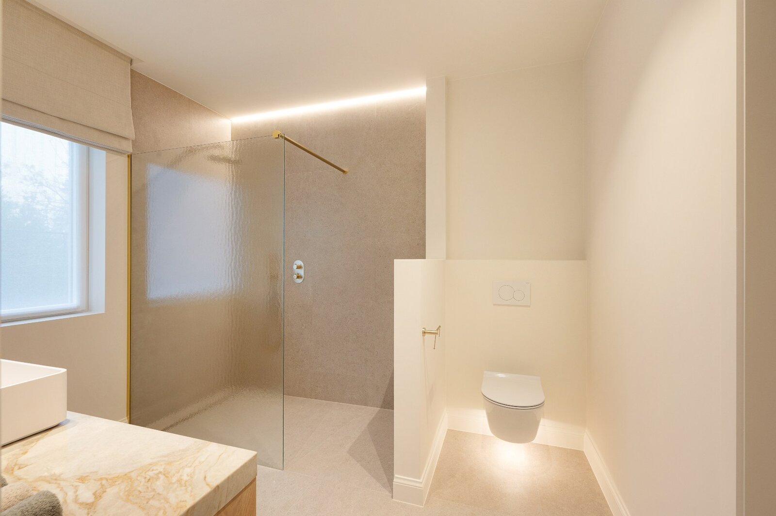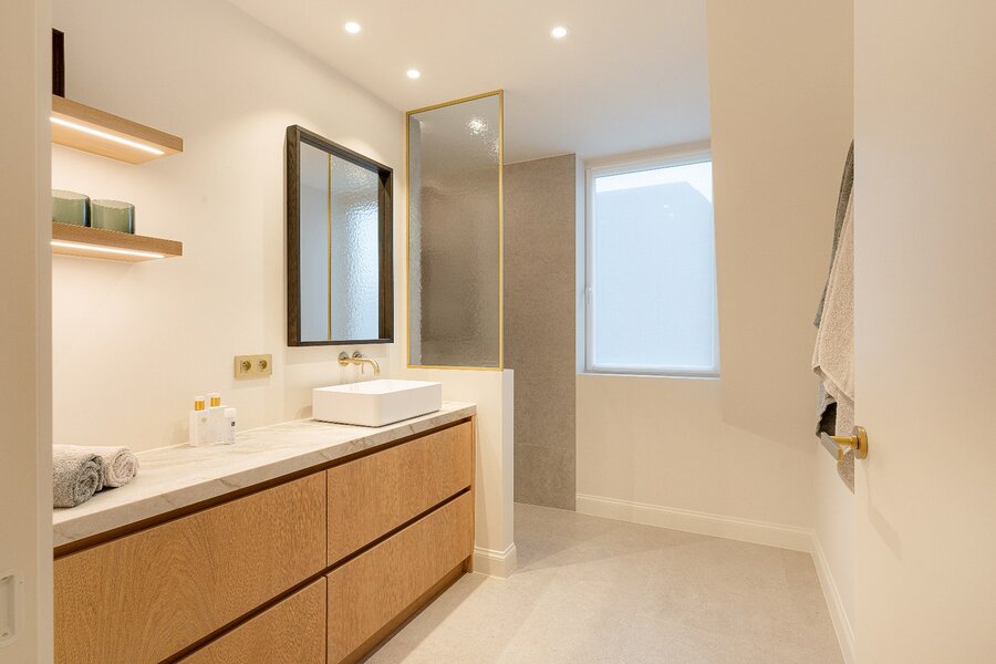 Op het gelijkvloers is er een volwaardige slaapkamer met badkamer, die ook perfect kan dienen als kantoor of wellnessruimte.