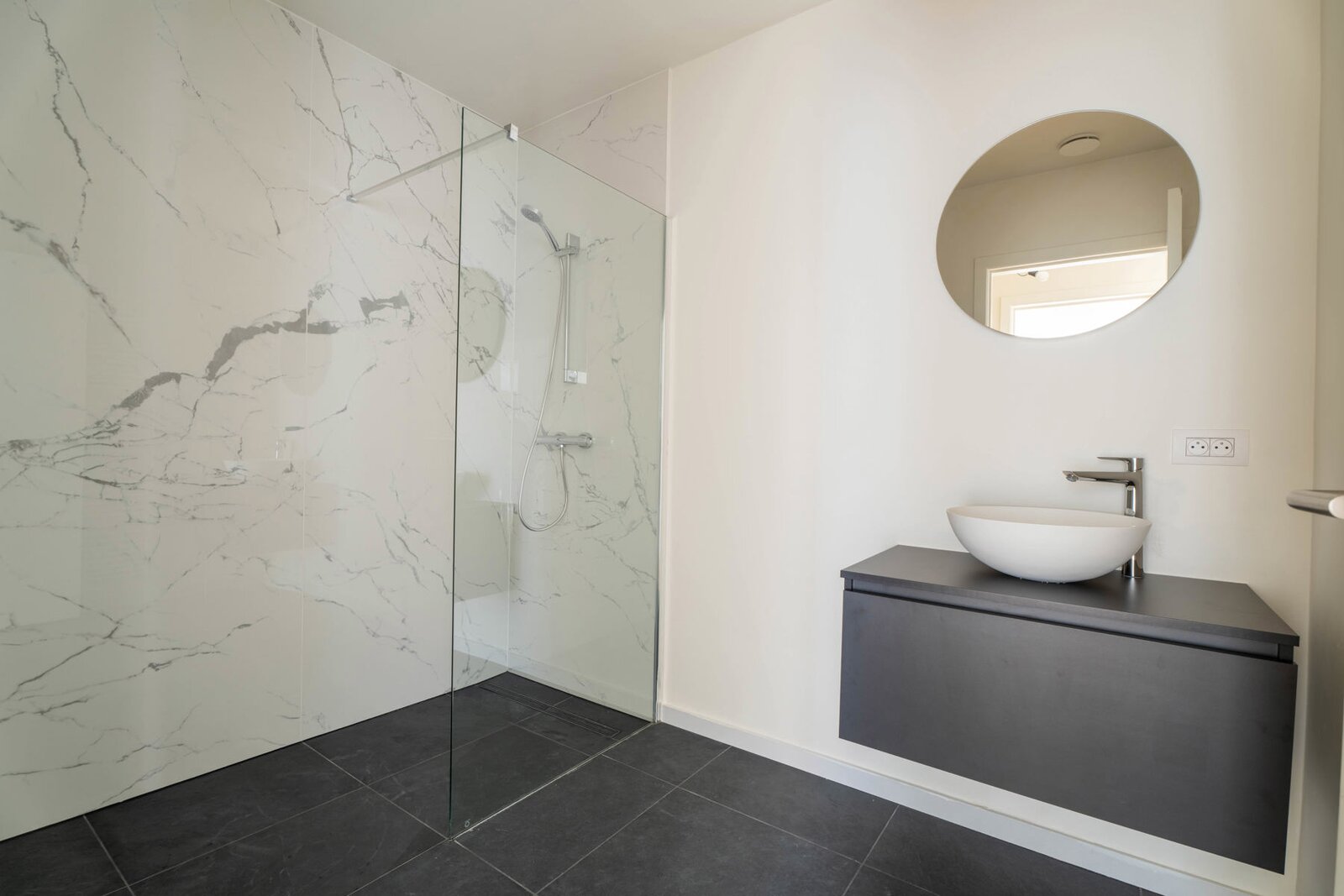 Een centraal gelegen patio brengt niet alleen extra licht binnen, maar zorgt ook voor een aangename, luchtige sfeer in de woning. Op de eerste verdieping bevinden zich drie volwaardige kamers, waaronder een master bedroom met een eigen dressing en een aansluitende badkamer. Daarnaast is er op deze verdieping nog een tweede, volledig afgewerkte badkamer. Bovenaan de woning geniet je van een extra terras, een perfecte plek om tot rust te komen.