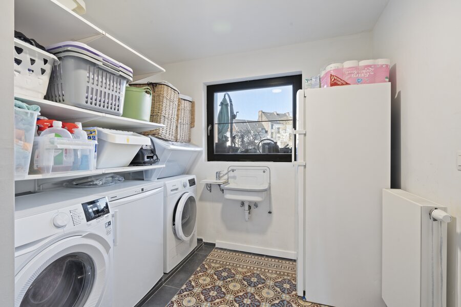 - Berging (7,9 m²) met aansluitingen voor wasmachine en droogkast.
