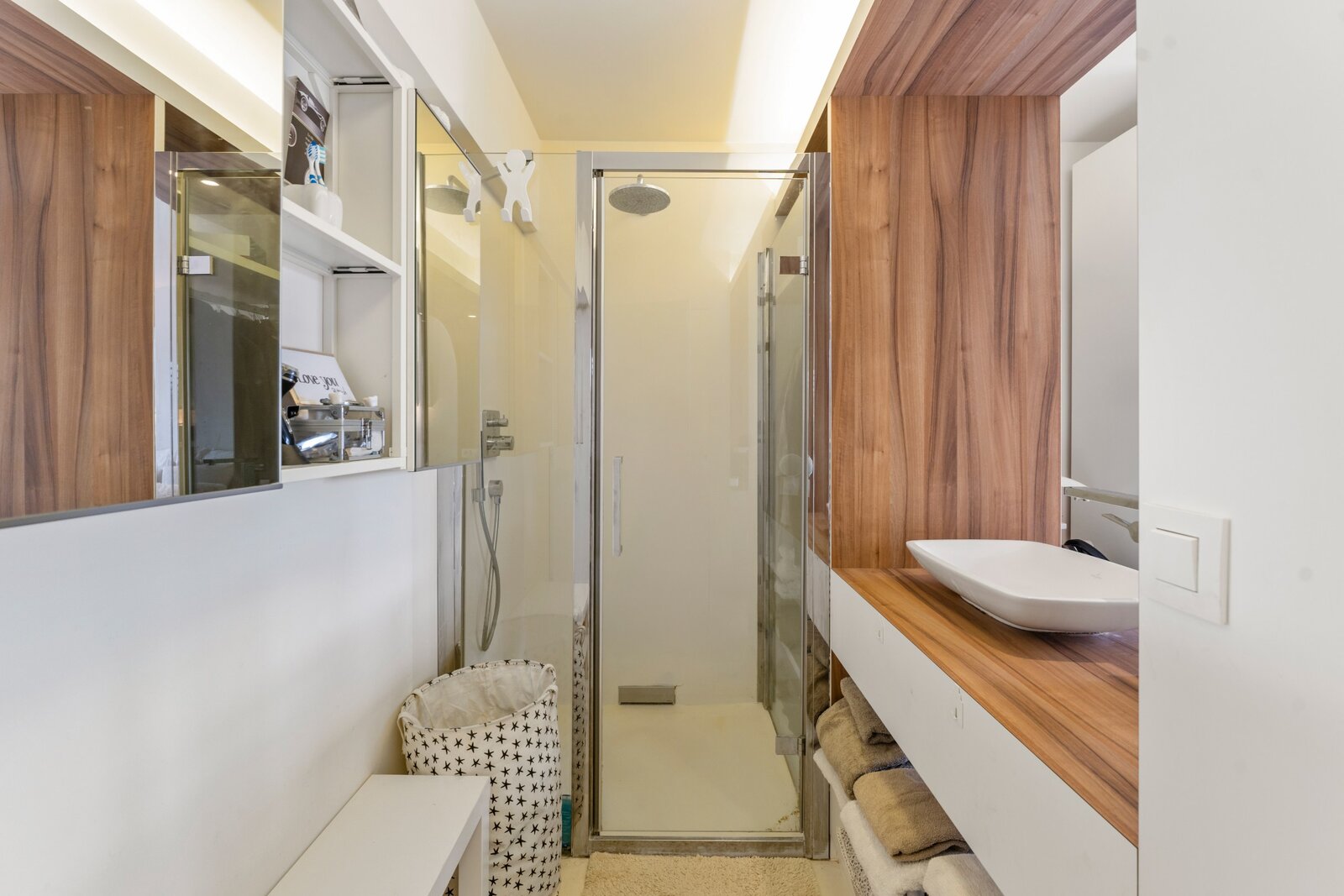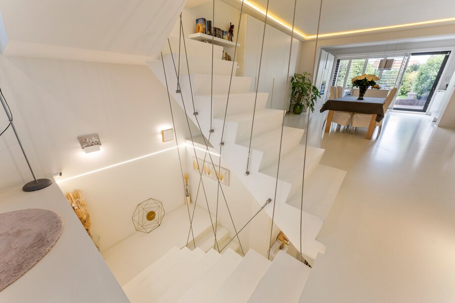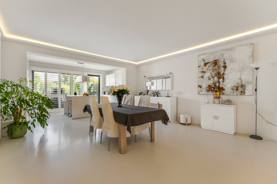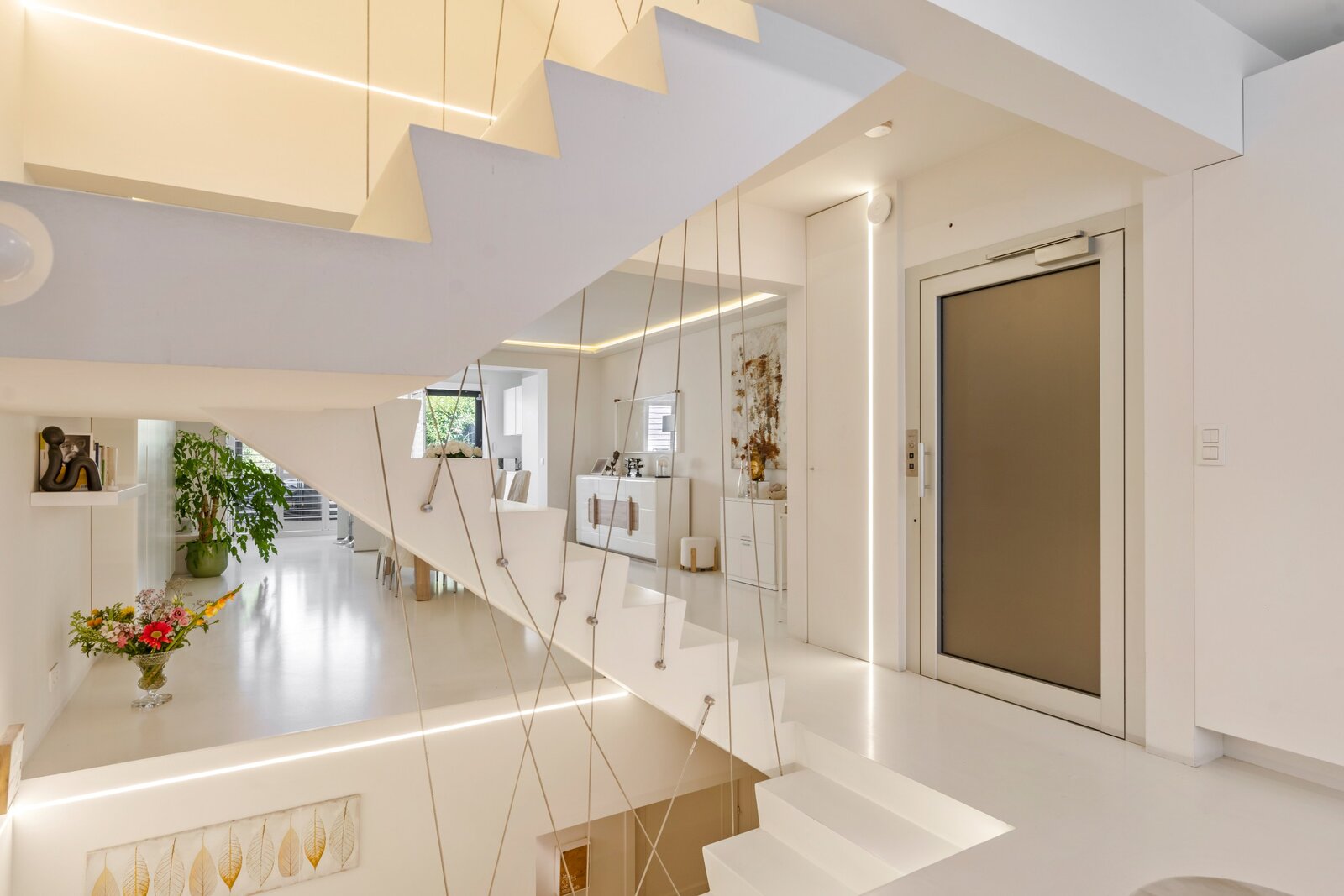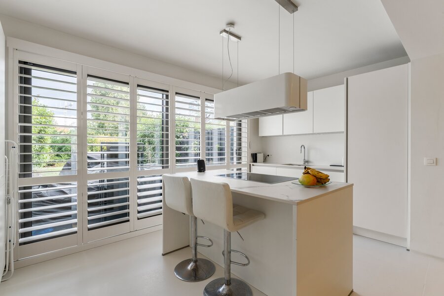 De inkom bevindt zich op het gelijkvloers en leidt u via een privétrap of lift naar de eerste verdieping met een ruime, open leefruimte en moderne keuken. Grote raampartijen zorgen voor veel lichtinval en geven toegang tot het aangename terras en de fraai aangelegde tuin.