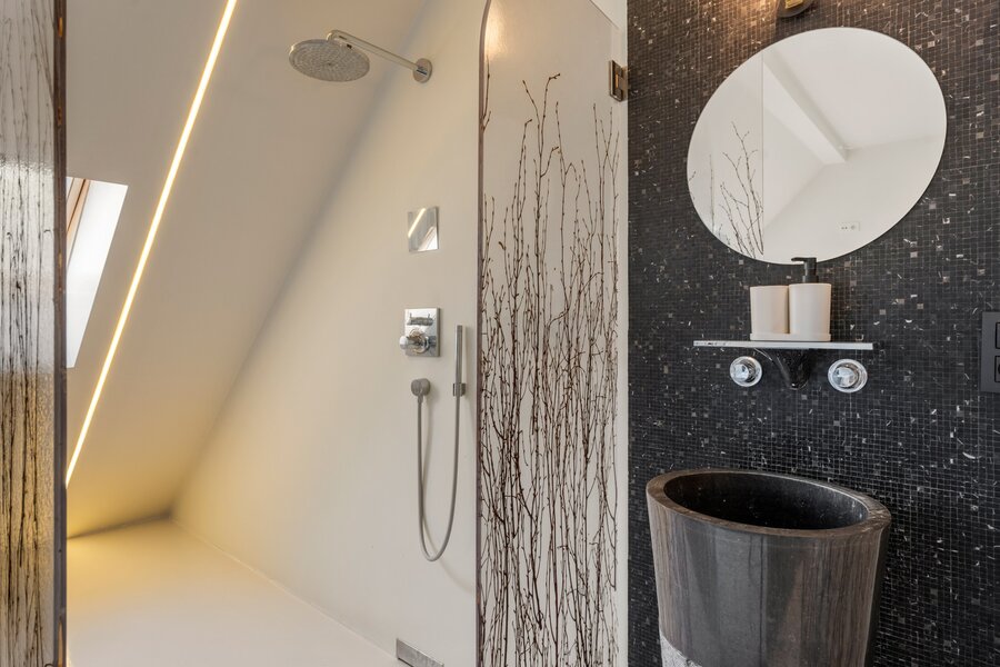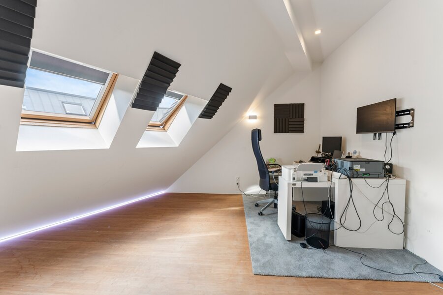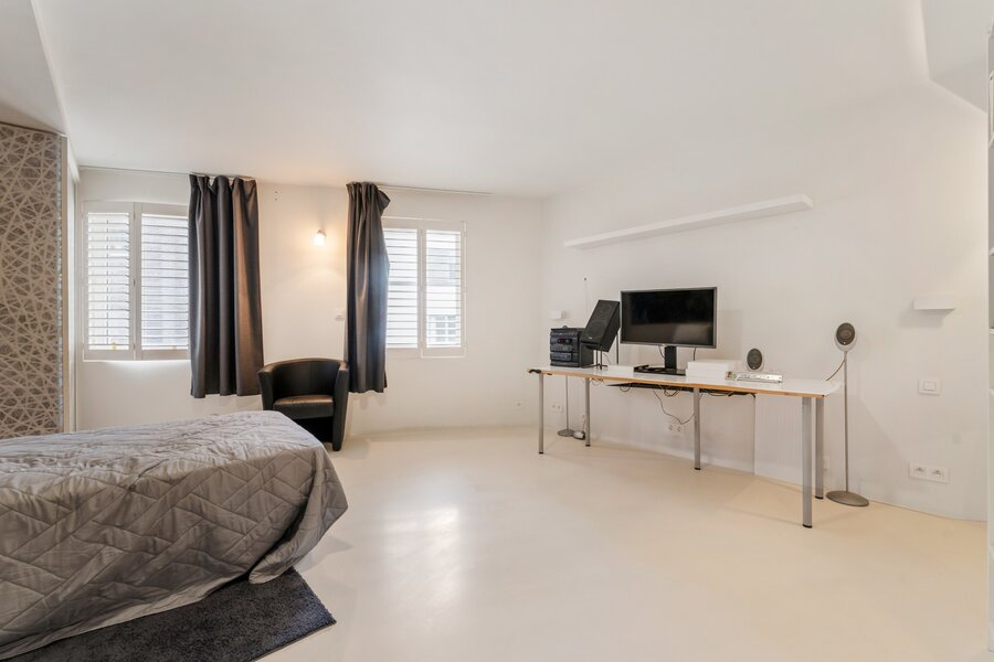 De derde verdieping biedt een royale master bedroom met ensuite badkamer waarin een uniek handgemaakt glaselement een echte blikvanger vormt. Daarnaast is er nog een extra kamer die momenteel is ingericht als bureau, ook deze kamer heeft de mogelijkheid tot installatie van badkamer.