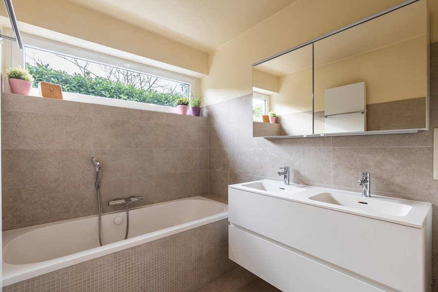 Badkamer met ligbad en dubbele wastafel