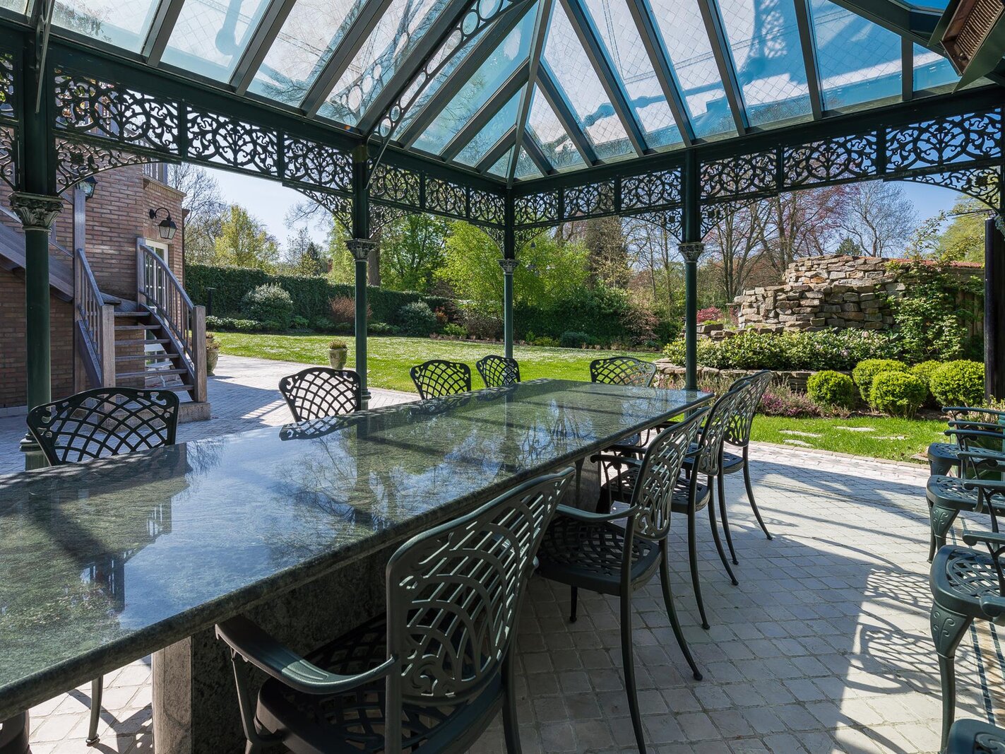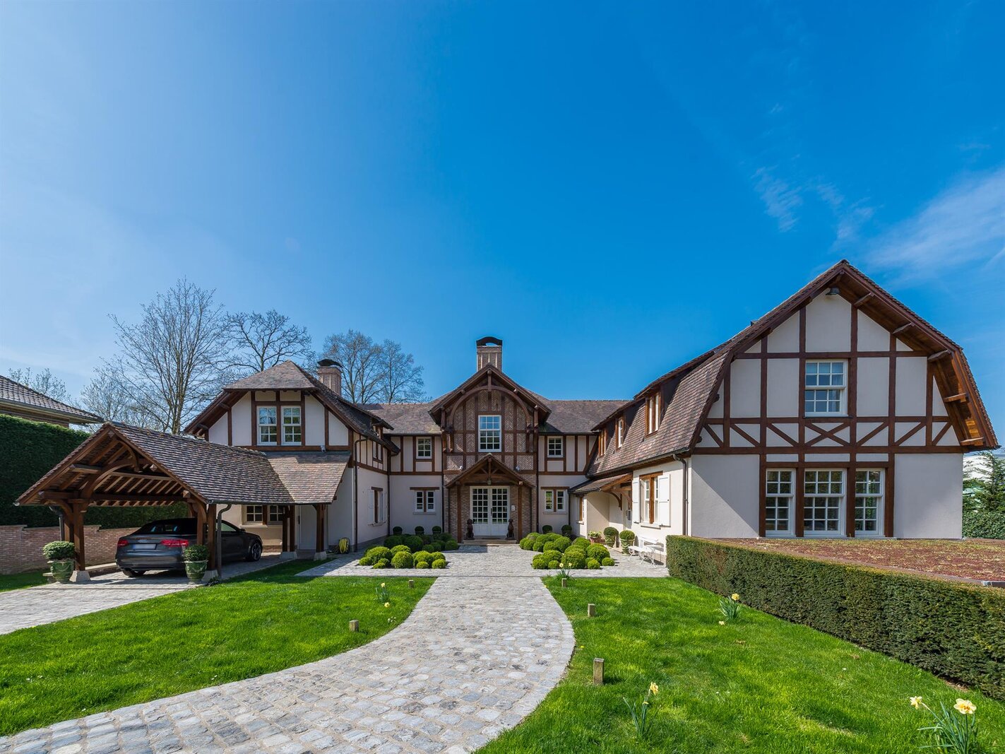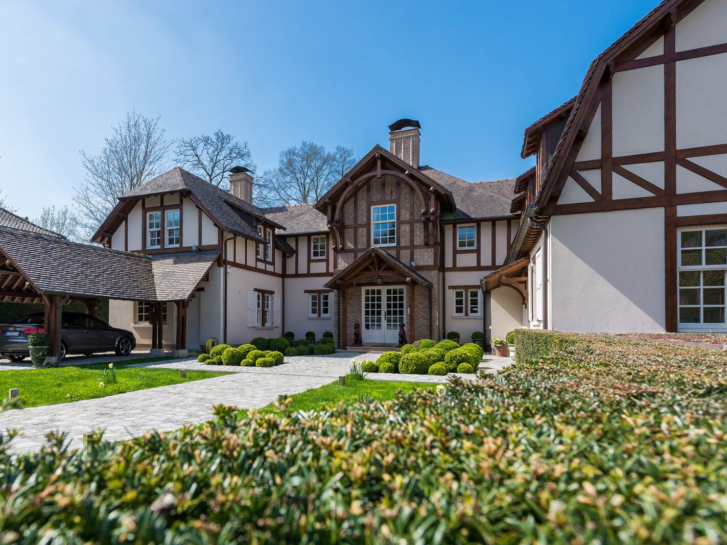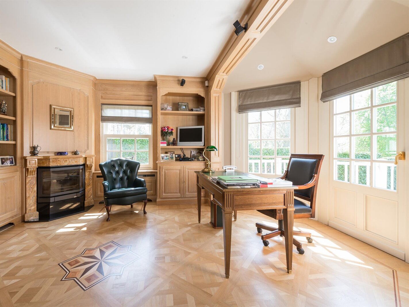 De woning in Anglo-Normandische stijl, afgeschermd van inkijk, opent naar een ruime hal met garderobe en gastentoilet, die toegang geeft tot de woonruimtes. Deze omvatten een formele eetkamer, een woonkamer met open haard, een aparte keuken met bijkeuken/wasruimte, een kantoor dat als slaapkamer kan worden gebruikt en een studeerkamer/bibliotheek. De woonruimtes komen uit op het terras en de grote, op het zuidwesten georiënteerde tuin.