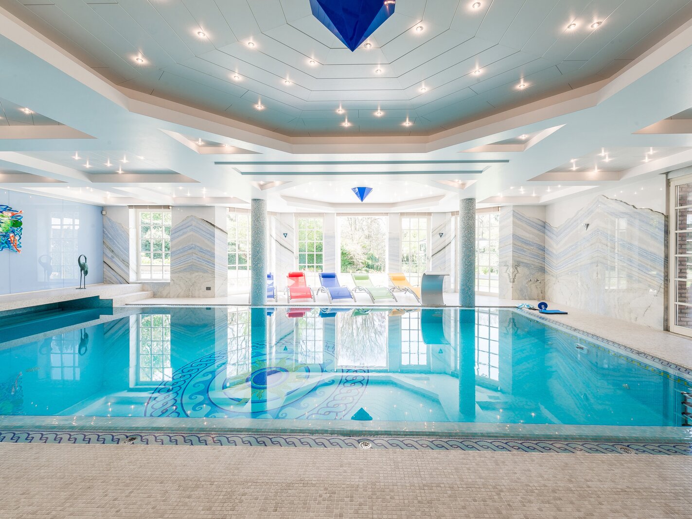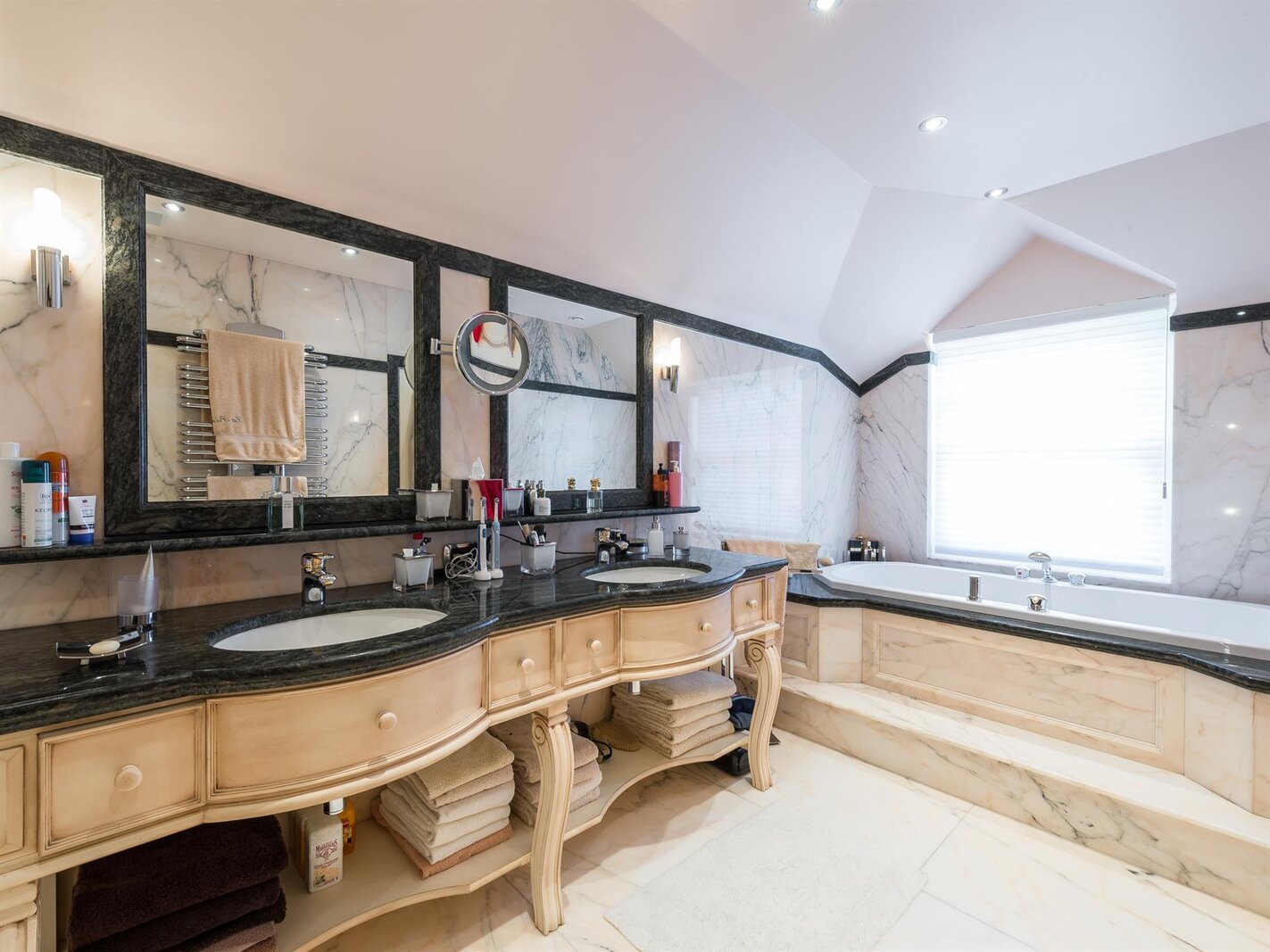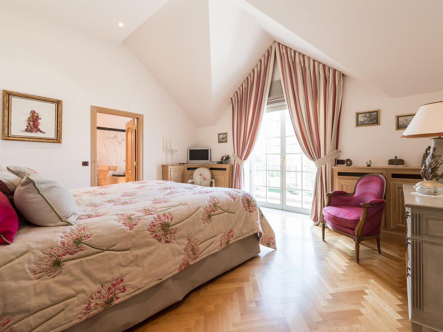 De hoofdtrap leidt naar de bovenverdieping, die ook bereikbaar is via een diensttrap. De bovenverdieping bestaat uit een hoofdslaapkamer met kleedkamer en en-suite badkamer, een tweede hoofdslaapkamer met aparte kleedkamer en en-suite badkamer, een slaapkamer met en-suite badkamer en twee extra slaapkamers die een badkamer delen. Een zelfstandig appartement (met kitchenette en badkamer) met eigen ingang completeert het pand. Op de benedenverdieping bevindt zich een ruime wellnessruimte met een zwembad, ontspanningsruimte, sauna, stoombad, jacuzzi en kleedkamers.