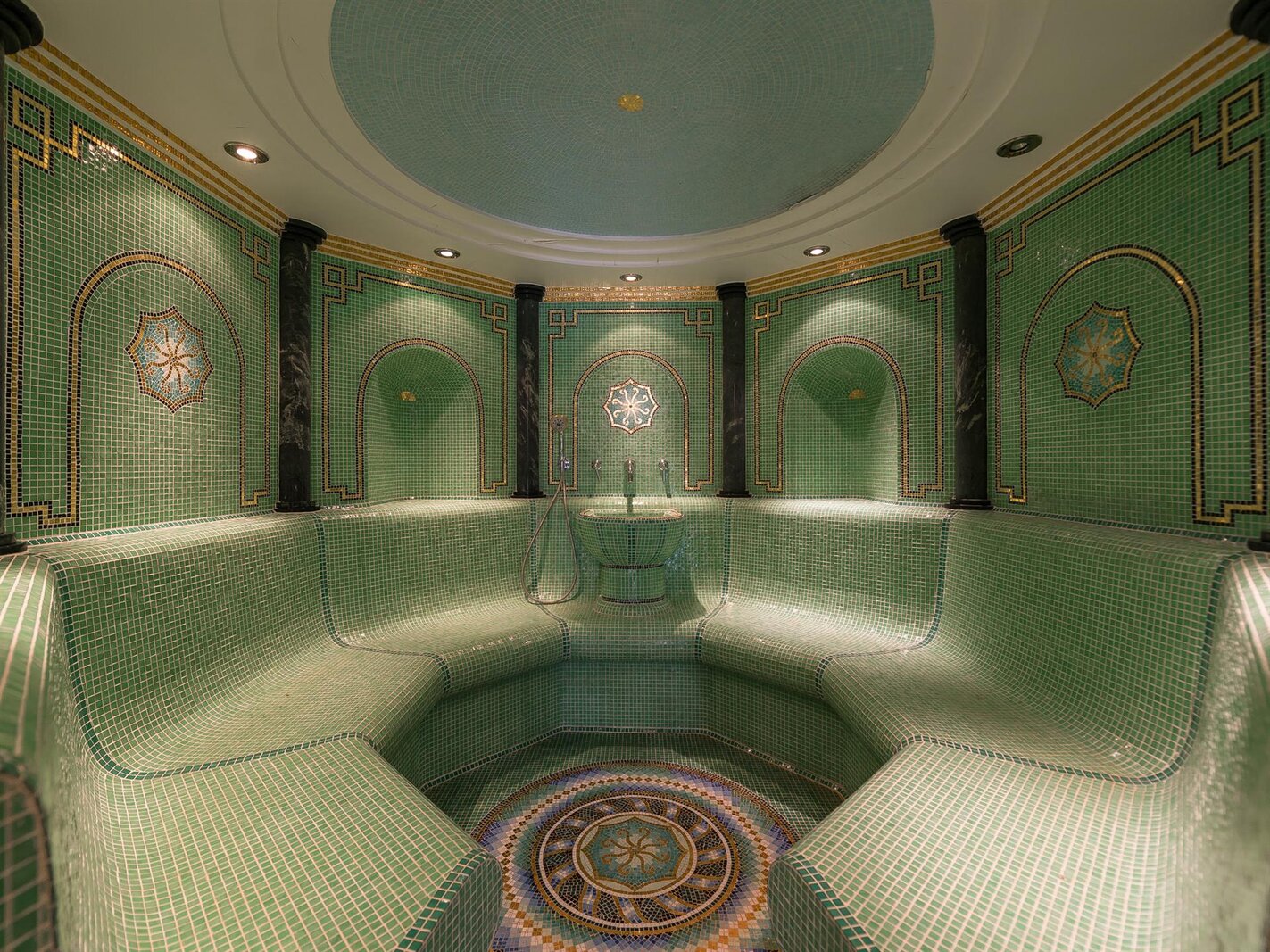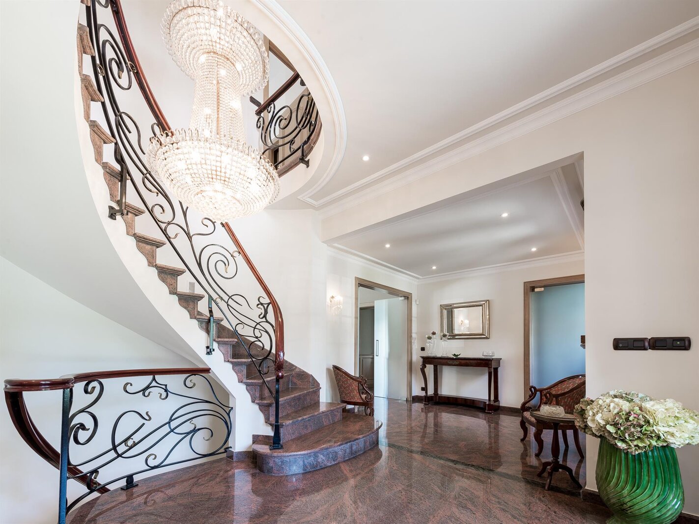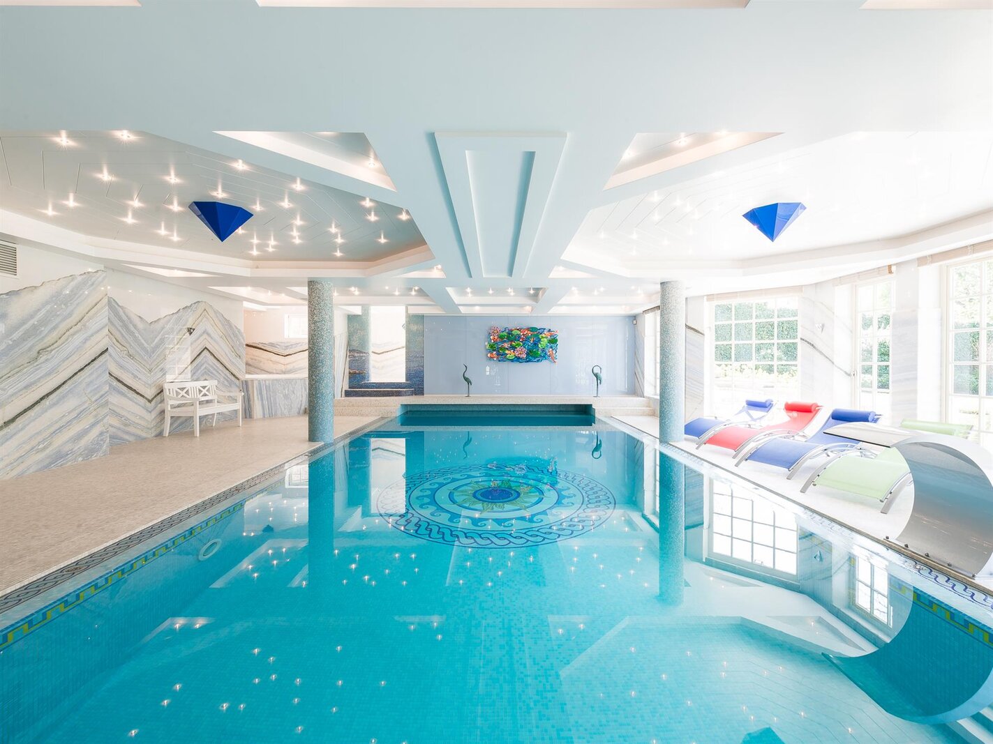 De hoofdtrap leidt naar de bovenverdieping, die ook bereikbaar is via een diensttrap. De bovenverdieping bestaat uit een hoofdslaapkamer met kleedkamer en en-suite badkamer, een tweede hoofdslaapkamer met aparte kleedkamer en en-suite badkamer, een slaapkamer met en-suite badkamer en twee extra slaapkamers die een badkamer delen. Een zelfstandig appartement (met kitchenette en badkamer) met eigen ingang completeert het pand. Op de benedenverdieping bevindt zich een ruime wellnessruimte met een zwembad, ontspanningsruimte, sauna, stoombad, jacuzzi en kleedkamers.