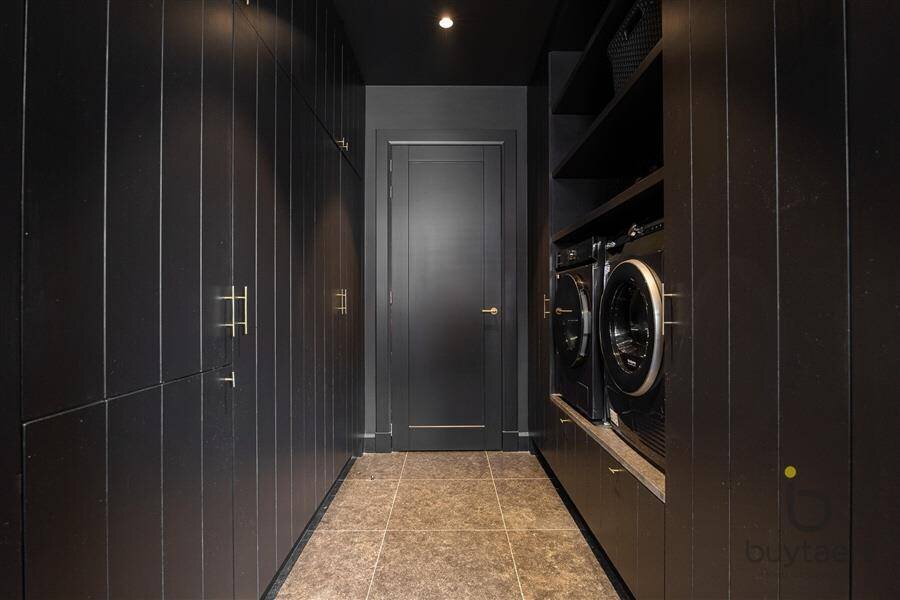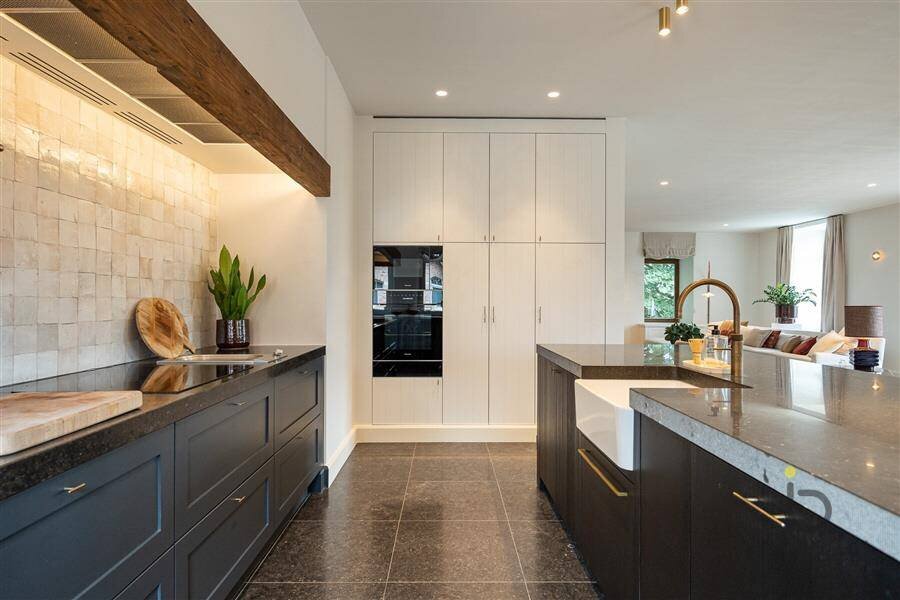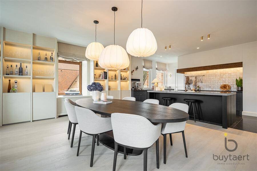 Aansluitend is er een knappe open keuken, volledig uitgerust met hoogwaardige apparatuur en een riant eiland. Tevens is er een aangename ontbijttoog en achterliggende bijkeuken met extra koelkast, diepvriezer en aansluitingen voor de wasmachine en droogkast. Eveneens een technische ruimte met extra berging.