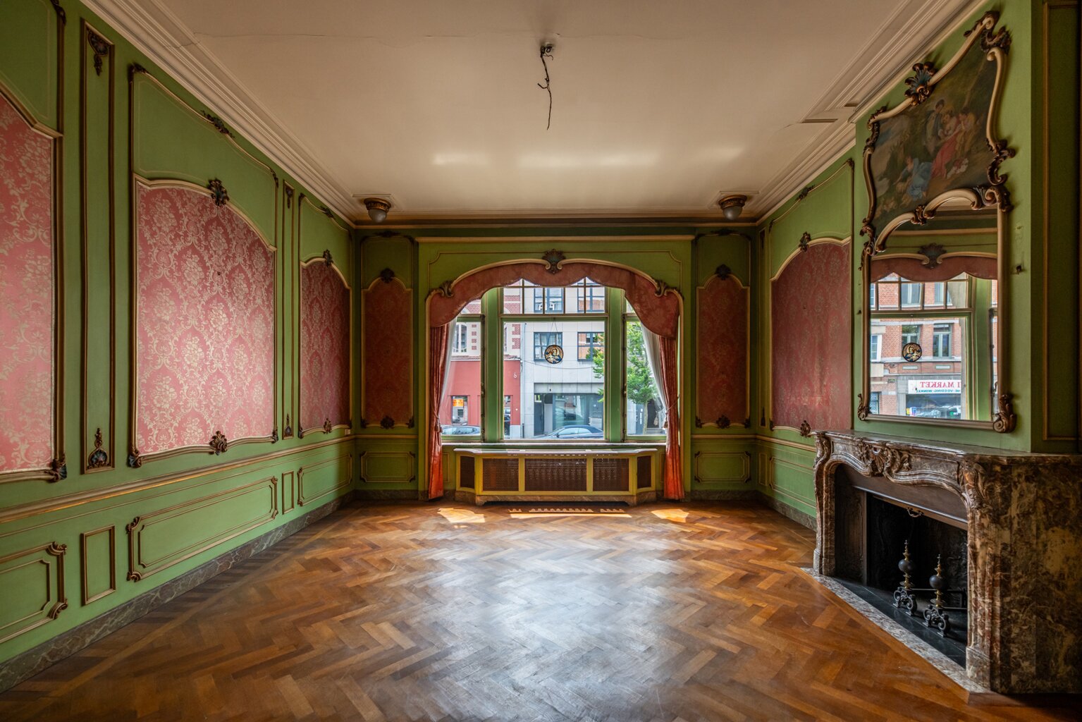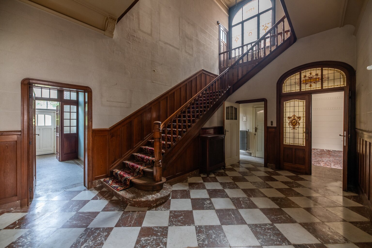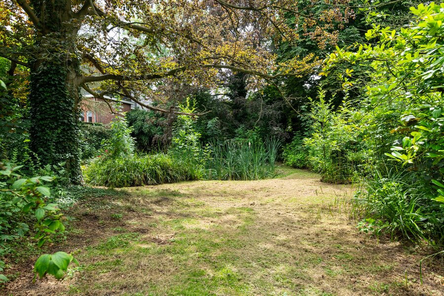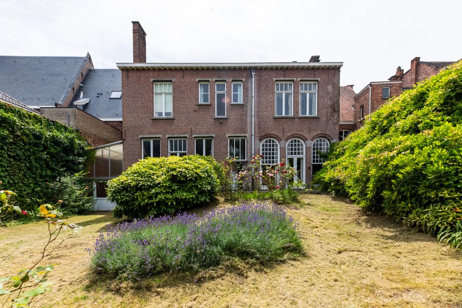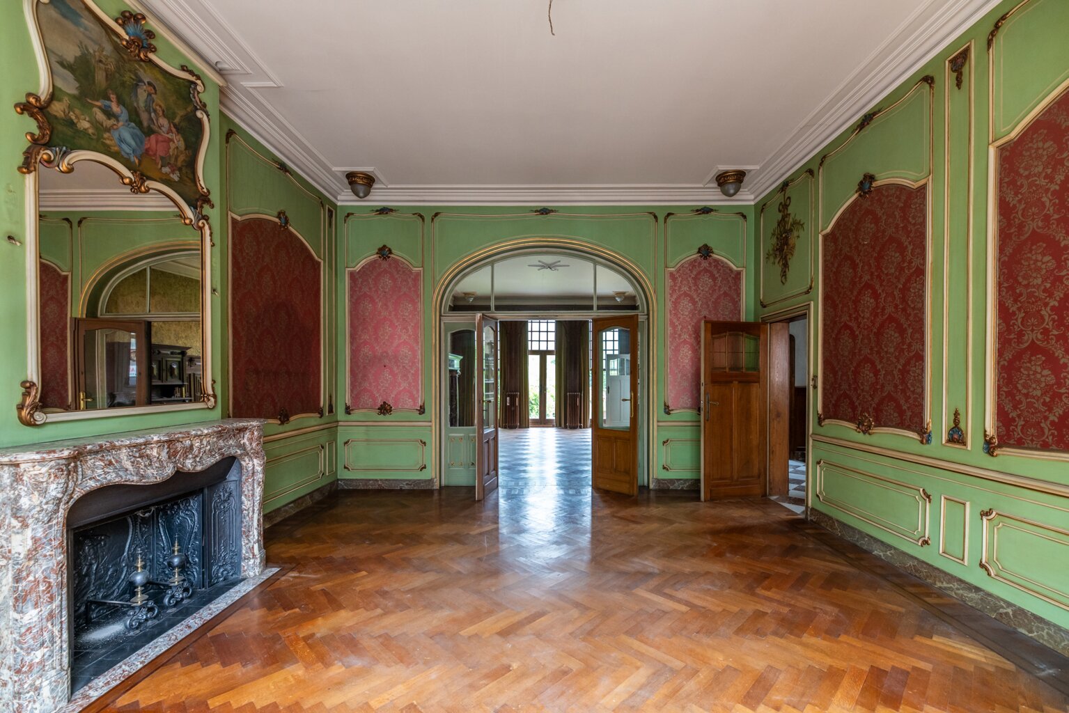 Achter de voorgevel van 18 meter breed schuilt een volledig onderkelderd pand met een enorme grandeur. De statige inkom, afgewerkt met rode marmer, zet meteen de toon. De prachtige deur in glas-in-lood brengt ons naar de impressionante hal met originele houten trap. Gelijkvloers met vijf grote kamers, waarvan twee riant, met bladgoud, muurschilderingen, ornamenten, sierhaard en visgraatparket. Dankzij het volume en de vele grote raampartijen baden alle ruimtes in het licht. De verbluffende tuin van maar liefst ca. 2420 m² lijkt uit een sprookje te komen: een oase van rust, vijver inbegrepen.