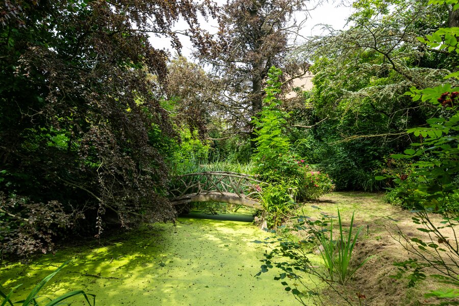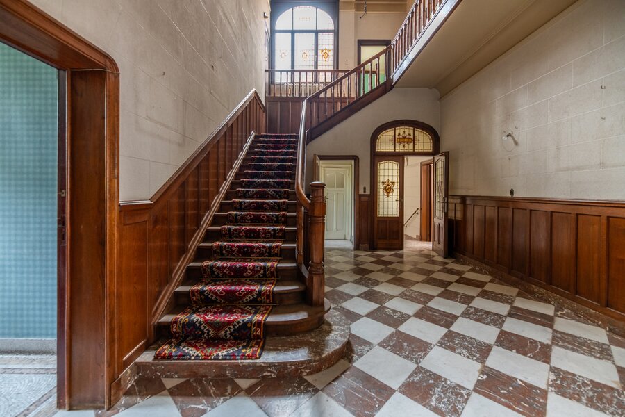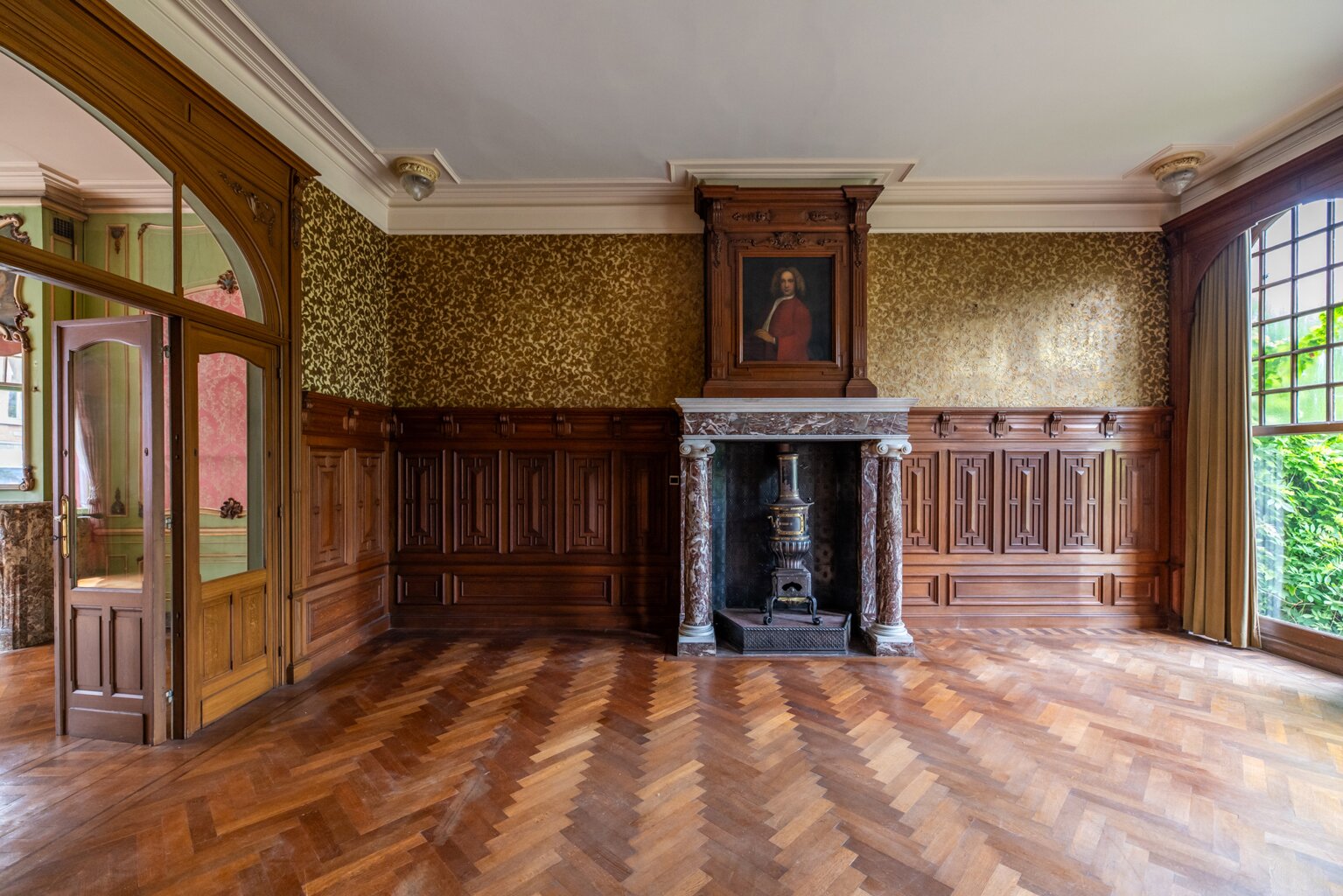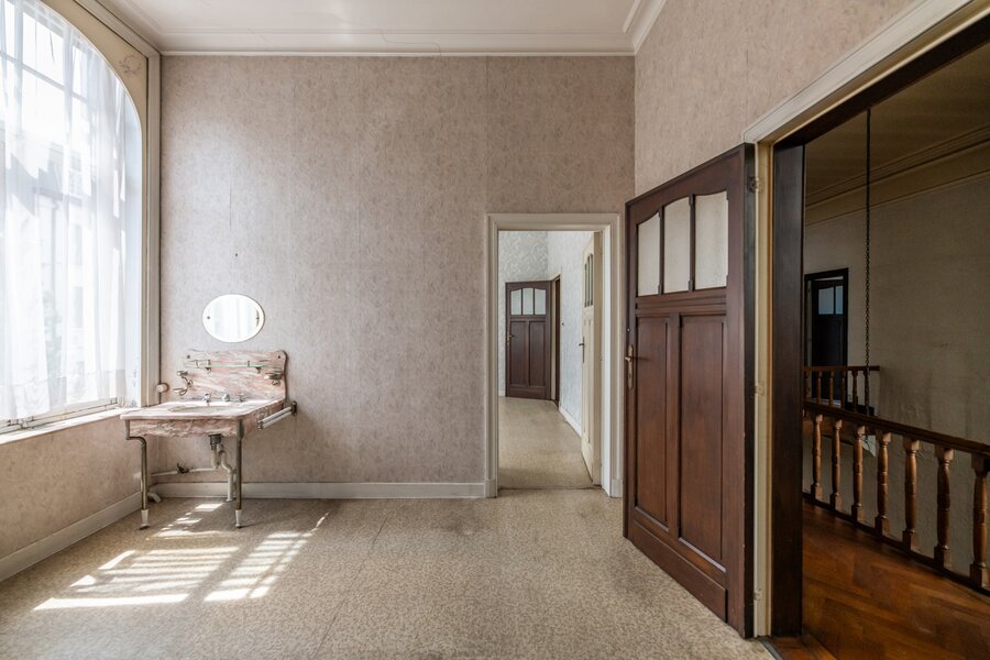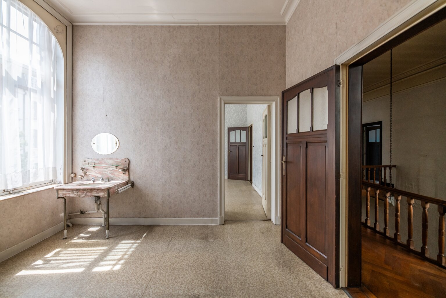 Achter de voorgevel van 18 meter breed schuilt een volledig onderkelderd pand met een enorme grandeur. De statige inkom, afgewerkt met rode marmer, zet meteen de toon. De prachtige deur in glas-in-lood brengt ons naar de impressionante hal met originele houten trap. Gelijkvloers met vijf grote kamers, waarvan twee riant, met bladgoud, muurschilderingen, ornamenten, sierhaard en visgraatparket. Dankzij het volume en de vele grote raampartijen baden alle ruimtes in het licht. De verbluffende tuin van maar liefst ca. 2420 m² lijkt uit een sprookje te komen: een oase van rust, vijver inbegrepen.