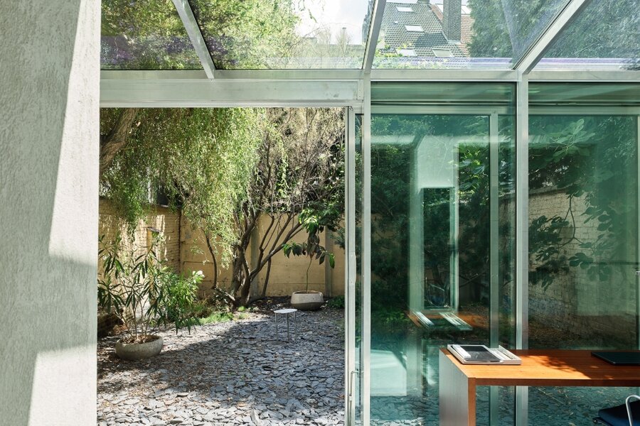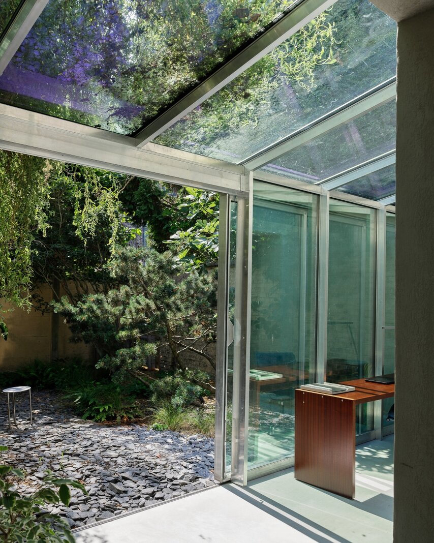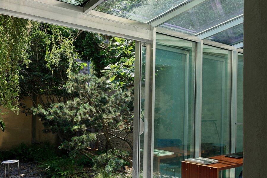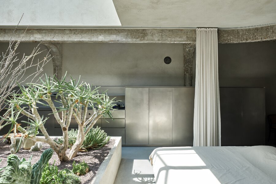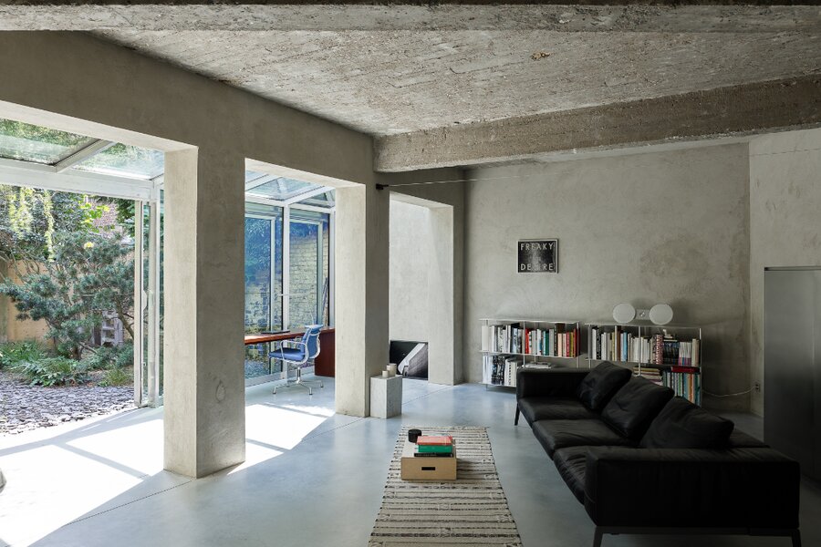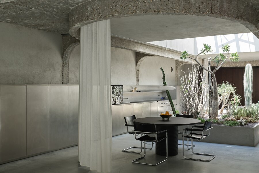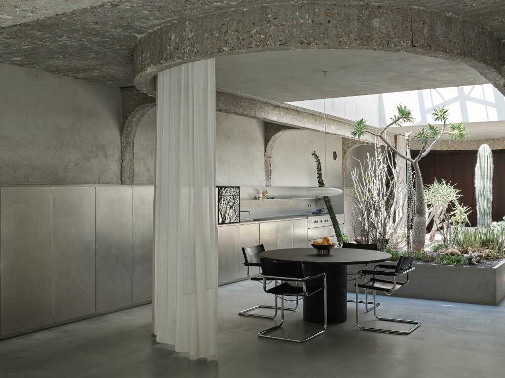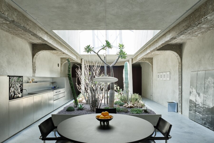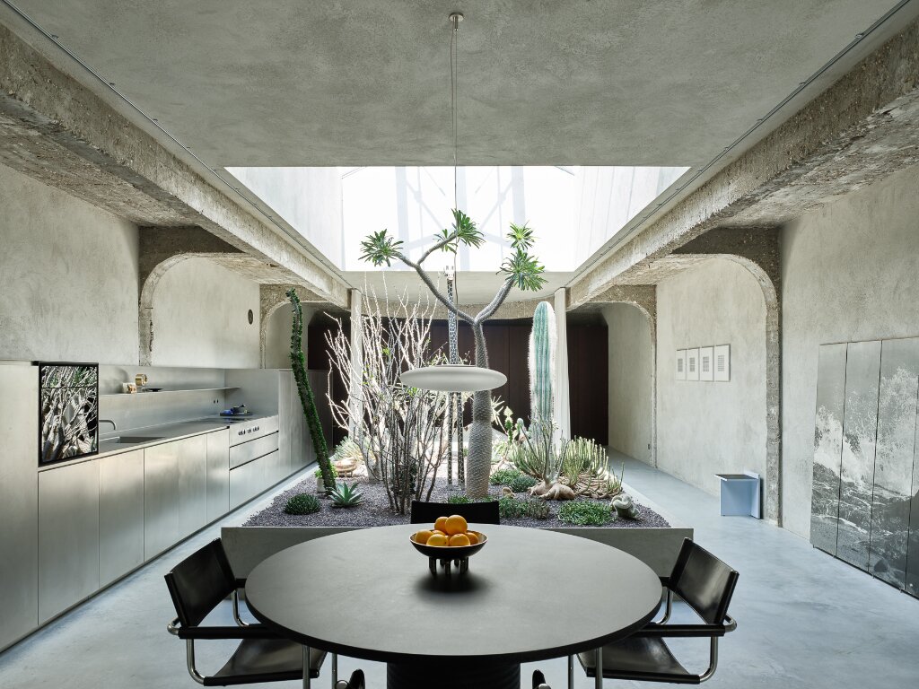 Het volledige interieur is opgebouwd rond een binnentuin met cactussen onder een enorme lichtkoepel, waarbij de ramen uitkijken op de tuin achteraan de woning. Dit creëert een ongelooflijk intieme maar tegelijk ruwe en brutalistische sfeer in het stadscentrum, met een nauwe verbondenheid met de natuurlijke elementen.