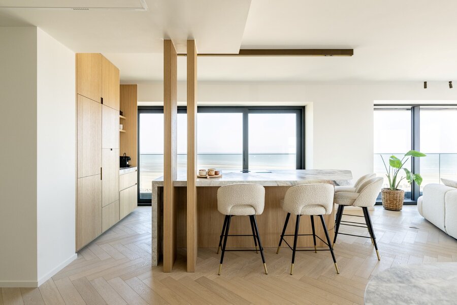 Ruime inkomhal met gastentoilet. De zeer grote, lichtrijke leefruimte biedt een open keuken, stijlvolle zithoek en eetruimte — allemaal met frontaal zeezicht én een panoramisch uitzicht over het hinterland.