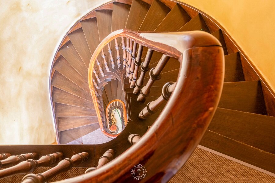 Via een prachtige wenteltrap kom je op de eerste verdieping waar aan de voorzijde een bureel, een badkamer en kitchenette aanwezig zijn.