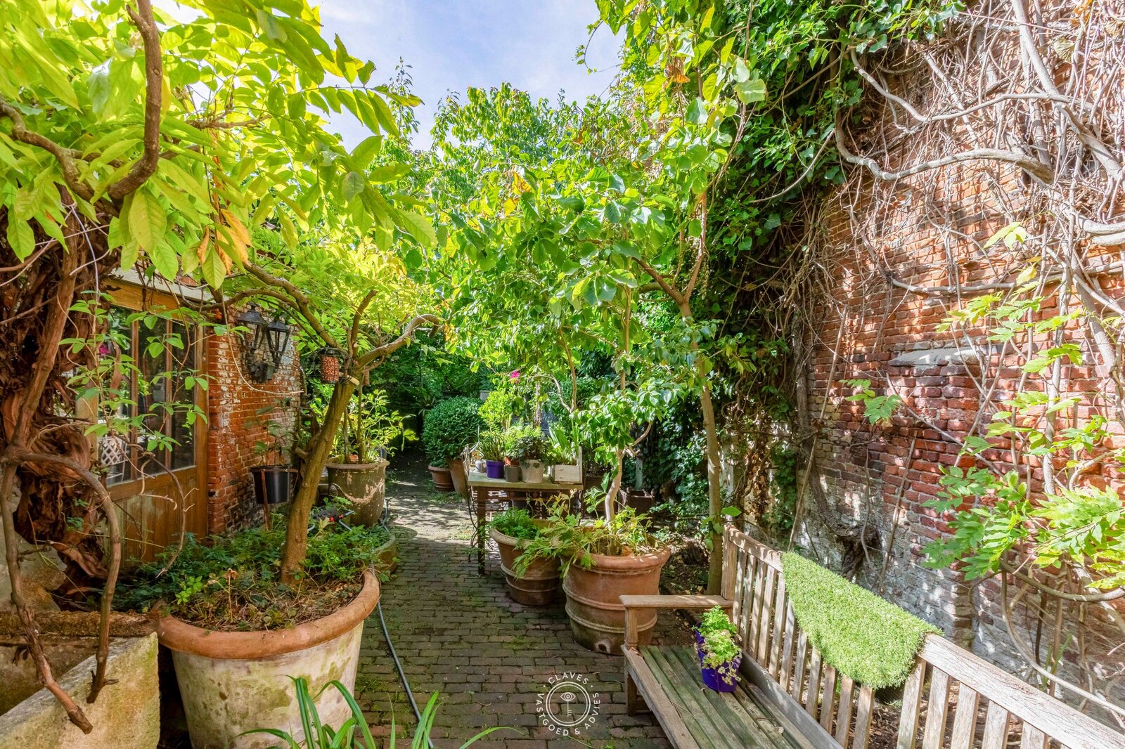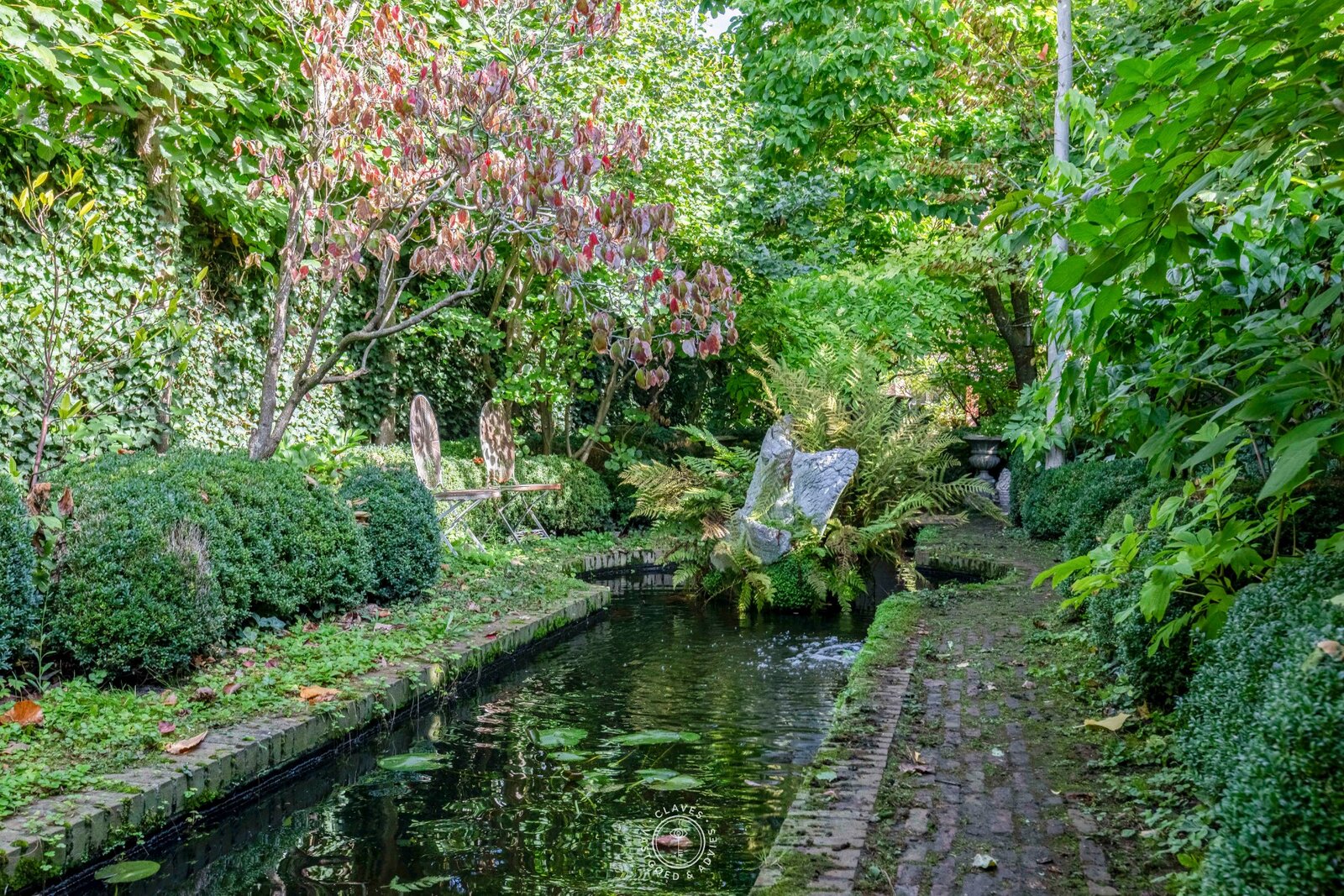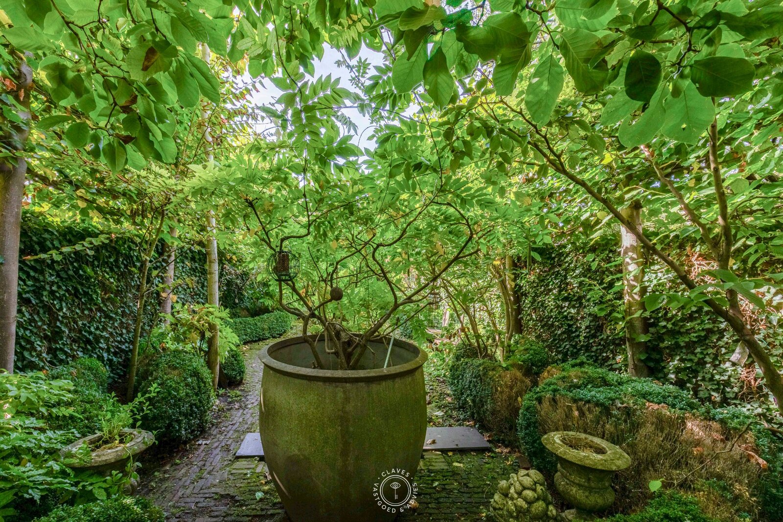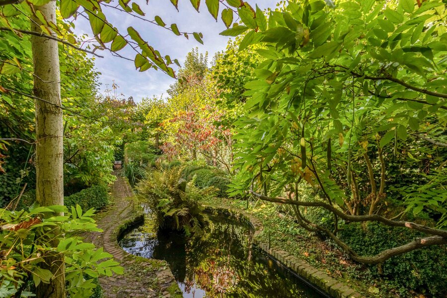 De intieme wonderlijke stadstuin met vijver en uitzonderlijk plantgoed vormt een groene oase van rust, midden in de stad.