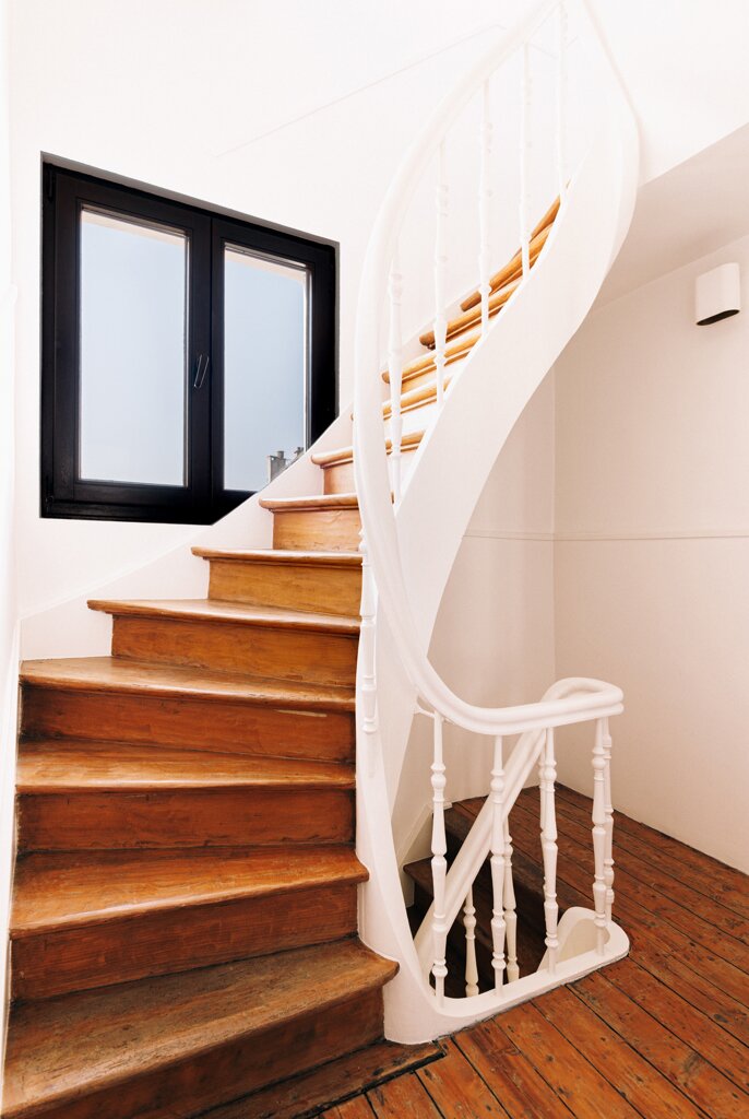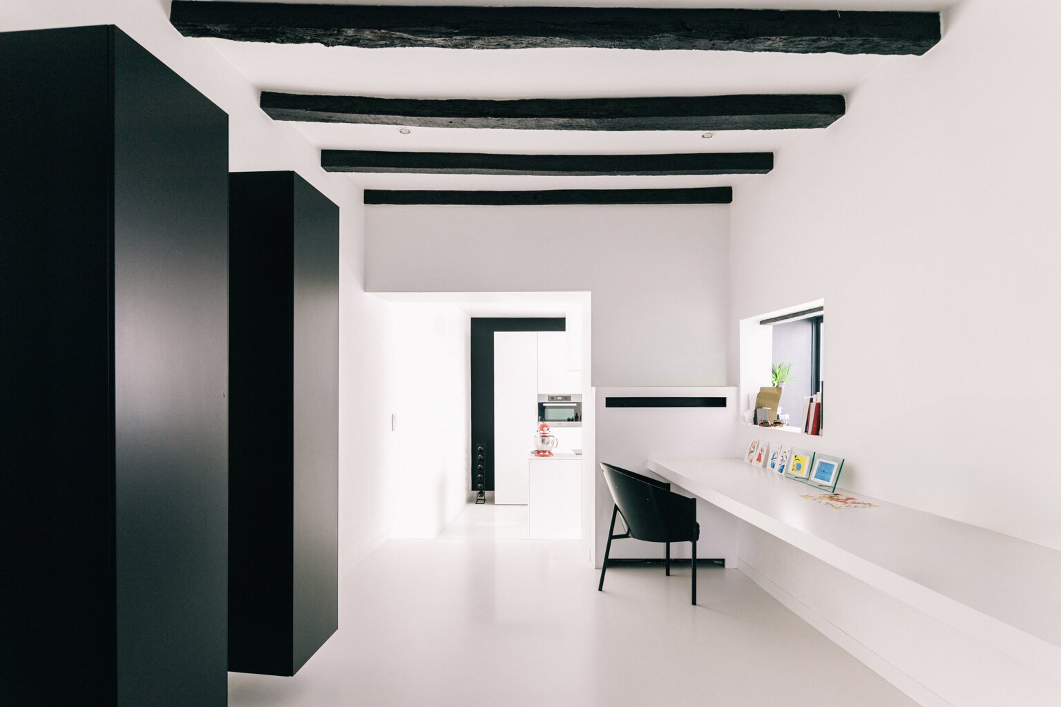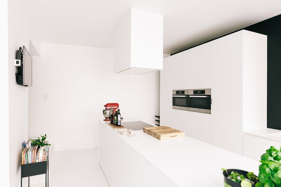 Het huis zelf is instapklaar en straalt rust en karakter uit. Op de eerste verdieping baadt de ruime leefruimte in het licht. De strakke, lichte PU-vloeren vormen een mooi contrast met de warme houten balken. De open keuken is uitgerust met kwalitatieve toestellen en een Corian werkblad, en loopt naadloos over in een lichtrijke leefruimte met ingebouwd bureau – ideaal voor thuiswerk in een inspirerende setting.