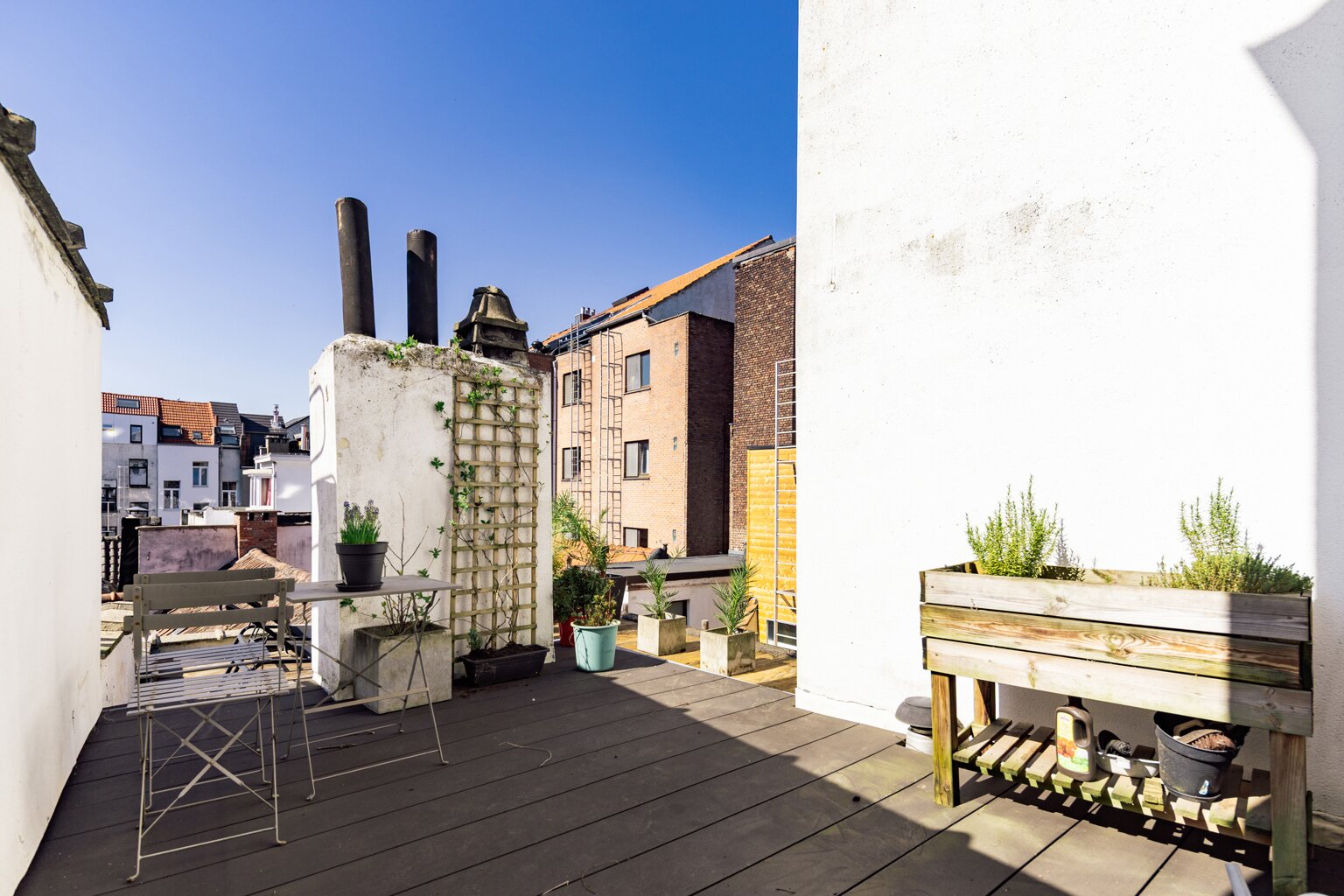Een verdieping hoger ligt een eerste giga slaapkamer met ensuite badkamer. Indien gewenst, kan hier met gemak een extra slaapkamer worden gecreëerd. Onder het dak bevindt zich nog een ruime slaapkamer met aansluitende badkamer voorzien van inloopdouche en ligbad. Grote troef is ook de buitenruimte, een perfecte mix van schaduwruimte en gezellige hoekjes om te zonnen. Tot slot is er nog een grote kelder.