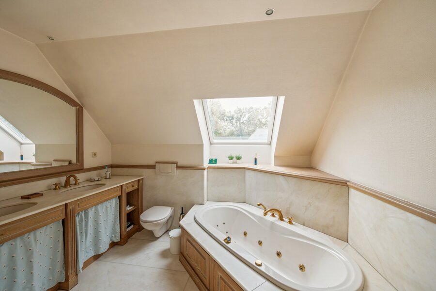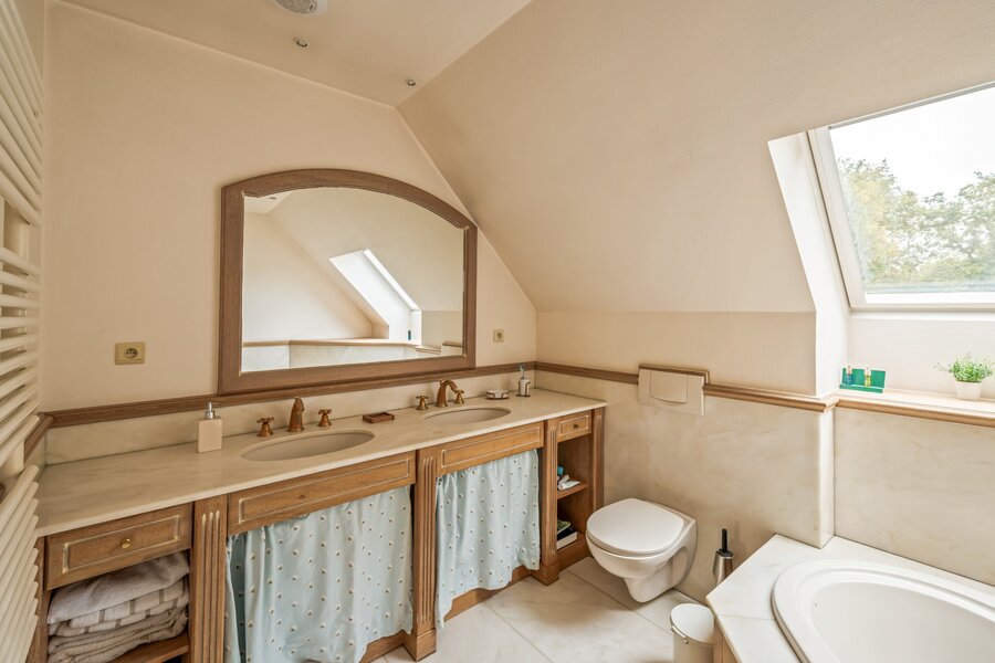 Op de verdieping bevinden zich vier ruime slaapkamers, allemaal voorzien van ingebouwde kasten. De luxueuze badkamer is afgewerkt met Carrara-marmer en uitgerust met jacuzzi en dubbele wastafel. Daarnaast is er nog een aparte douchekamer. Via de vierde slaapkamer is de zolder van circa 16 m² toegankelijk — ideaal als extra opslag.