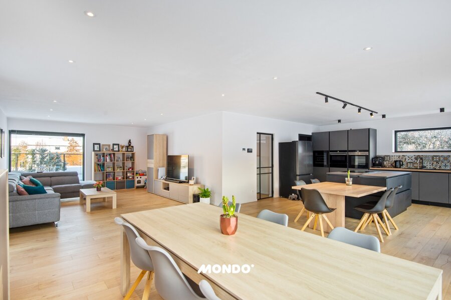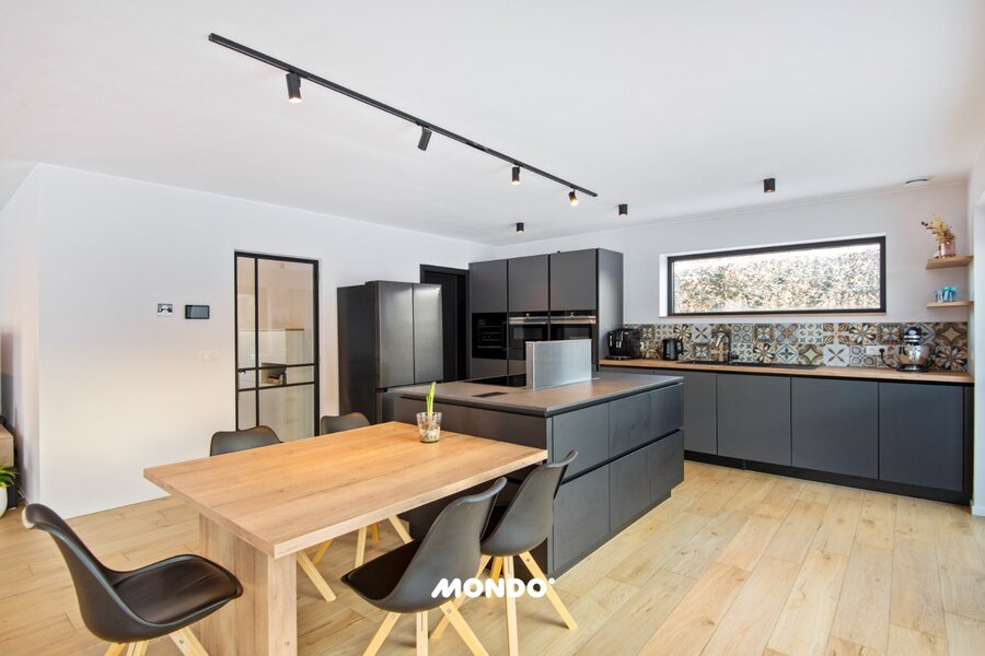 Indeling: inkomhal met gastentoilet en op maat gemaakte inbouwkasten, lichtrijke leefruimte met eetplaats en hyper uitgeruste keuken met kookeiland én wijnkoeler, grote raampartijen en aangrenzende berging/wasplaats.